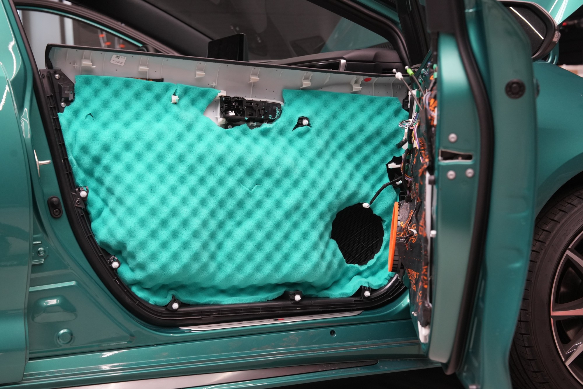 A konečně poslední vrstvou je Comfortmat Softwave Expert o tloušťce 15 mm, který jsme již aplikovali i ve druhé vrstvě na střeše. Tato flexibilní pěna s tvarovou pamětí se lepí na plastové čalounění dveří z důvodu zamezení skřípání a vrzání nejen plastů, ale i drátů a dalších komponent uvnitř dveří a dodatečně i sníží hluk této oblasti. Oproti klasické verzi materiálu Soft Wave je tato tyrkysová varianta vyrobena z hustější a účinnější polyuretanové pěny, která odhlučnění dveří posune na ještě vyšší úroveň. Stejný postup volíme i u zadních dveří.