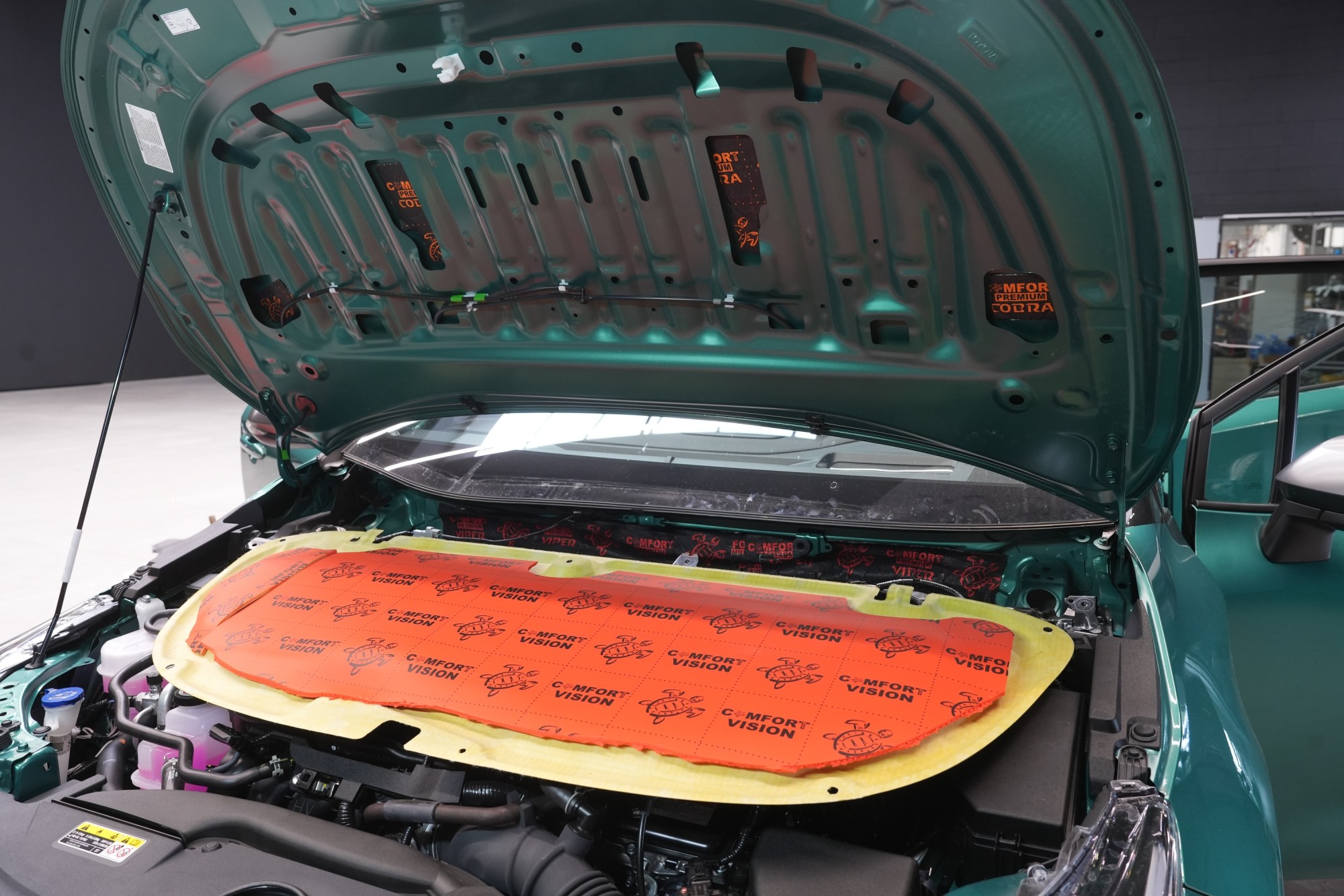 Nezapomínáme ani na kapotu, na kterou v první vrstvě aplikujeme opět lehký antivibrační materiál Comfortmat Cobra. Tím kapotu zpevníme, zamezíme vibracím, které se přenáší do dalších částí vozu a zmizí i typický plechový zvuk při zavření kapoty. Na originální kryt kapoty následně aplikujeme zvukově i tepelně izolační materiál Comfortmat Vision, který sníží hluk motoru a to při zachování původního vzhledu motorového prostoru. Instalace se blíží ke konci, interiér vozu pečlivě opětovně složíme a předáme vozidlo jeho nedočkavému majiteli.