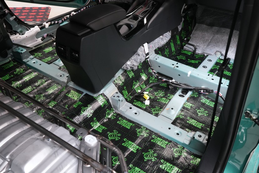 Podlaha vozu je první částí, na kterou se při montáži zaměřujeme. Právě zde vzniká nejvíce vibrací a nízkofrekvenčního hluku, proto vyžaduje precizní ošetření. Používáme materiál Comfortmat Extreme, jenž při tloušťce 3,5 mm dosahuje hodnoty MLF 0,63 – parametru, který jej řadí na samotný vrchol ve své třídě. Díky tomu dokáže účinně eliminovat i výrazné vibrace a nízkofrekvenční hluk od podvozku.