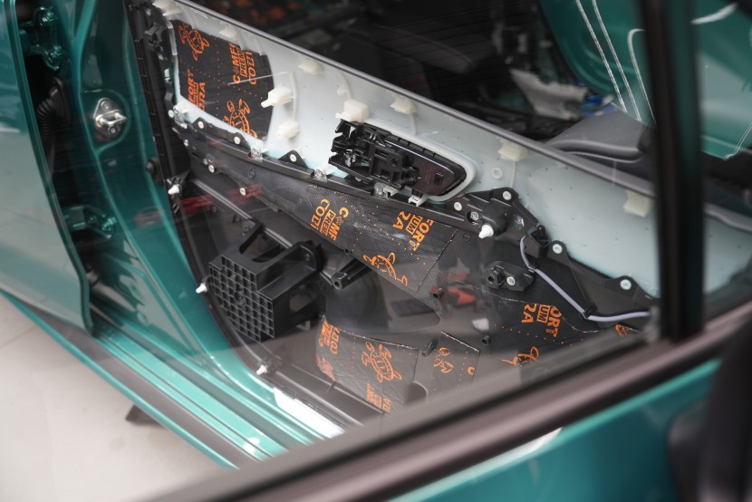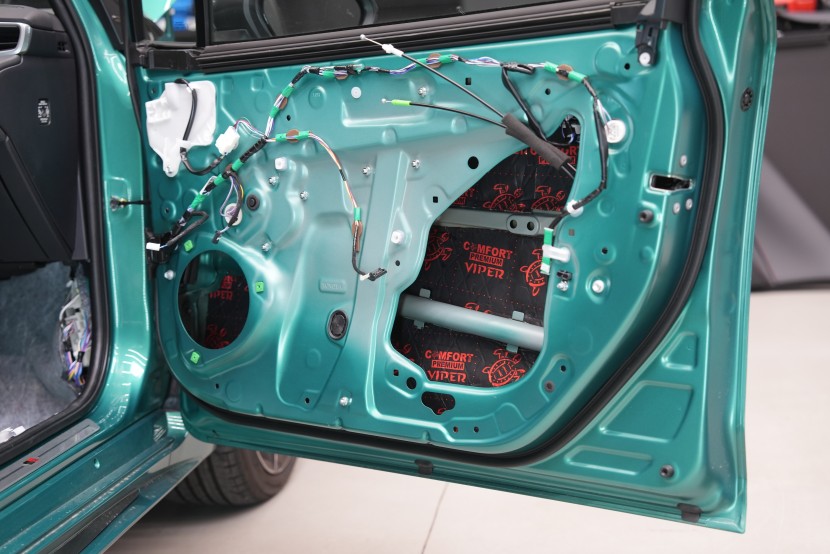Dveře odhlučňujeme celkem v 5 vrstvách. V rámci balíčku Expert Plus volíme silnější antivibrační materiál na vnější plech dveří, konkrétně Comfortmat Viper o tloušťce 3 mm. Ten s přehledem zlikviduje vibrace, zamezí pronikání nízkofrekvenčního hluku a zpevní velmi tenký plech dveří. I přes vyšší tloušťku materiál disponuje velmi nízkou hmotností, je samozřejmě voděodolný a má mimo jiné antikorozní vlastnosti.