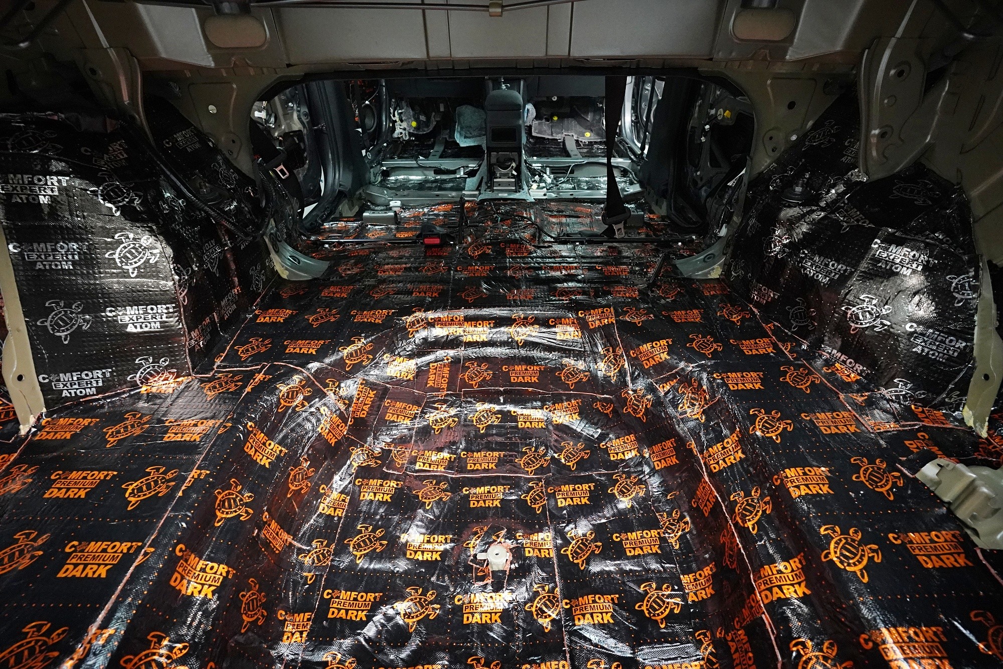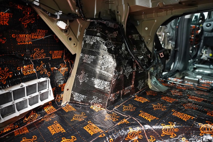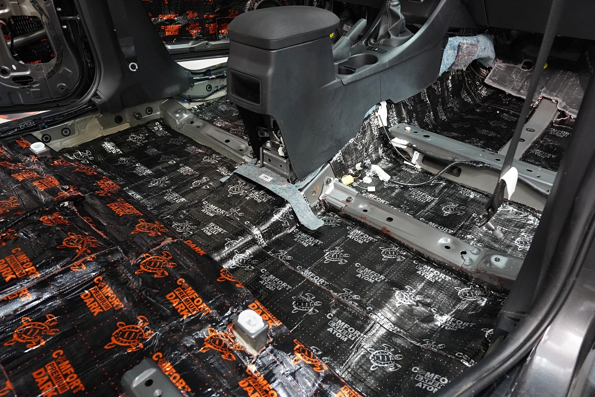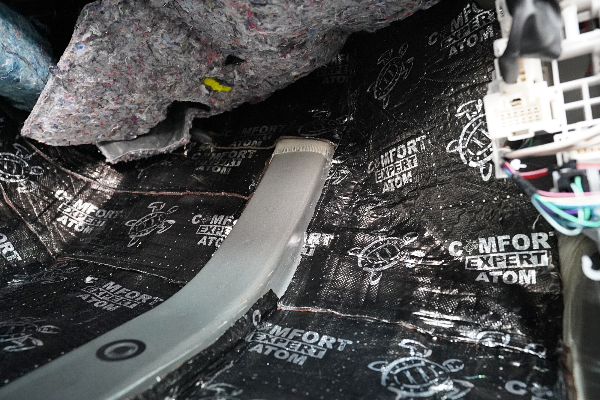 Atom aplikujeme na všechna dostupná místa, abychom umožnili izolaci maximálního množství vibrací a nízkofrekvenčního hluku. V přední části podlahy se dostáváme až pod palubní desku, díky čemuž důkladně odhlučníme i přední podběhy z vnitřní části vozu, kde je přístup k větší ploše karoserie. Podlahu odhlučňujeme vysoce účinným antivibračním materiálem o tloušťce 4 mm a zvukově izolačním materiálem v druhé vrstvě o tloušťce 7 mm. Celkem tedy 11 mm zvukové izolace, což má za následek důkladné zamezení hluku od předních pneumatik i bez aplikace z vnější strany.