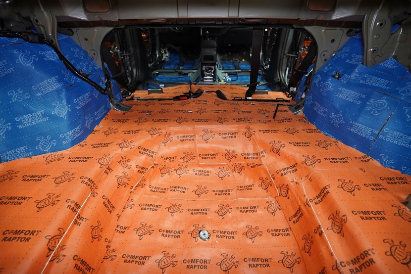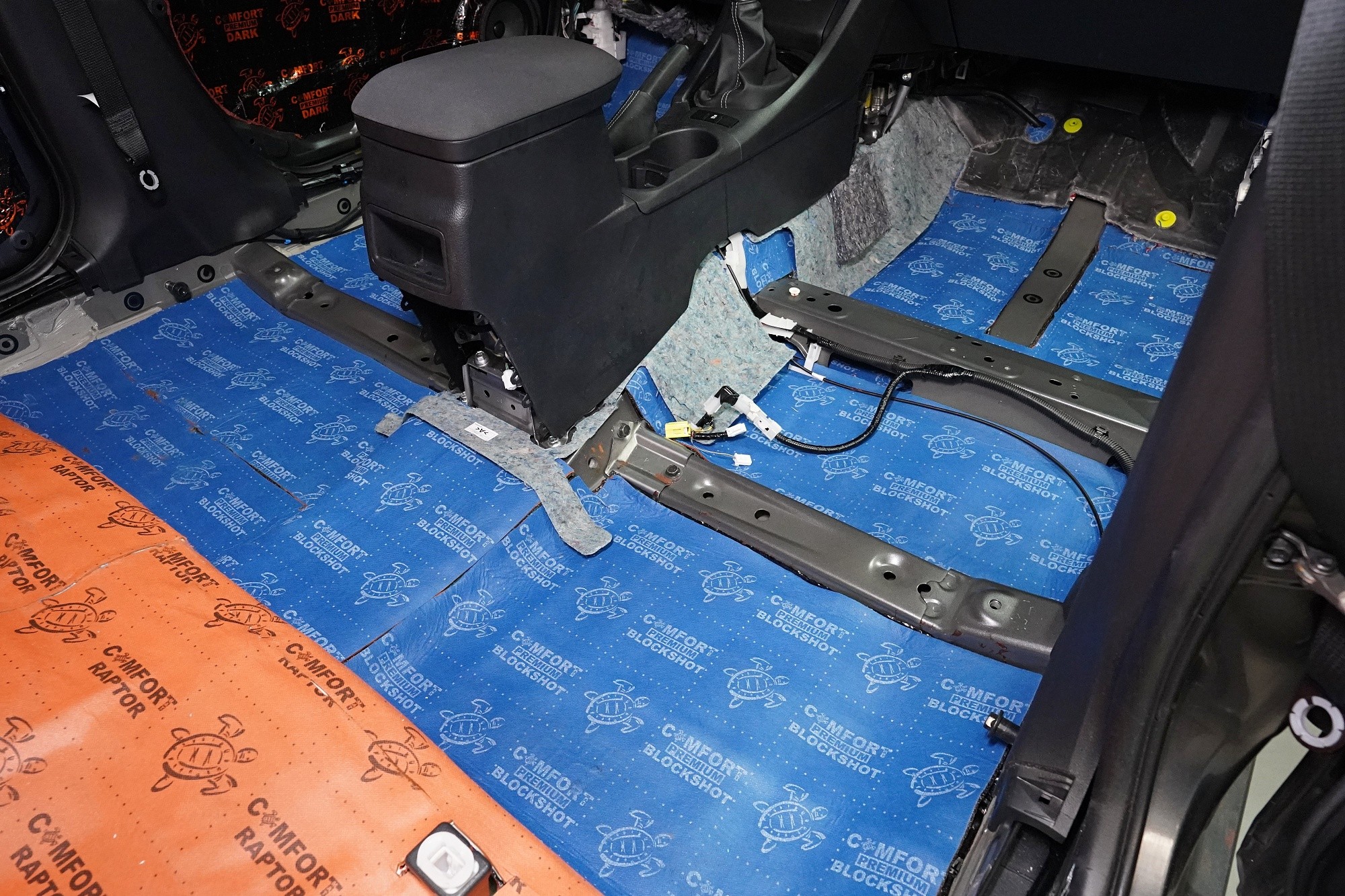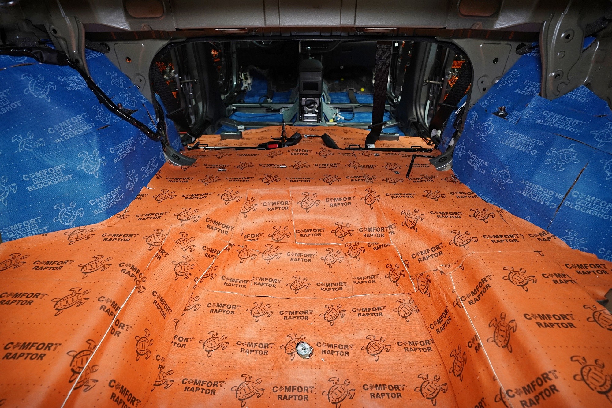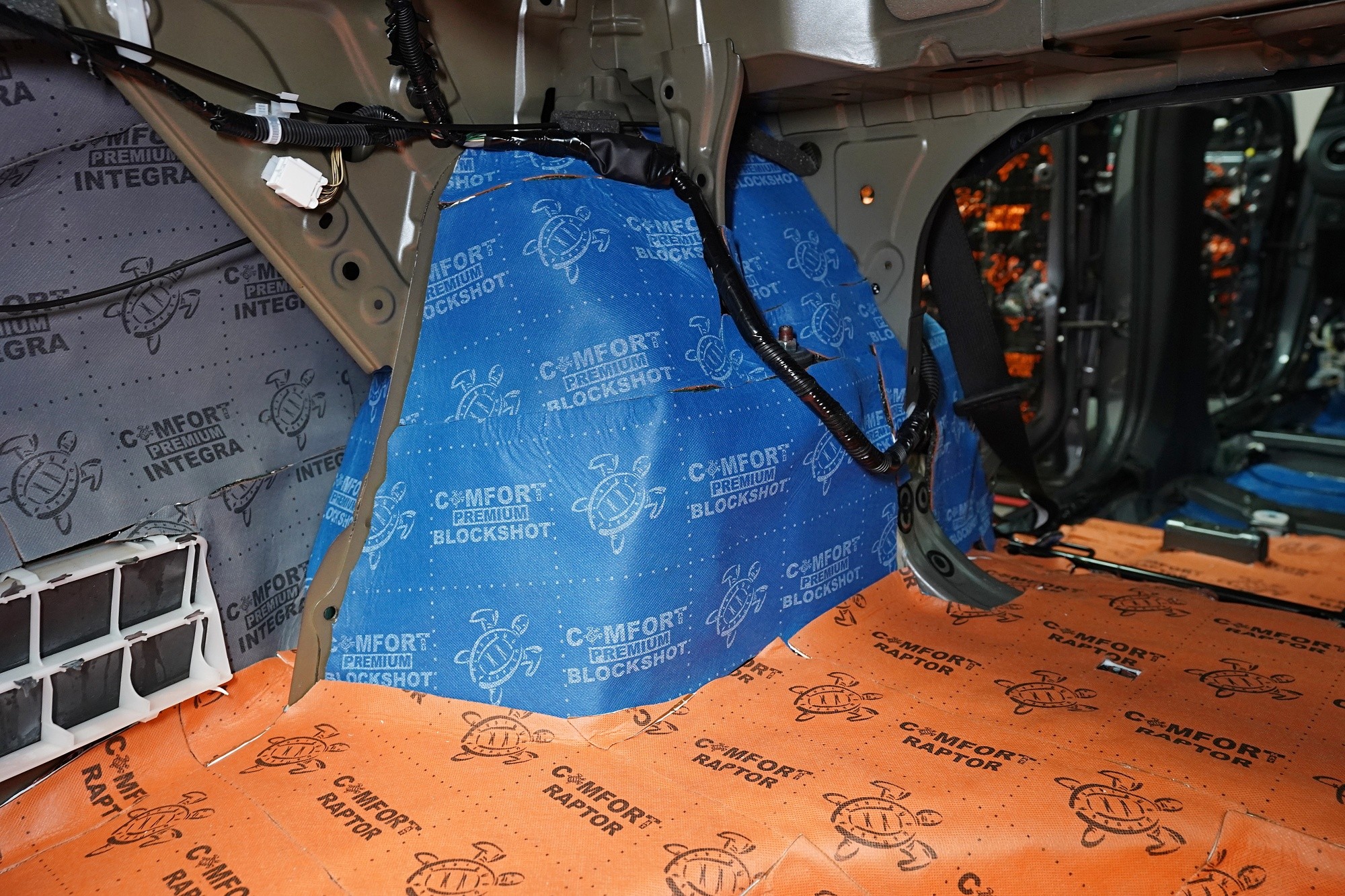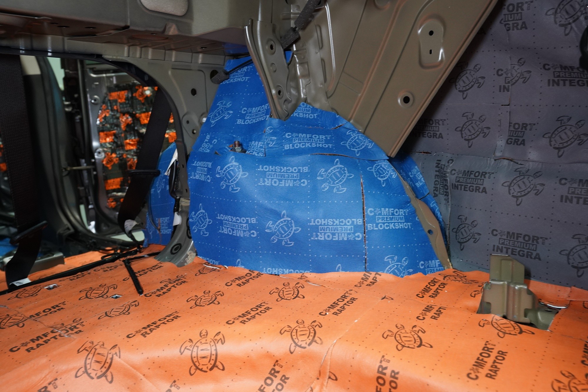 Druhou vrstvu na podlaze u balíčku Premium tvoří membránový materiál Comfortmat Blockshot, který při tloušťce 7 mm vyniká vysokou schopností zvukové izolace až 32 dB. Je to díky jeho vícevrstvému složení s 2 mm silnou protihlukovou membránou, která umožní takto vysokou účinnost. Blockshot nahrazuje dvě vrstvy odhlučnění a odfiltruje hluk od vozovky, pneumatik, ale i převodovky a zavěšení kol. Na prostor pod zadními sedačkami aplikujeme tenký membránový materiál Comfortmat Raptor o tloušťce pouhých 4 mm, přitom účinností až 30 dB!