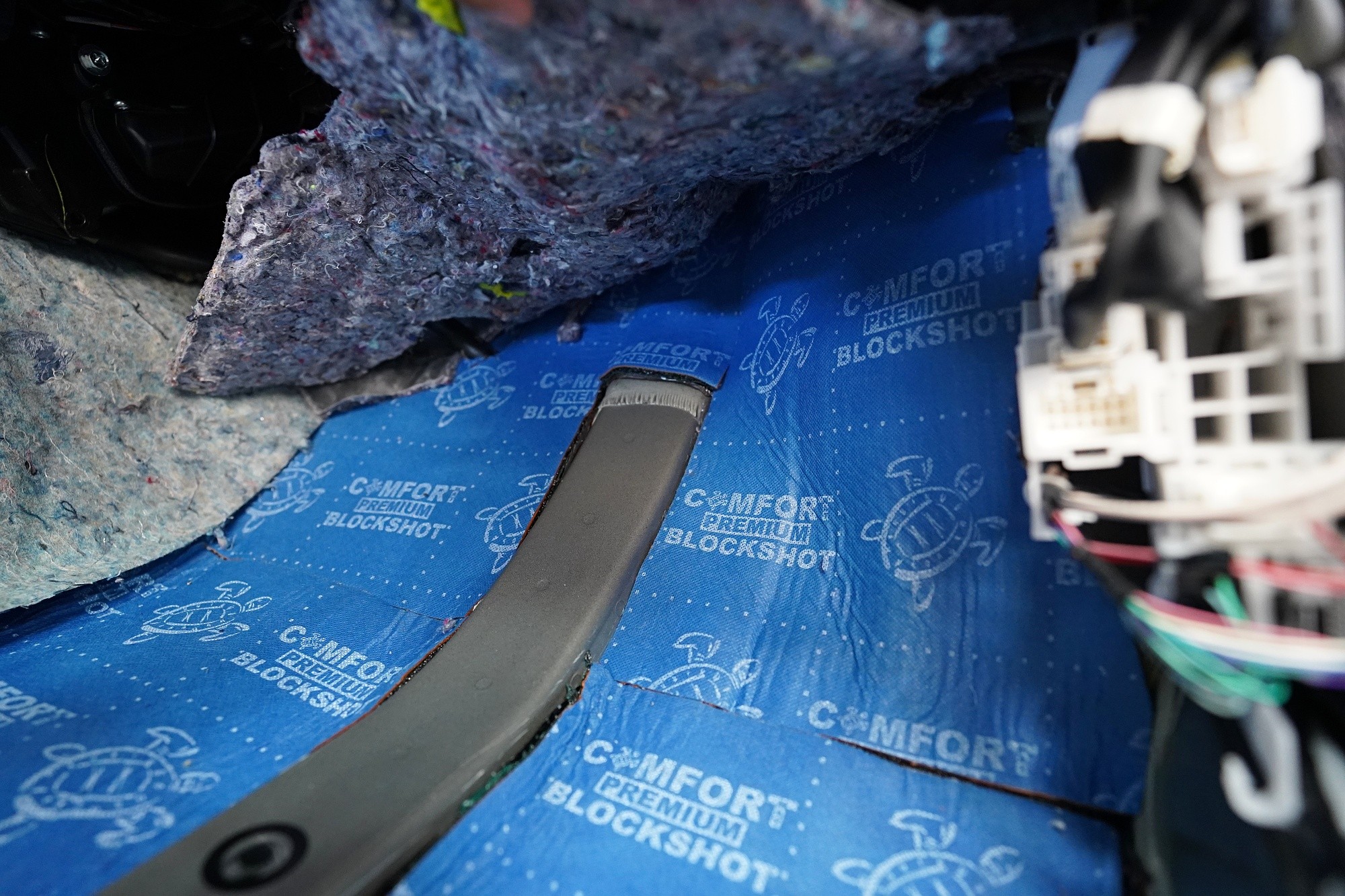 Zadní podběhy opatříme stejným zvukově izolačním materiálem, jaký jsme použili i na odhlučnění podlahy, konkrétně tedy membránovým materiálem Comfortmat Blockshot. Blockshot se vyznačuje při své tloušťce 7 mm vysokou schopností zvukové izolace až 32 dB, což je již velmi solidní hodnota pro odhlučnění této vibracemi i hlukem velmi zatížené oblasti. Nezapomínáme ani na blatníky, na které aplikujeme lehký membránový materiál Comfortmat Integra s účinností 28 dB a velmi nízkou hmotností. Tento materiál využíváme i při odhlučnění dveří.