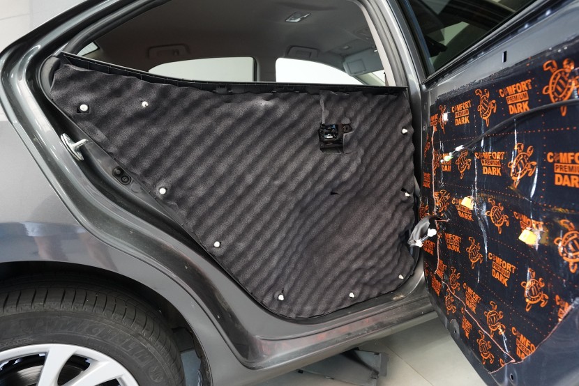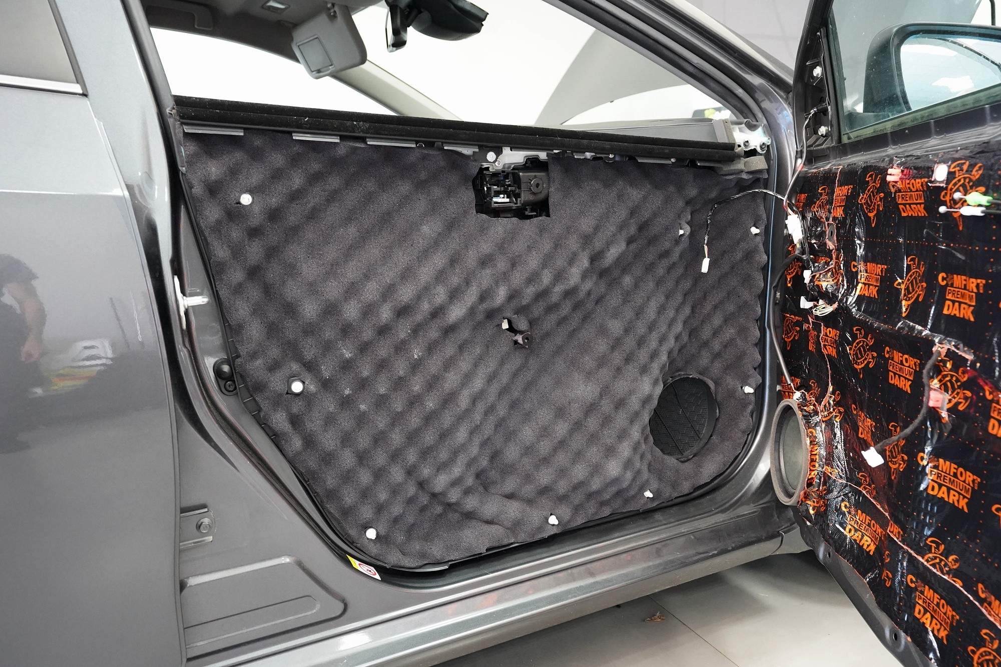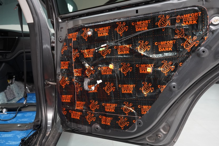 Dveře odhlučňujeme celkem ve 4 vrstvách. V rámci balíčku Premium volíme na vnější plech dveří lehký antivibrační materiál Comfortmat Dark D2 o tloušťce 2,3 mm. Ten zlikviduje vibrace a zpevní tenký plech dveří. Materiál disponuje velmi nízkou hmotností, je samozřejmě zcela voděodolný a má mimo jiné antikorozní vlastnosti. Díky svému složení z odlehčených materiálů nezatěžuje dveře a umožní správnou funkci dveřních pantů i v budoucnu.