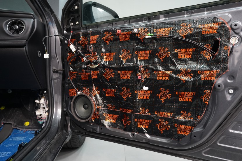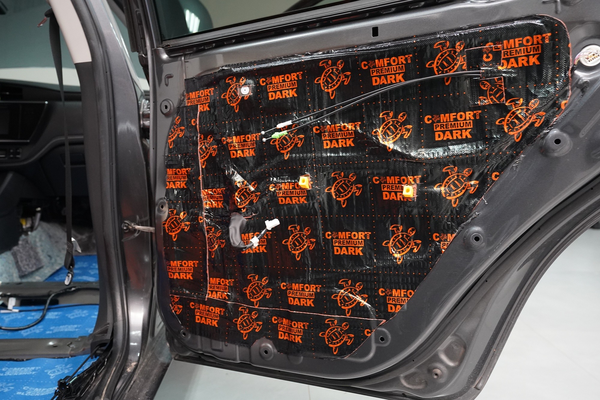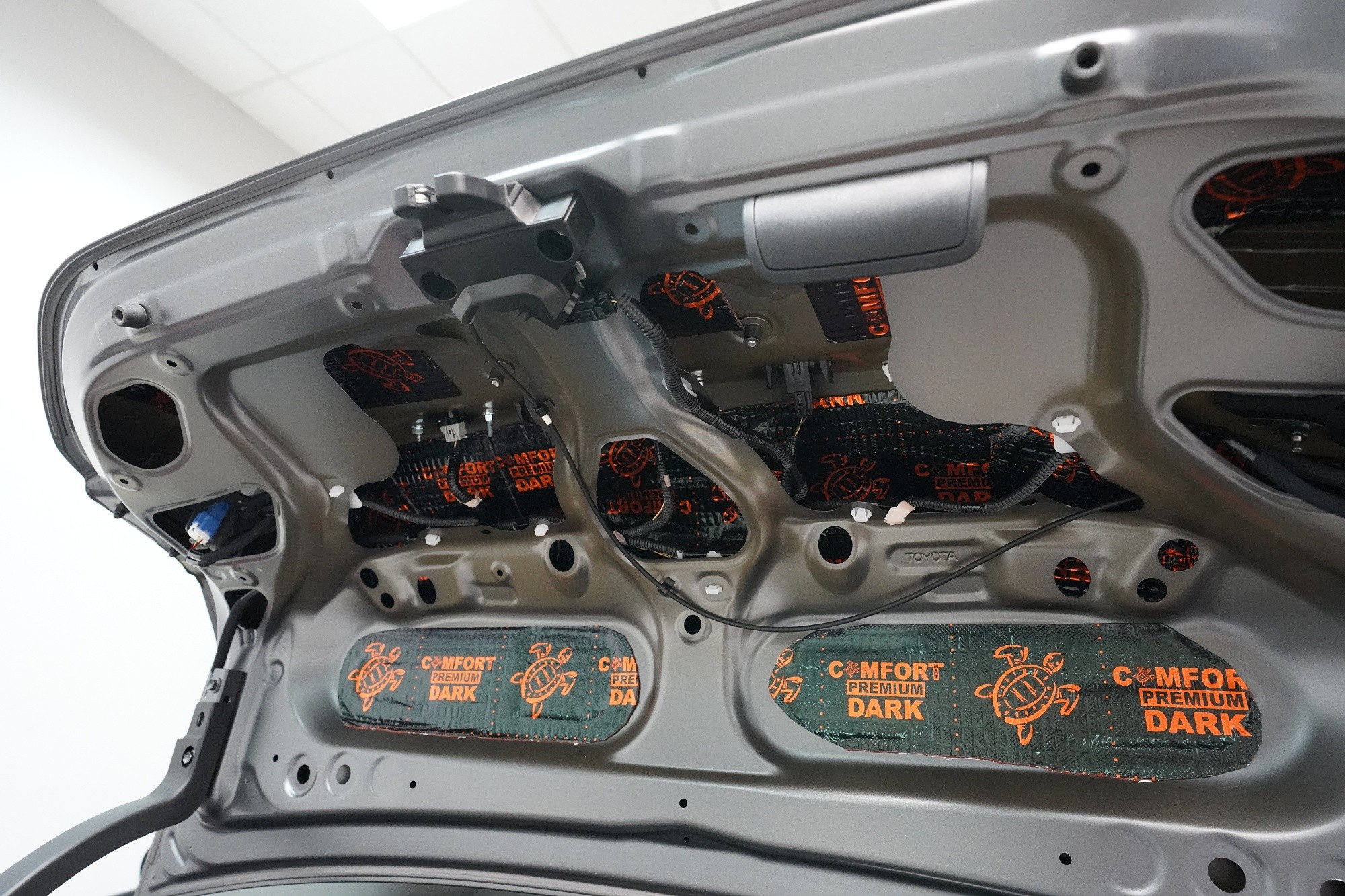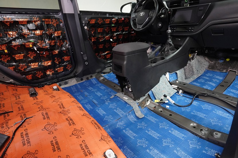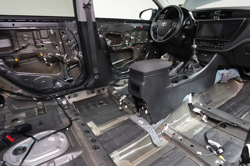 Odhlučnění vozu Toyota Corolla. Již jedenáctá generace tohoto oblíbeného modelu trpí známými problémy této japonské automobilky, mezi které patří zejména nedostatečná ochrana proti vibracím a prakticky nulová zvuková izolace. To se projevuje výrazným hlukem od pneumatik, vody i kamínků v podbězích, hlukem větru při vysokých rychlostech, ale i skřípáním plastu v důsledku tužšího odpružení. To vše snižuje jízdní komfort tohoto vozu, my však máme skvělý recept jak tomu zamezit a zařadit Toyotu Corollu z hlediska zvukové izolace do prémiové třídy. Po našem odhlučnění zmizí vibrace od motoru, převodovky nebo odpružení a také vzduchem přenášený hluk různých frekvencí z oblasti podlahy, předních i zadních podběhů a samozřejmě i dveří a zadní části vozu. Se zákazníkem jsme se tedy domluvili na našem nejžádanějším balíčku odhlučnění Premium. Konkrétně se zaměříme na přední, zadní i páté dveře, podlahu, zavazadlový prostor, přední a zadní podběhy ze strany vozu a kapotu. Pro odhlučnění používáme špičkové antivibrační a zvukově izolační materiály Comfortmat, včetně několika nedávno zveřejněných novinek. Na instalaci pracují zároveň tři naši technici, kteří montáž zvládnou v rámci 1 pracovního dne. Všechny důležité informace se dozvíte v naší rozsáhlé fotoreportáži.