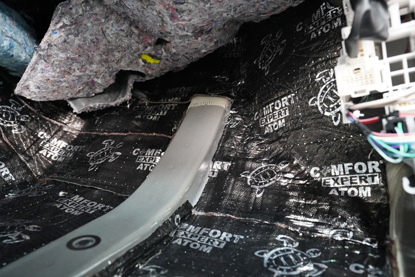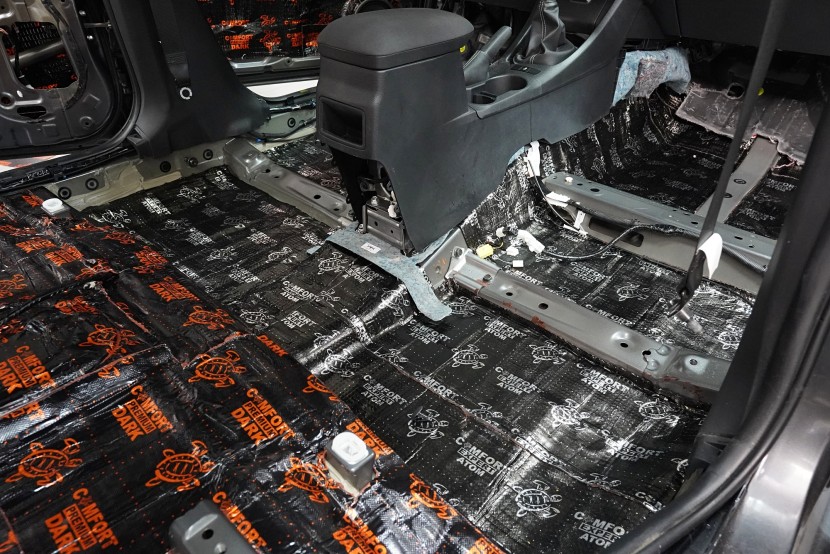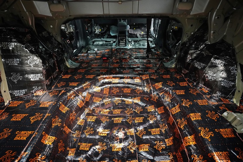 Začínáme podlahou, jejíž odhlučnění je kvůli enormním vibracím i výraznému nízkofrekvenčnímu hluku zásadní pro celkové odhlučnění vozu. Jako první vrstvu aplikujeme špičkový antivibrační materiál Comfortmat Atom z nejvyšší řady Expert, který je určený zejména pro profesionální instalační centra. Materiál je složený ze dvou vrstev s celkovou tloušťkou 4 mm a s akustickým ztrátovým činitelem (MLF) o extrémní hodnotě 0,60 jednotek. To umožní excelentní zamezení vibrací i výrazné snížení nízkofrekvenčního hluku.
