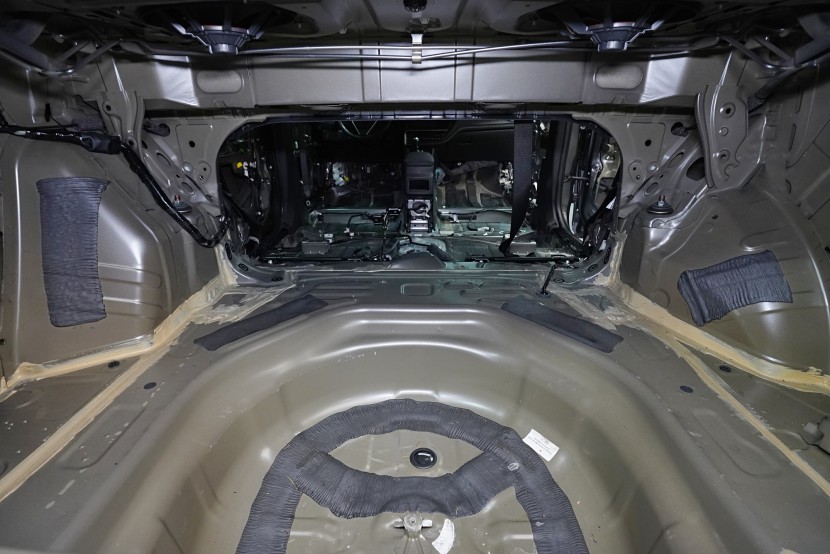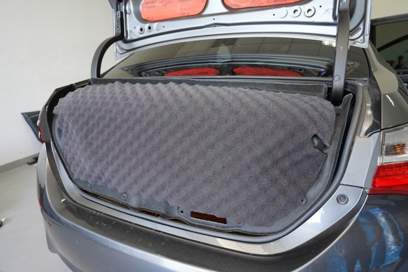 Podobným způsobem odhlučňujeme zavazadlový prostor. I dno kufru je velmi zatěžováno vibracemi a hlukem a musíme tedy volit odpovídající materiály. Na dno kufru aplikujeme stejný materiál jako pod zadní sedačky, tedy Comfortmat Dark D3 o tloušťce 3 mm a MLF 0,41. Ten nejen absorbuje veškeré vibrace, ale sníží i nízkofrekvenční hluk, který je typický pro tuto oblast.