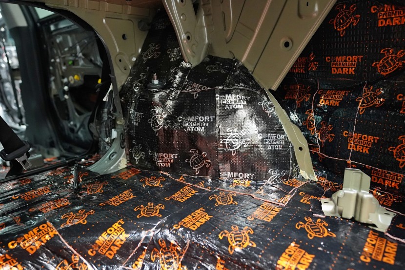 Atom aplikujeme po podlaze i na zadní podběhy. Obě tyto oblasti jsou extrémně zatížené vibracemi a hlukema je nezbytné volit vysoce účinné materiály. Comfortmat Atom s tloušťkou 4 mm a MLF 0,60 jednotek doslova zlikviduje vibrace a nízkofrekvenční hluk od pneumatik. A konečně na blatníky aplikujeme u balíčku Premium ultralehký antivibrační materiál Comfortmat Dark D2 o tloušťce 2,3 mm a MLF 0,35 jednotek, což je pro tuto oblast dostačující.