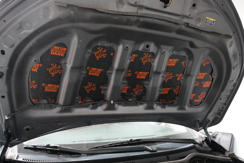Nezapomínáme ani na kapotu, na kterou v první vrstvě aplikujeme opět lehký antivibrační materiál Comfortmat D2. Tím kapotu zpevníme, zamezíme vibracím, které se přenáší do dalších částí vozu a zmizí i typický plechový zvuk při zavření kapoty. Originální kryt kapoty u tohoto vozu chyběl a majitel si nepřál dávat druhou vrstvu na kapotu, takže jsme zůstali pouze u první vrstvy.