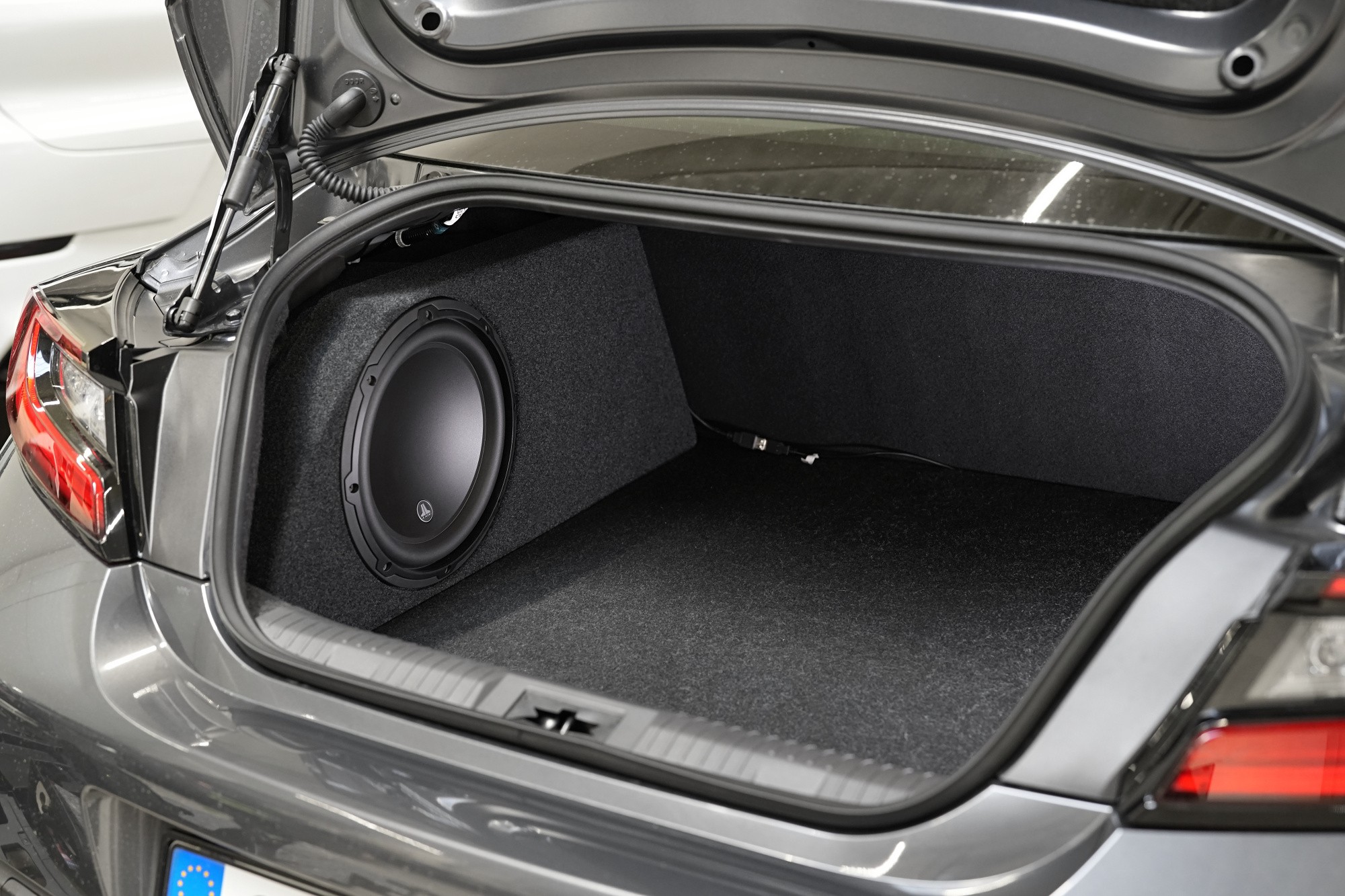 Na levý bok zavazadlového prostoru jsme umístili kompaktní OEM ozvučnici, kterou jsme osadili výkonným subwooferem JL Audio modelové řady W3. Ten se postará o kvalitní podání nízkých kmitočtů a to při minimálním objemovém omezení zavazadlového prostoru.