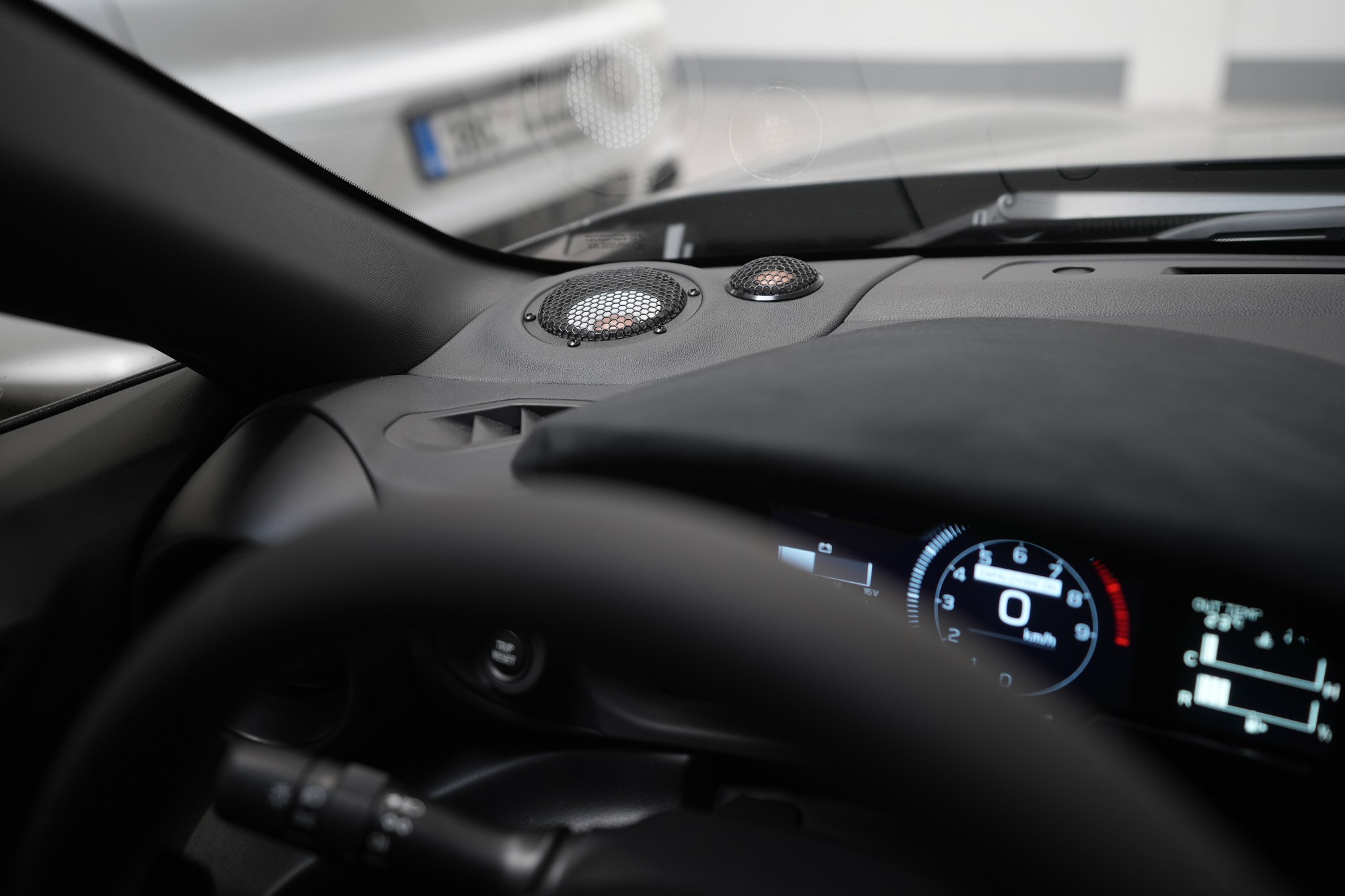 Toyota GR86 je krásný a výjimečný automobil, který si zaslouží adekvátní ozvučení. Tovární audio systém však zrovna nenadchne ani běžného posluchače natož náročného audiofila. Majitel tohoto krasavce patří mezi hudební nadšence a proto se na nás obrátil s žádostí o vysoce kvalitní ozvučení s pokud možno minimálními zásahy do interiéru vozu. Po konzultaci jsme se společně rozhodli pro drobnou úpravu palubní desky s přiznanými středovými a výškovými reproduktory na jejich původní pozici. Upravili jsme tedy originální mřížky a potáhli je do koženky ladící s palubní deskou jak barvou, tak strukturou. K ozvučení jsme zvolili špičkové třípasmové reproduktory Audible Physics z nejvyšší modelové řady 3DEV, které se díky svému vytříbenému zvuku hrdě hlásí mezi nejkvalitnější reproduktory na trhu ve své cenové kategorii, kterou dle našeho názoru svými kvalitami výrazně převyšují. Důležitou součástí instalace jsou i zesilovače Zapco poskytující reproduktorům vynikající zvuk a samozřejmě tolik potřebný výkon. Zesilovače společně s DSP procesorem Helix jsme instalovali do dvojitého dna zavazadlového prostoru, čímž jsme se vypořádali s požadavkem na skrytou instalaci. Tomu odpovídá i subwoofer JL Audio umístěný v kompaktní ozvučnici na levé straně kufru. U instalací tohoto typu vždy doporučujeme zamyslet se i nad zdrojem hudby. Tovární jednotka sice nabízí jednoduché a intuitivní ovládání, avšak více či méně ovlivňuje výsledný zvuk i při jeho precizním nastavení. Ideální volbou je použití externího hi-res přehrávače, který umožní bezeztrátový poslech hudby v maximální kvalitě. Populárnější možností je dokoupení Hi-Res Bluetooth modulu k DSP procesoru Helix, jenž zajistí podobnou službu přes váš smartphone. Na závěr instalace přichází možná to nejdůležitější. Měření zvuku profesionálním měřícím systémem JL Audio Max s 5 mikrofony, který umožní po odborném nastavení přizpůsobení zvuku nejen posluchači, ale především tomuto konkrétnímu automobilu se všemi překážkami tohoto pro zvuk nedokonalého prostředí. Změřené výsledky tedy nastavíme v programu DSP procesoru, zvuk detailně doladíme podle našich preferencí a následně nás čeká ještě finální úprava s klientem.
