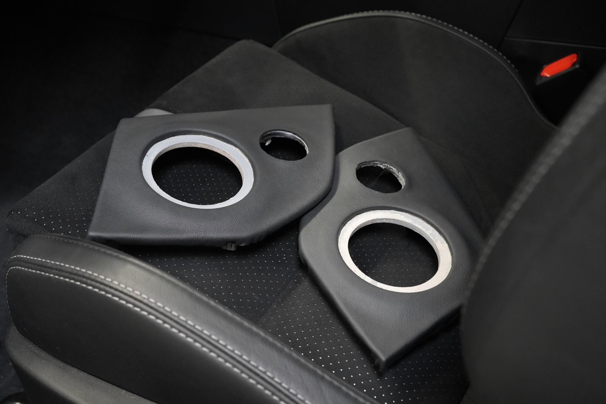 Nyní se již díváte na výškové a středové reproduktory Audible Physics. Požadavkem pro tuto instalaci bylo zachování původního designu interiéru, dovolili jsme si však nabídnout zákazníkovi úpravu originálních pozic pro lepší využití této pro zvuk nepříliš povedené lokace. Úprava zahrnovala laminaci původních mřížek, jejich potažení do koženky odpovídající barevnosti a struktuře palubní desky a samozřejmě přiznání nových reproduktorů.
