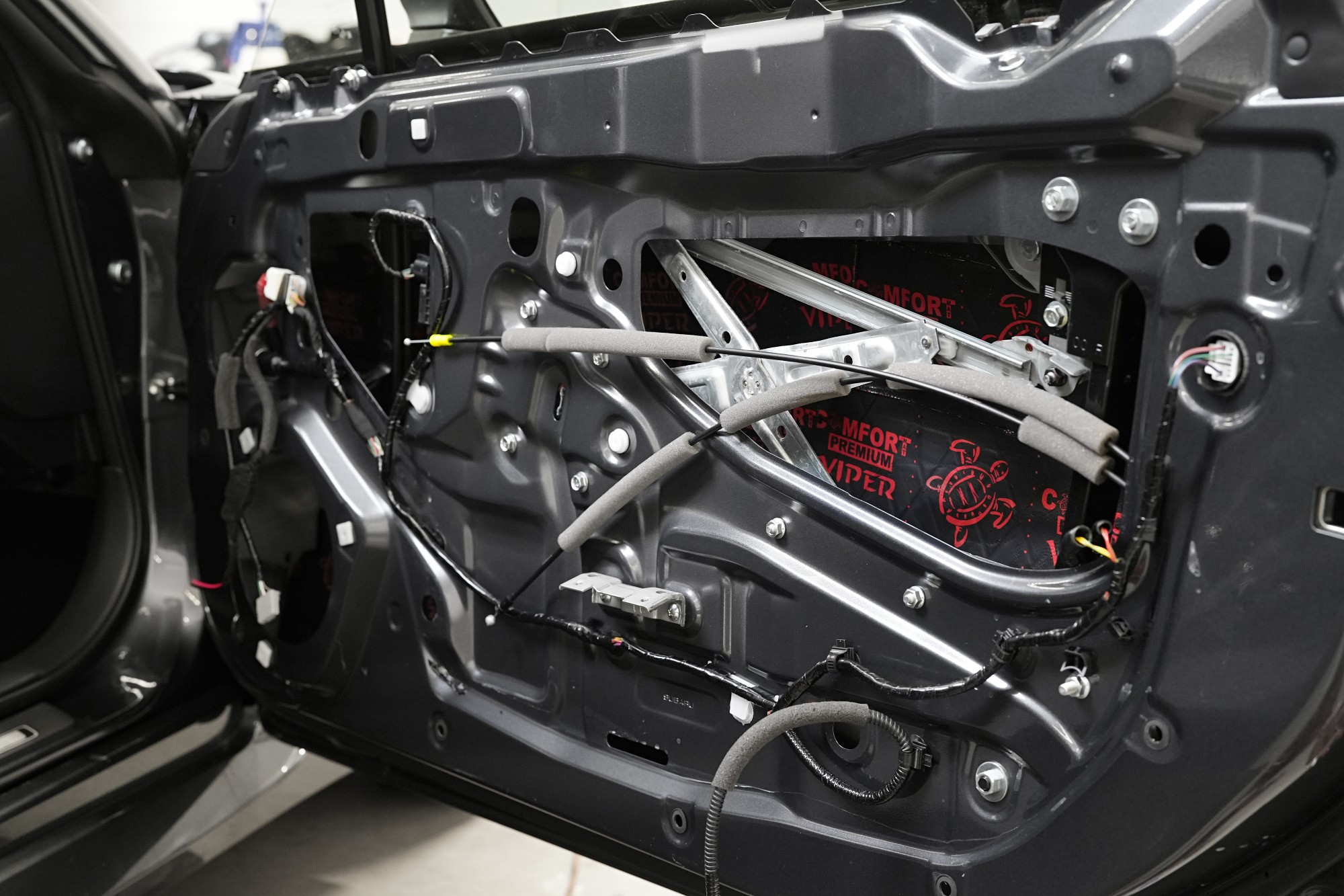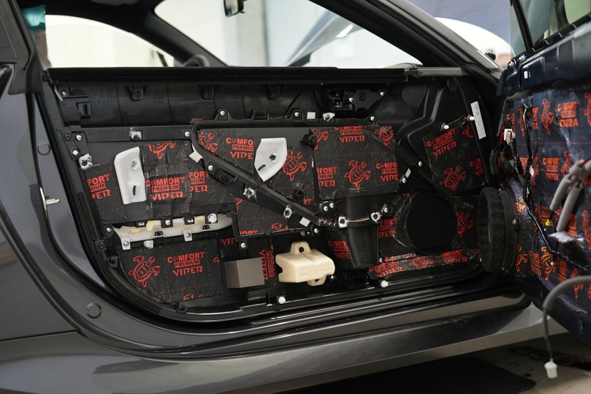 Pokračujeme instalací basových reproduktorů. Nejprve aplikujeme antivibrační materiál na vnější plech dveří, konkrétně Comfortmat Viper o tloušťce 3 mm. Ten pohltí vibrace od reproduktorů Morel a zpevní tenký plech dveří. Viper s akustickým ztrátovým činitelem 0,49 jednotek se pyšní nejlepším poměrem účinnosti a nízké hmotnosti na trhu a je optimálním řešením pro instalaci výkonných reproduktorů.