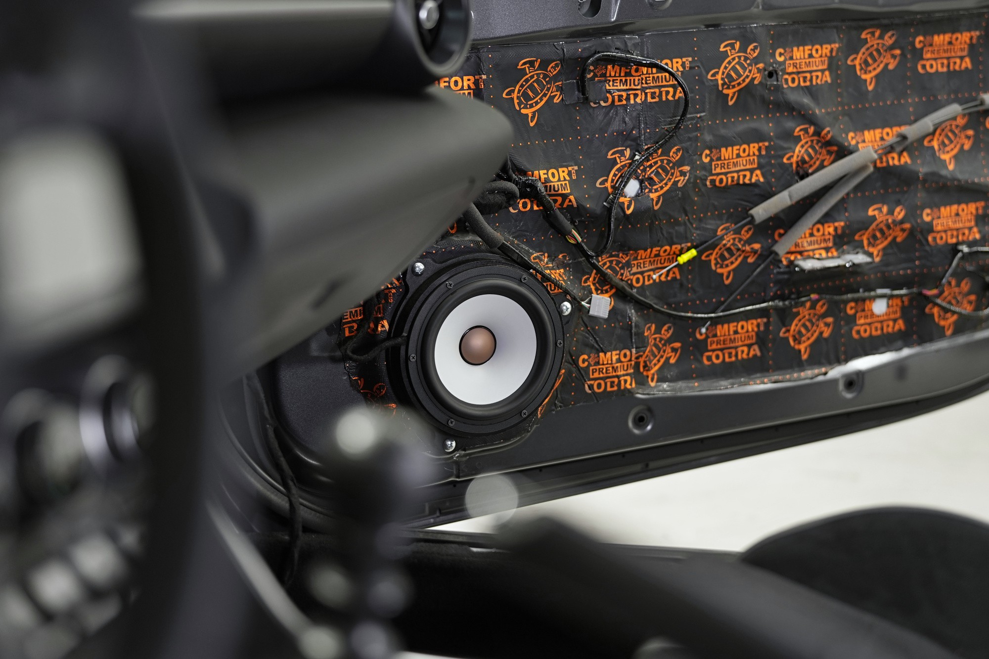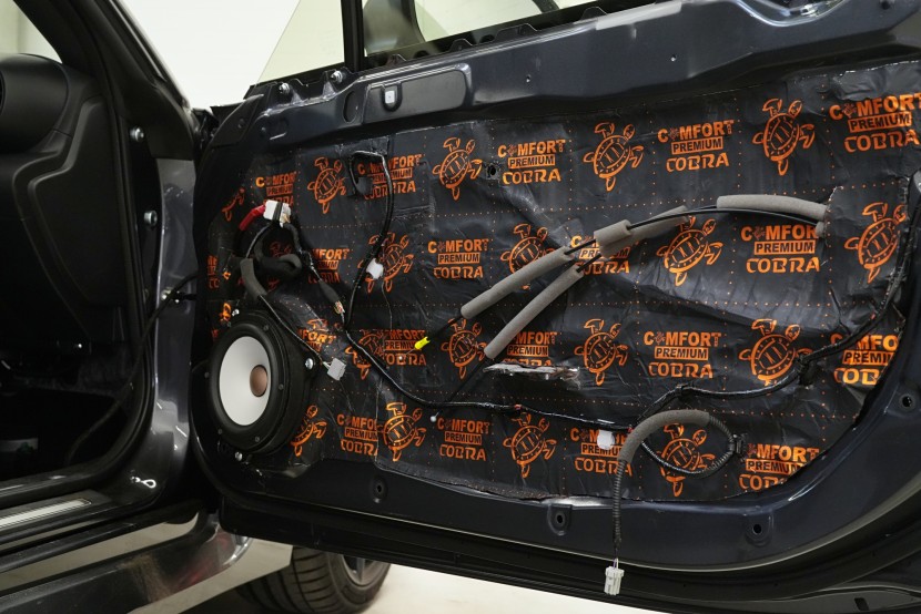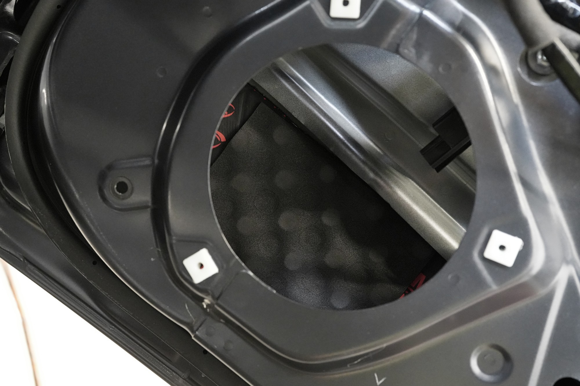 U všech našich instalací aplikujeme okolo středobasového reproduktoru vodotěsné proužky z pěny s uzavřenými buňkami, které těsní k plastové výplni dveří a soustřeďují veškerou zvukovou energii do interiéru vozidla, místo aby se odrážela uvnitř výplně dveří. To vede ke znatelnému zlepšení zvuku středobasu.