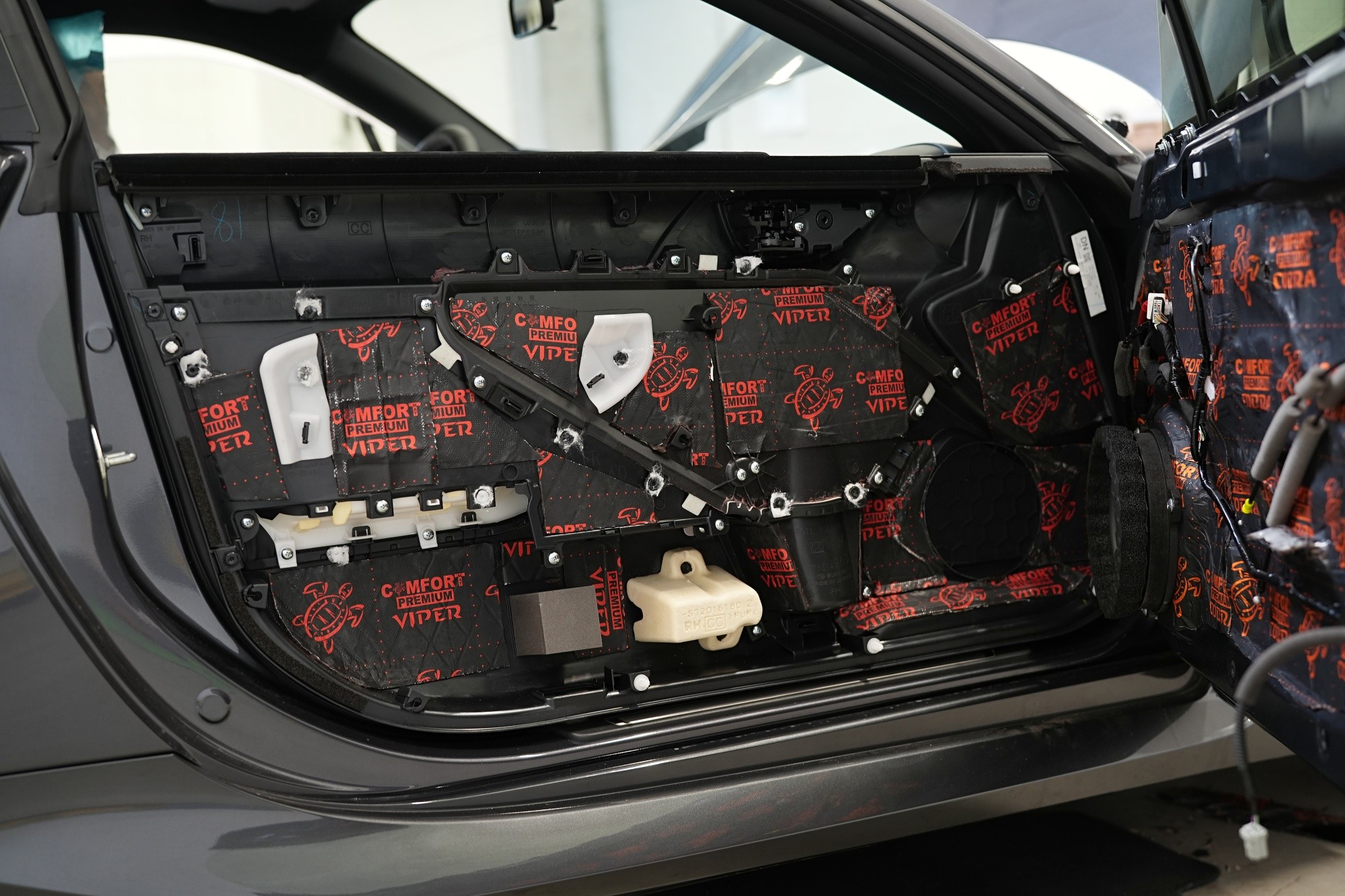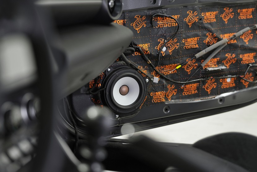 Nyní se již díváte na třetí vrstvu tlumení dveří v podobě ultralehkého antivibračního materiálu Comfortmat Cobra, jenž zamezí vibracím, které výkonné woofery způsobují. I při výběru materiálů jsme brali ohled na velké rozměry dveří, abychom panty zbytečně nezatěžovali. Zajisté jste si všimli i krásné bílé membrány středobasu s měděným vrchlíkem. Membrána je vyrobena z pokročilého materiálu MSP (Magnesium Silicate Polymer), který je známý svou vynikající tuhostí, velmi nízkou hmotností a minimálními vibracemi, což umožňuje přesnou a přirozenou reprodukci zvuku.