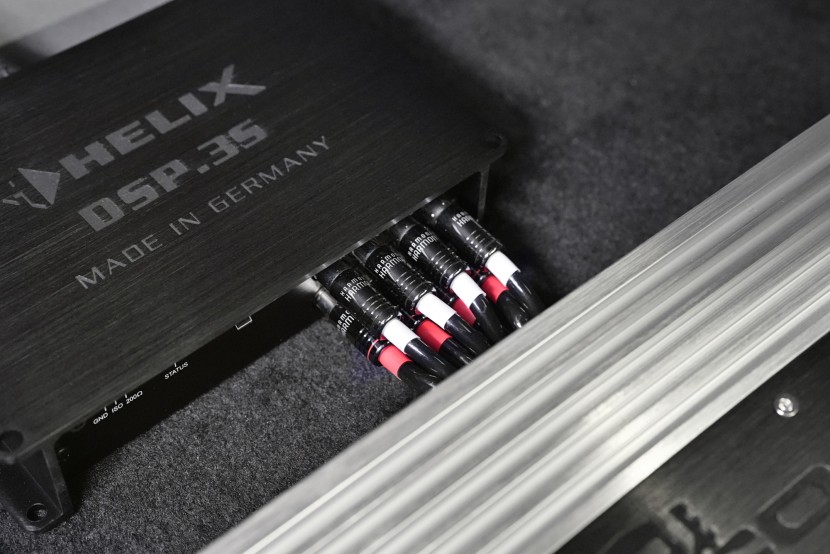 Bez DSP procesoru se žádný kvalitní audio systém v dnešní době neobejde. Díky němu budeme schopni zvuk v tomto automobilu detailně naladit, aby poskytoval majiteli vozu požadovaný výsledek. Pro účely této instalace jsme zvolili DSP procesor Helix od německých mistrů z Audiotec-Fischer. Kvalitní komponenty si žádají také kvalitní signálové kabely. V tomto případě padla volba na řadu Acapella od výrobce Harmonic Harmony, který se úzce specializuje na high-end kabeláž.