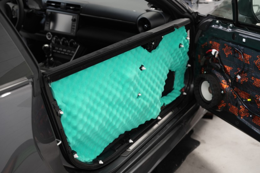 Pouze za reproduktor následně lepíme akustický materiál, který má jednu velmi zajímavou funkci a to absorpci stojatého vlnění za reproduktorem. Díky tomu se zvuk neodráží od plechu dveří, ale je pohlcen materiálem, což vede ke znatelnému zlepšení zvuku. I Comfortmat Tsunami je zcela voděodolný, nenasává vlhkost a díky extrémně přilnavé vrstvě nehrozí jeho odlepení.