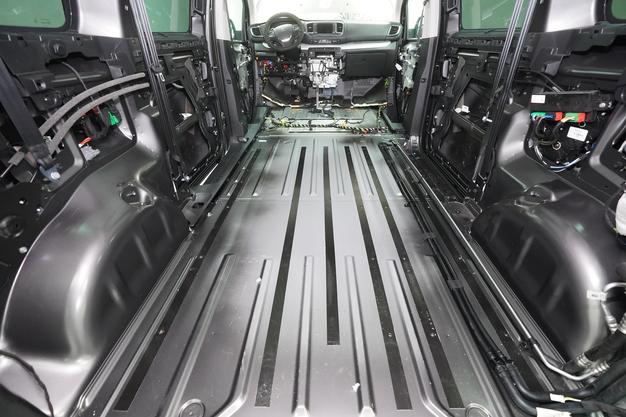 Toyota Proace je kompletně odstrojená a tovární zvuková izolace se ukazuje v plné své kráse. Respektive není co ukazovat, zcela holé plechy bez jakékoliv ochrany způsobují výrazné vibrace karoserie a jsou samozřejmě velmi náchylné na veškerý druh hluku. Vypadá to, jako by výrobce na zvukovou izolaci úplně zapomněl. Všechny plechy důkladně vyčistíme, odmastíme a pustíme se do práce.