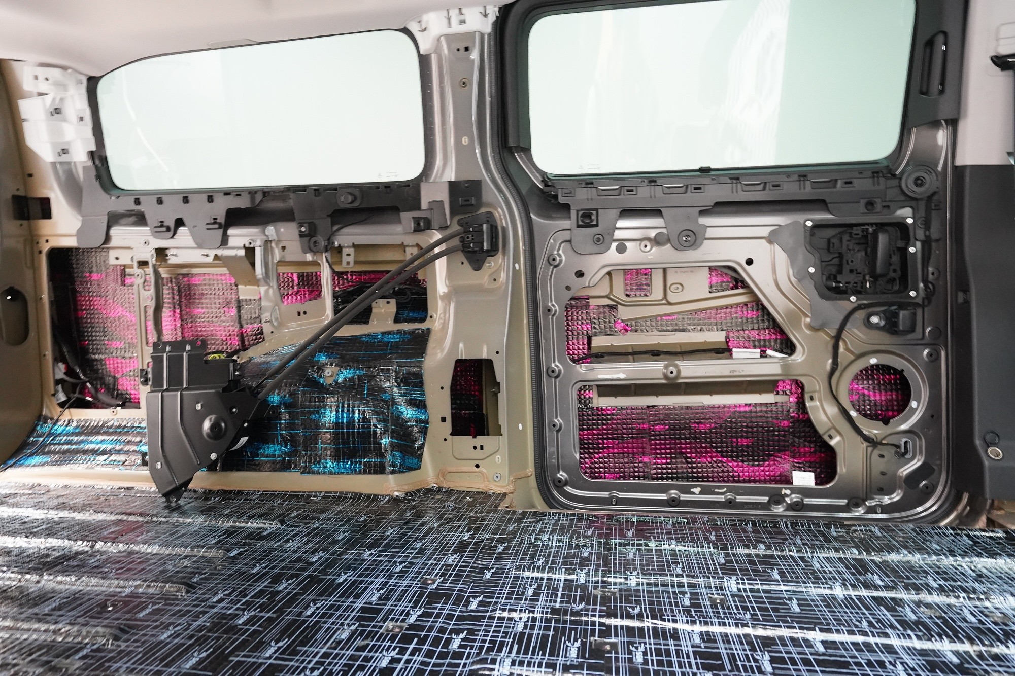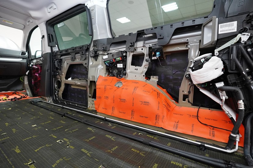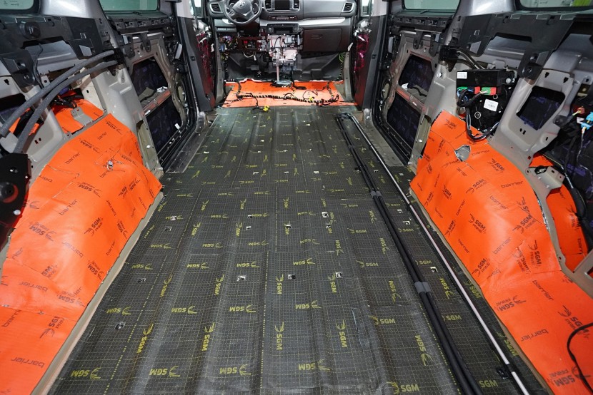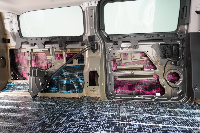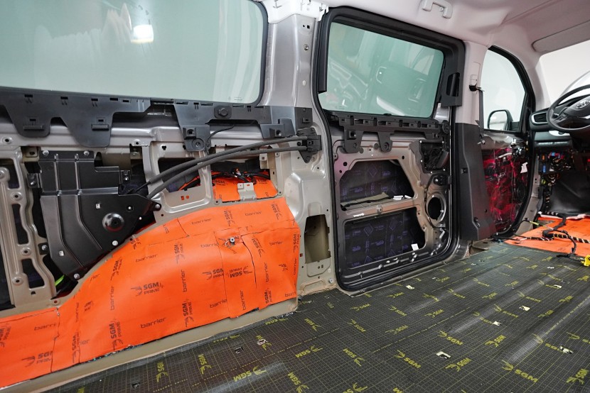 Na blatníky a posuvné dveře aplikujeme odlehčený antivibrační materiál SGM Air 3, který se pyšní nejen velmi nízkou hmotností, ale vysokým ztrátovým činitelem 0,42 jednotek. A konečně zadní podběhy opatříme stejně jako podlahu nejlepším z nejlepších - SGM Dual Prime. Vibrace a nízkofrekvenční hluk od pneumatik i létajících kamínků již nemá žádnou šanci a jdeme na druhou vrstvu.