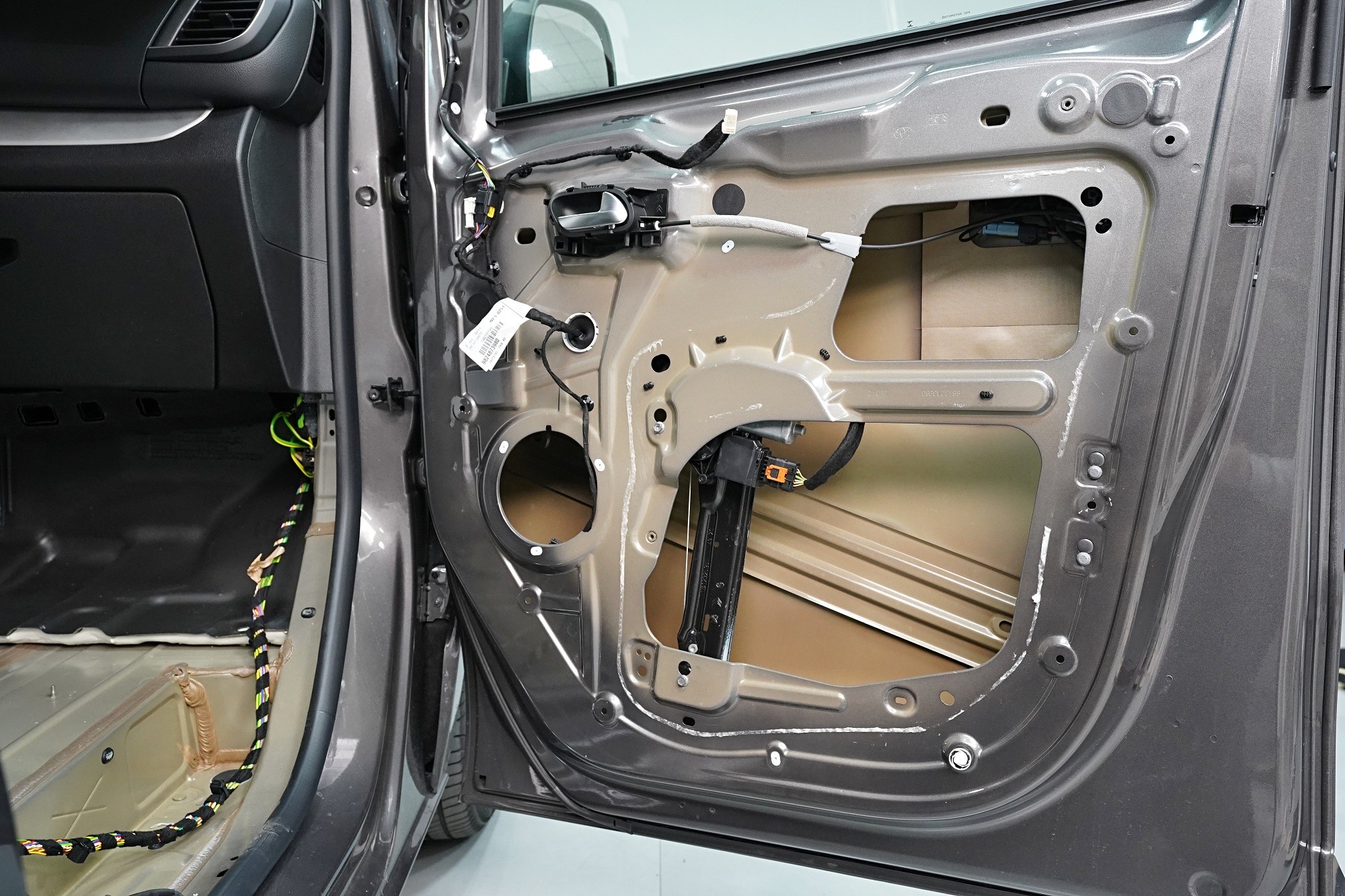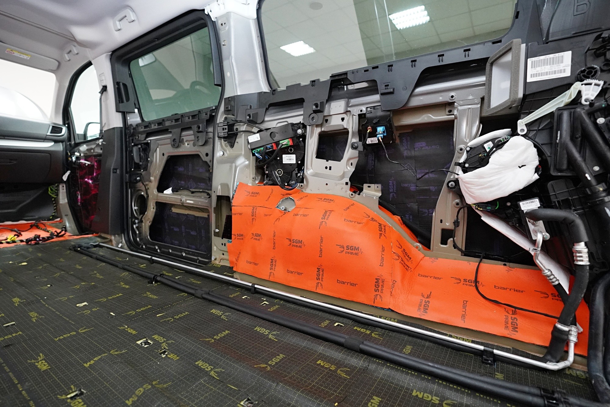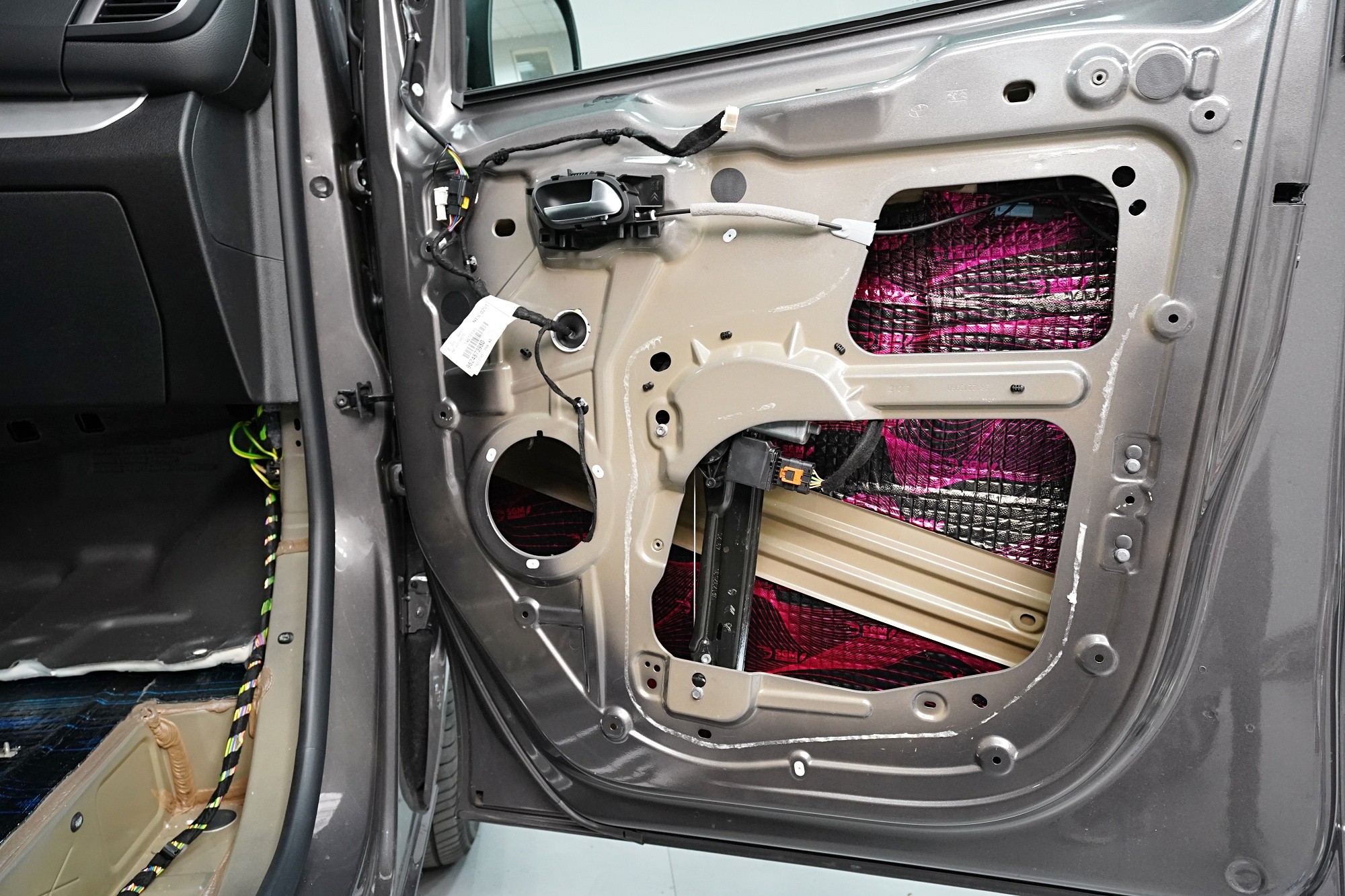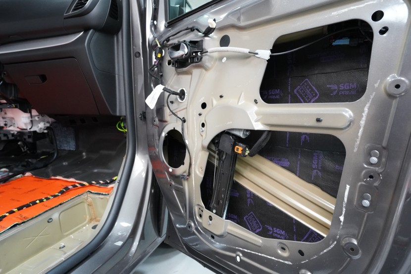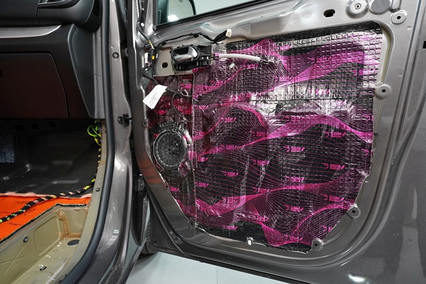 V rámci balíčku Expert Plus volíme jako první vrstvu při odhlučnění dveří antivibrační materiál SGM Air 3 o tloušťce 3 mm a MLF 0,42 jednotek. Ten s přehledem zlikviduje vibrace, zamezí pronikání nízkofrekvenčního hluku a zpevní velmi tenký plech dveří. I přes tloušťku 3 mm materiál disponuje velmi nízkou hmotností, je samozřejmě voděodolný a má mimo jiné antikorozní vlastnosti.