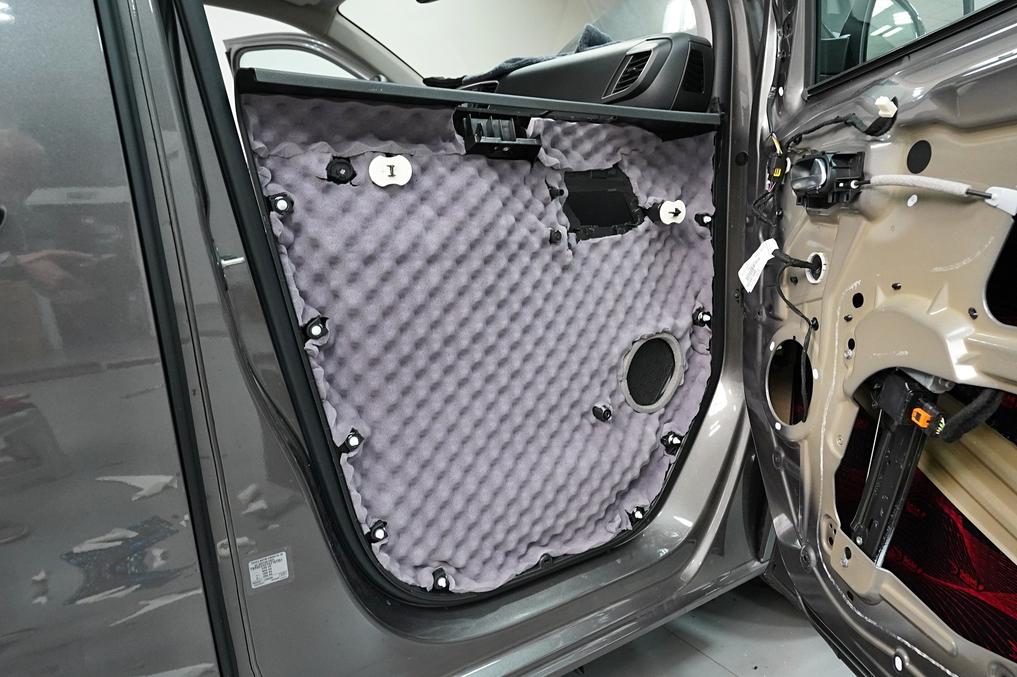 Poslední vrstvou je SGM Violon Wave o tloušťce 15. Tato flexibilní pěna s tvarovou pamětí se lepí na plastové čalounění dveří z důvodu zamezení skřípání a vrzání nejen plastů, ale i drátů a dalších komponent uvnitř dveří a dodatečně i sníží hluk této oblasti. Stejný postup samozřejmě volíme i u zadních a pátých dveří.