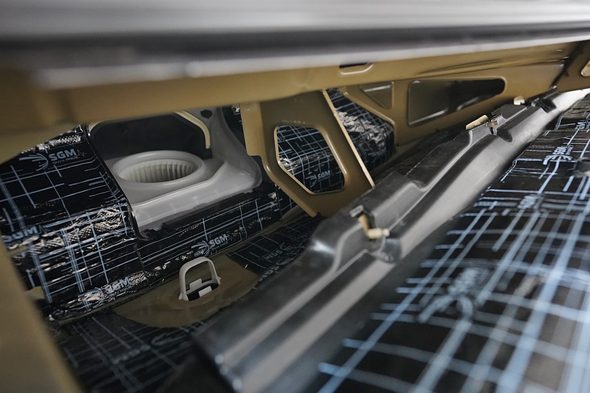 Jako druhou vrstvu aplikujeme zvukově izolační materiál SGM Barrier Ultra a to z několika důvodů. Kromě vysoké zvukové izolace až 33 dB tento materiál nabízí i absolutní voděodolnost, která je pro tuto oblast zásadní. A jelikož torpédo je často opatřeno mřížkou, je černá barva tohoto materiálu ideální pro nenápadnou aplikaci.