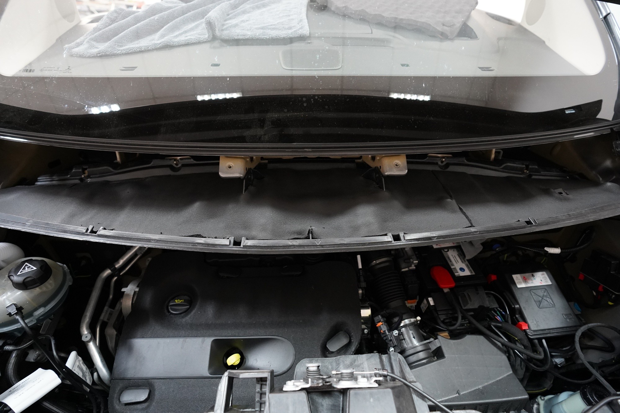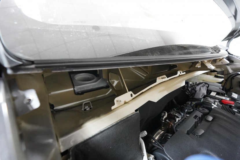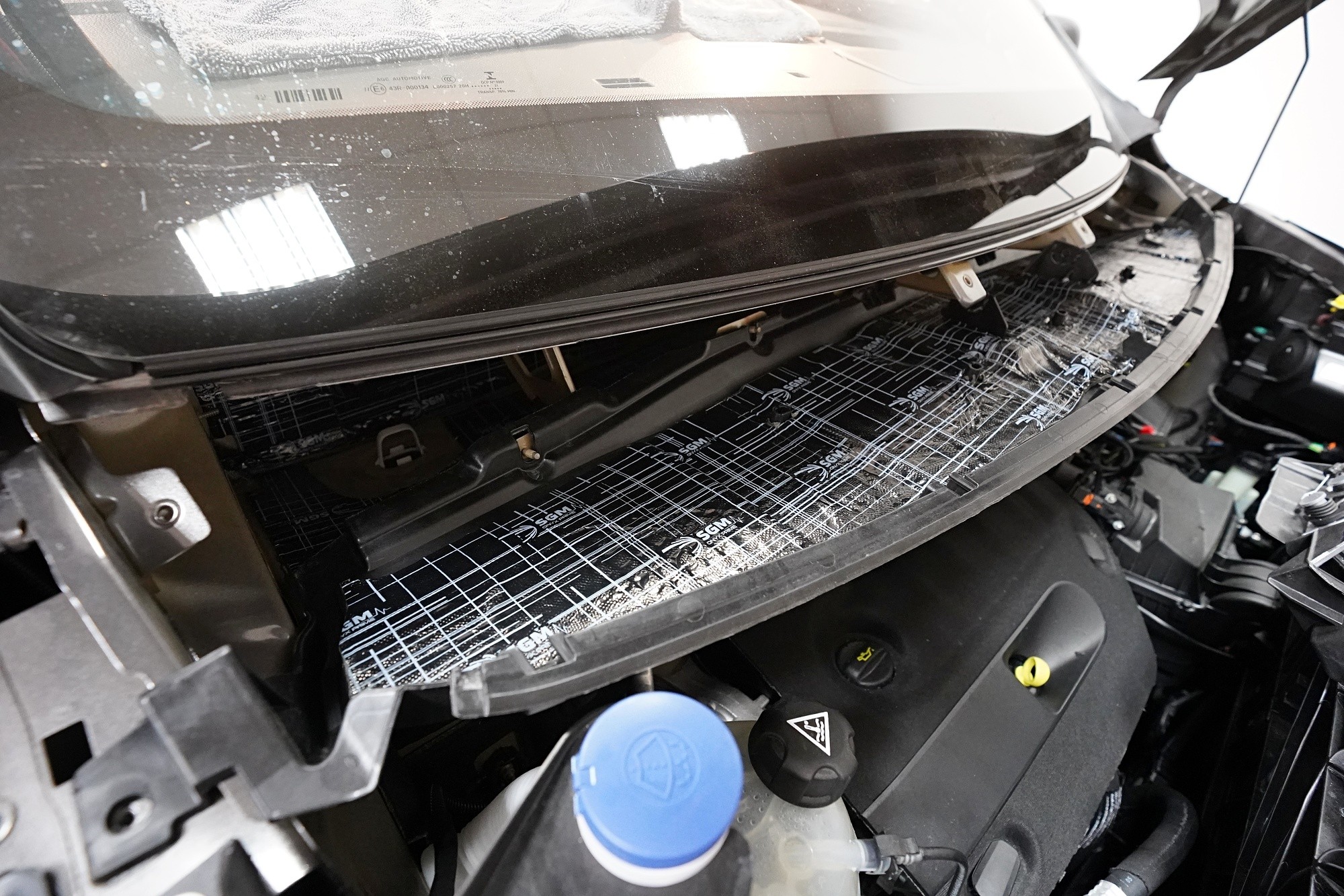 Také odhlučnění torpéda může přinést zajímavé výsledky. Stěrače jsou zdrojem silných vzduchových turbulencí a prostor pod spodním okrajem čelního skla je často veliký. Vytváří se zde efekt zvuku v jeskyni a to v bezprostřední blízkosti interiéru. Druhým důvodem k odhlučnění torpéda je snížení hluku od motoru. Nejprve tradičně aplikujeme antivibrační materiál, konkrétně SGM Onyx 3, který odfiltruje silné vibrace motoru.