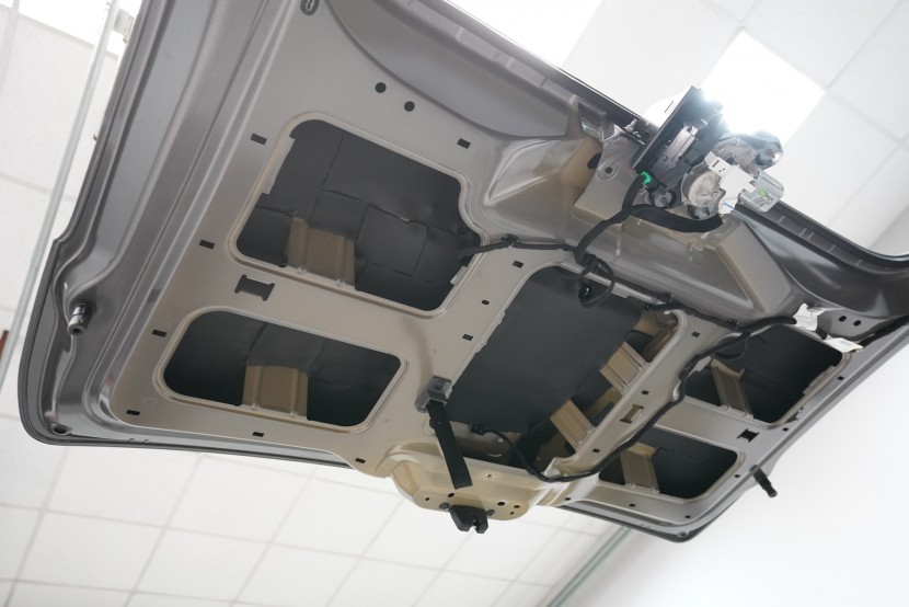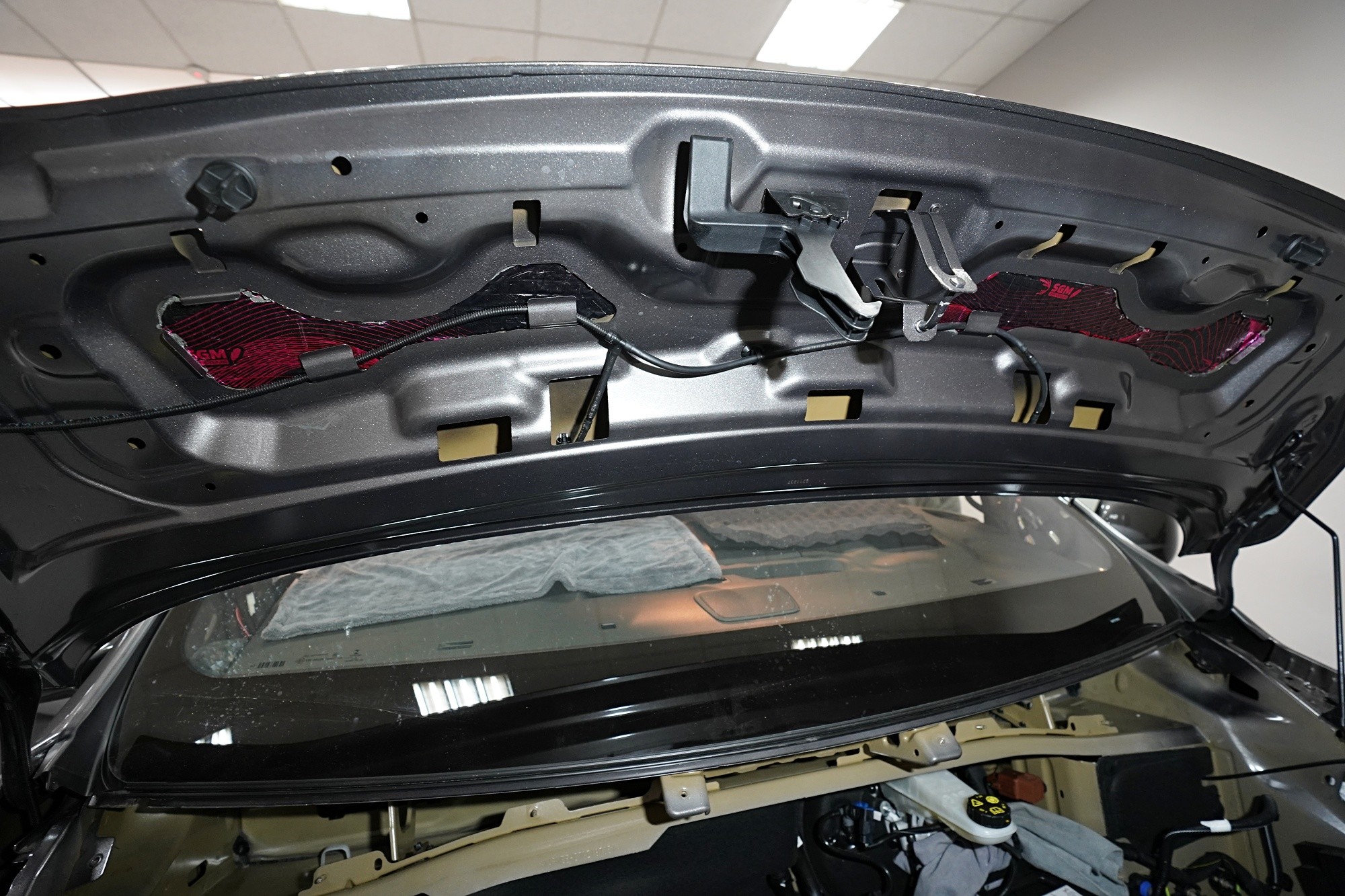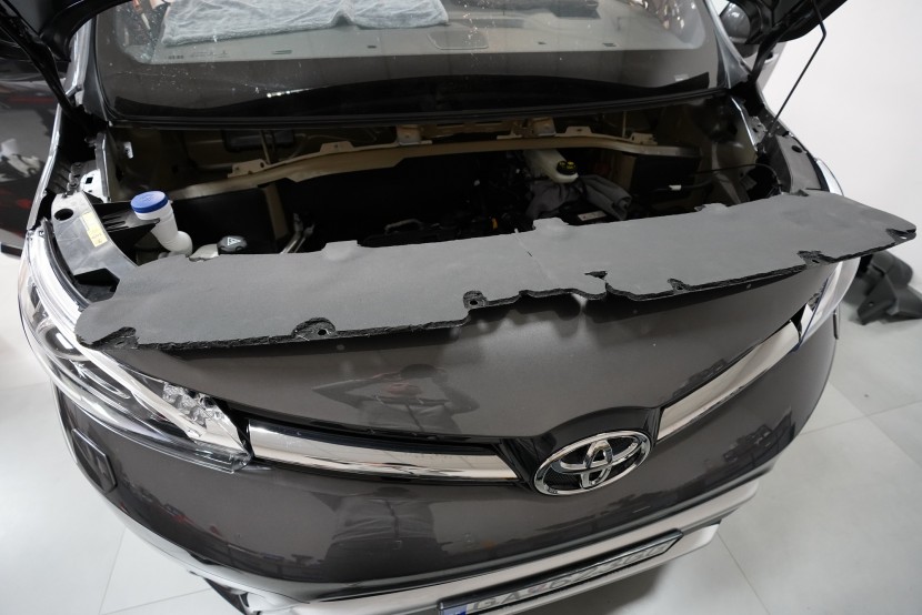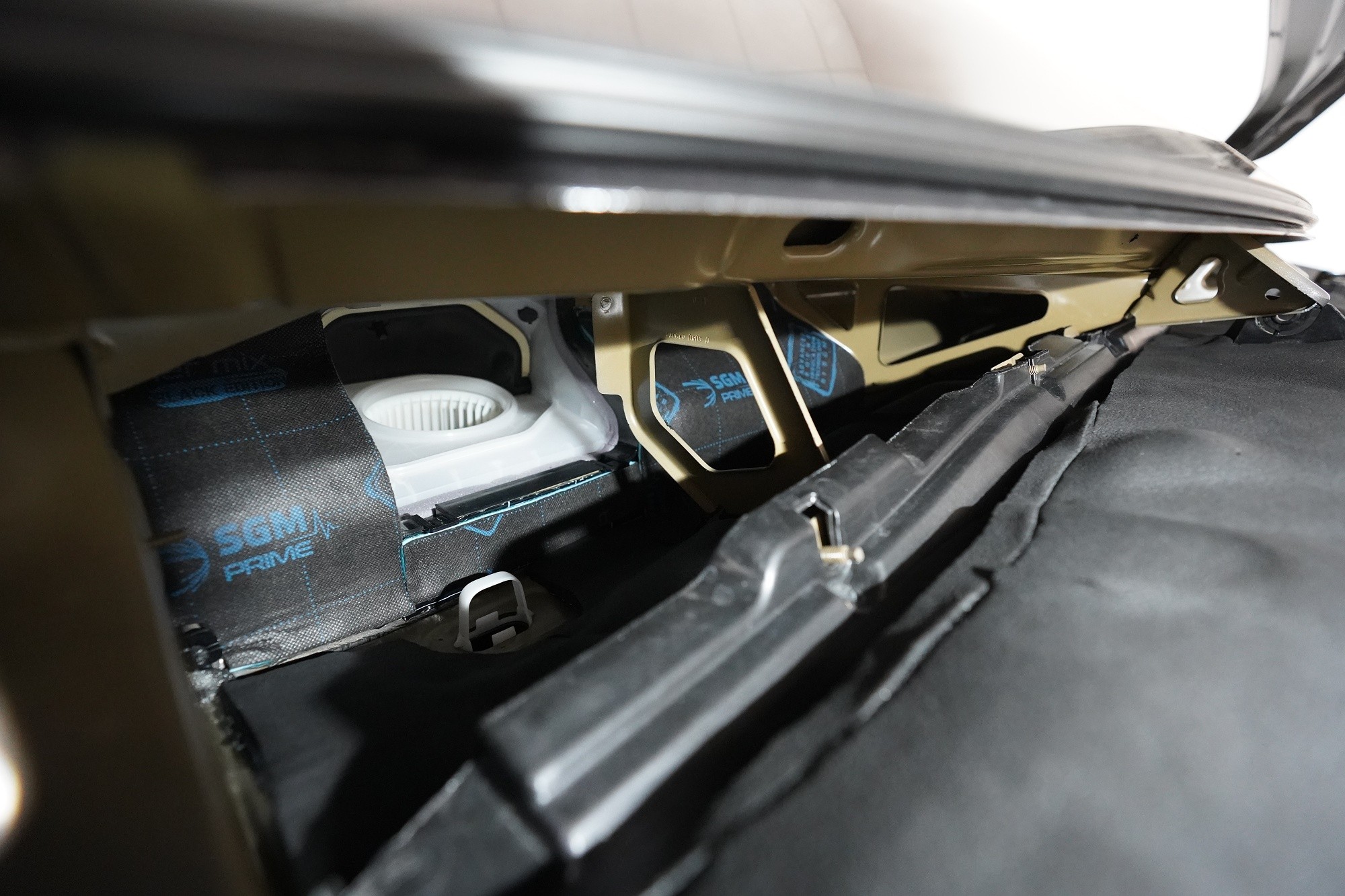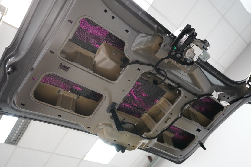 Nezapomínáme ani na kapotu, na kterou v první vrstvě aplikujeme lehký antivibrační materiál SGM Air 2. Tím kapotu zpevníme, zamezíme vibracím, které se přenáší do dalších částí vozu a zmizí i typický plechový zvuk při zavření kapoty. Na originální kryt kapoty následně aplikujeme zvukově i tepelně izolační materiál SGM R-Ton, který sníží hluk motoru a to při zachování původního vzhledu motorového prostoru.