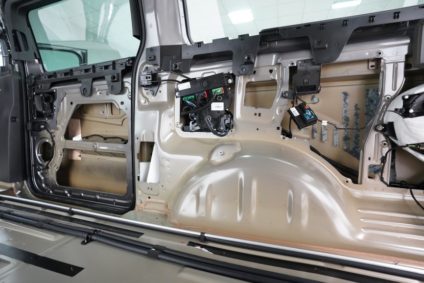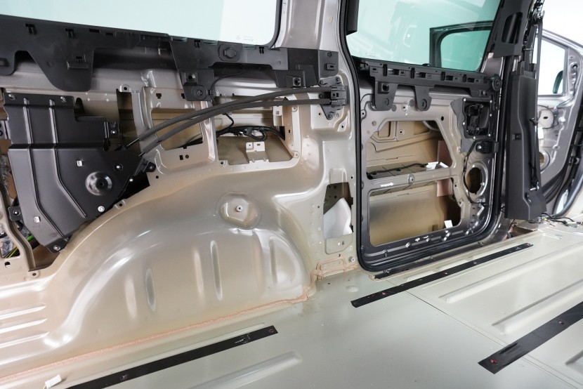 Blatníky a posuvné dveře jsou ve druhé vrstvě opatřeny lehkým membránovým materiálem SGM Barrier Lite momentálně v černo-fialové barvě v limitované Black Edition, který v dalším kroku najdete i ve dveřích. A na podběhy, které jsou nejvíce zatížené hlukem i vibracemi, lepíme ve druhé vrstvě stejný materiál jako na přední část podlahy, tedy SGM Barrier Mix. Díky své 2 mm silné protihlukové membráně nahrazuje druhou i třetí vrstvu odhlučnění a výrazně tak usnadňuje aplikaci.