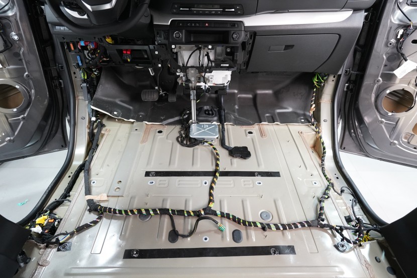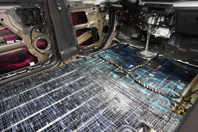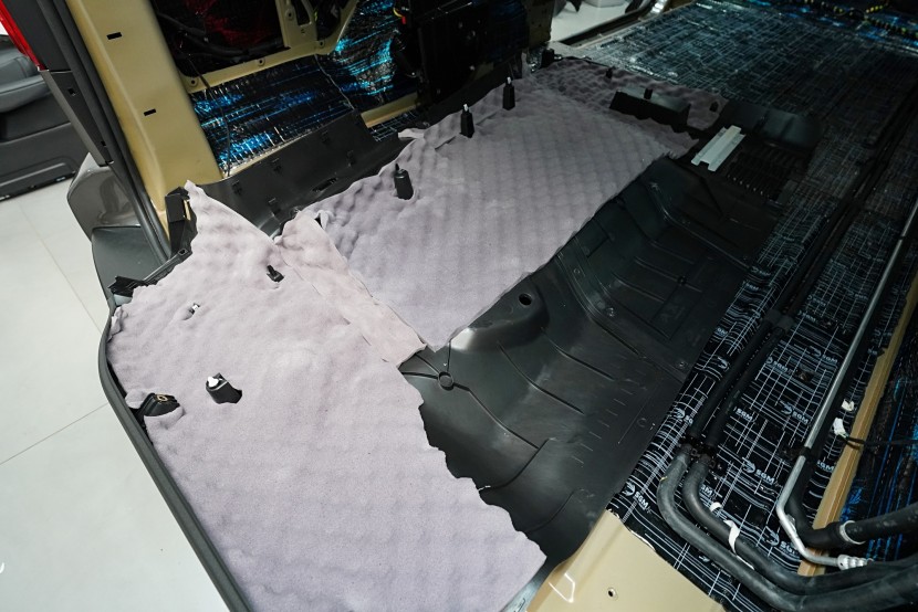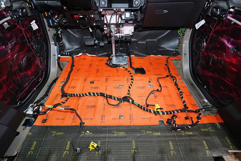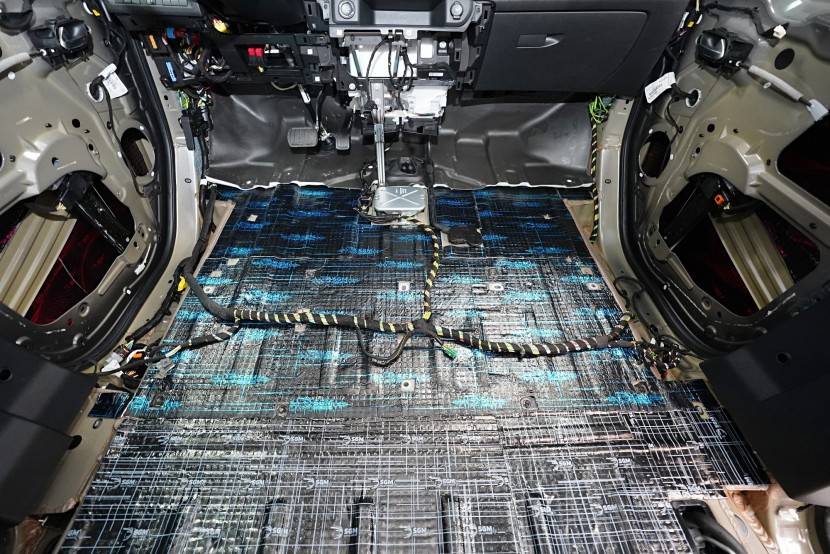 Začínáme podlahou vozu, kterou odhlučňujeme 2 vrstvami a trochu jiným způsobem než u jiných vozů tohoto typu. Zejména zadní část je prostorově velmi stísněná a je nezbytné zvolit materiály s menší tloušťkou. Začínáme ale přední částí podlahy, na kterou jsme v první vrstvě aplikovali momentálně nejúčinnější antivibrační materiál na trhu o tloušťce 4 mm a to SGM Dual Prime. Ten se pyšní akustickým ztrátovým činitelem (MLF) o hodnotě 0,66 jednotek a velmi snadnou aplikací, při které není nutné materiál nahřívat. Dual s přehledem odfiltruje vibrace této oblasti od motoru, převodovky nebo zavěšní kol a eliminuje pronikání nízkofrekvenčního hluku.