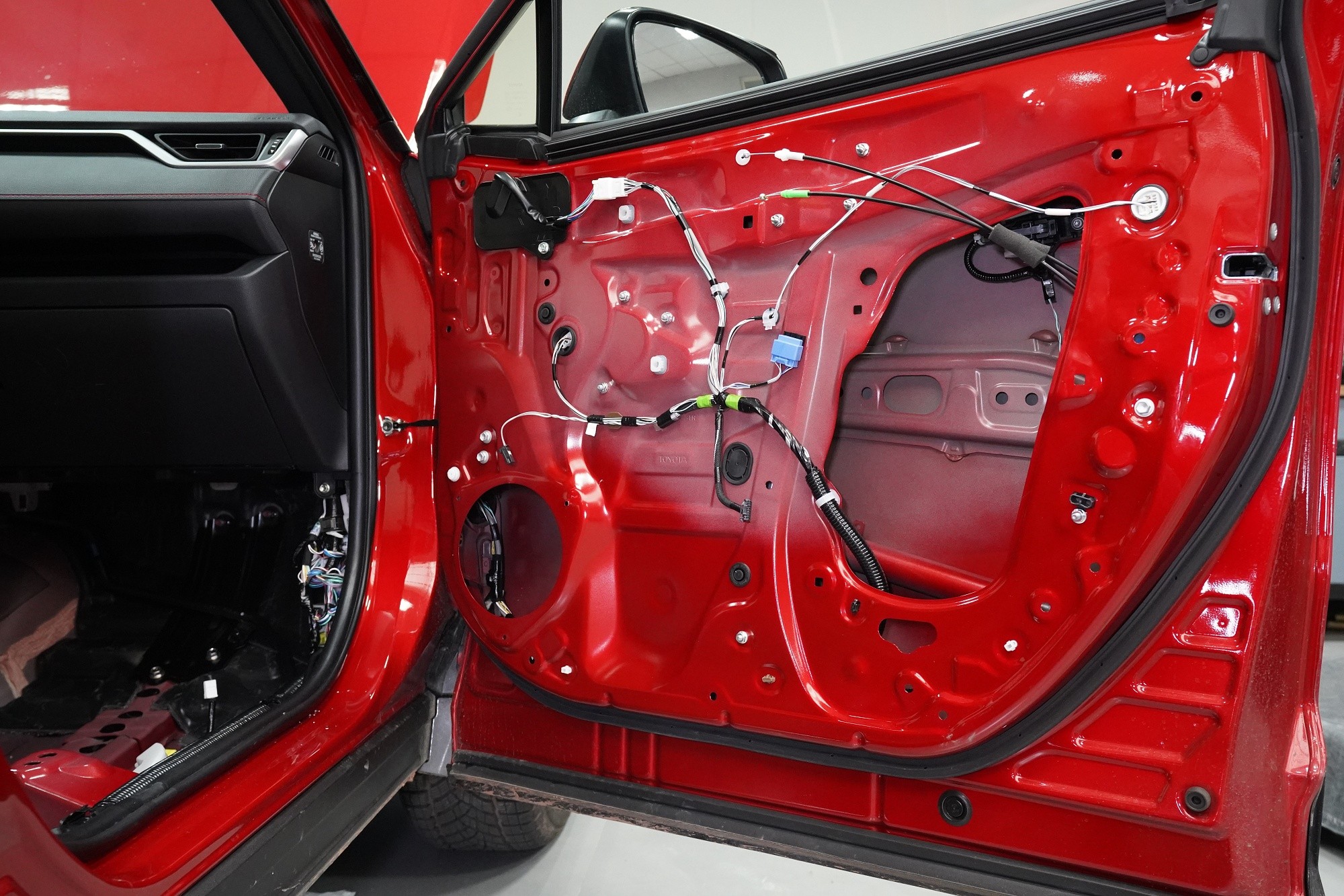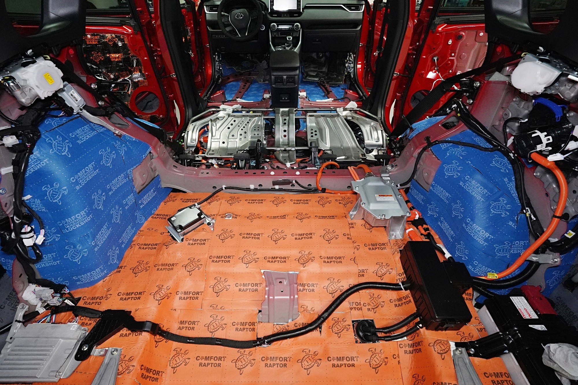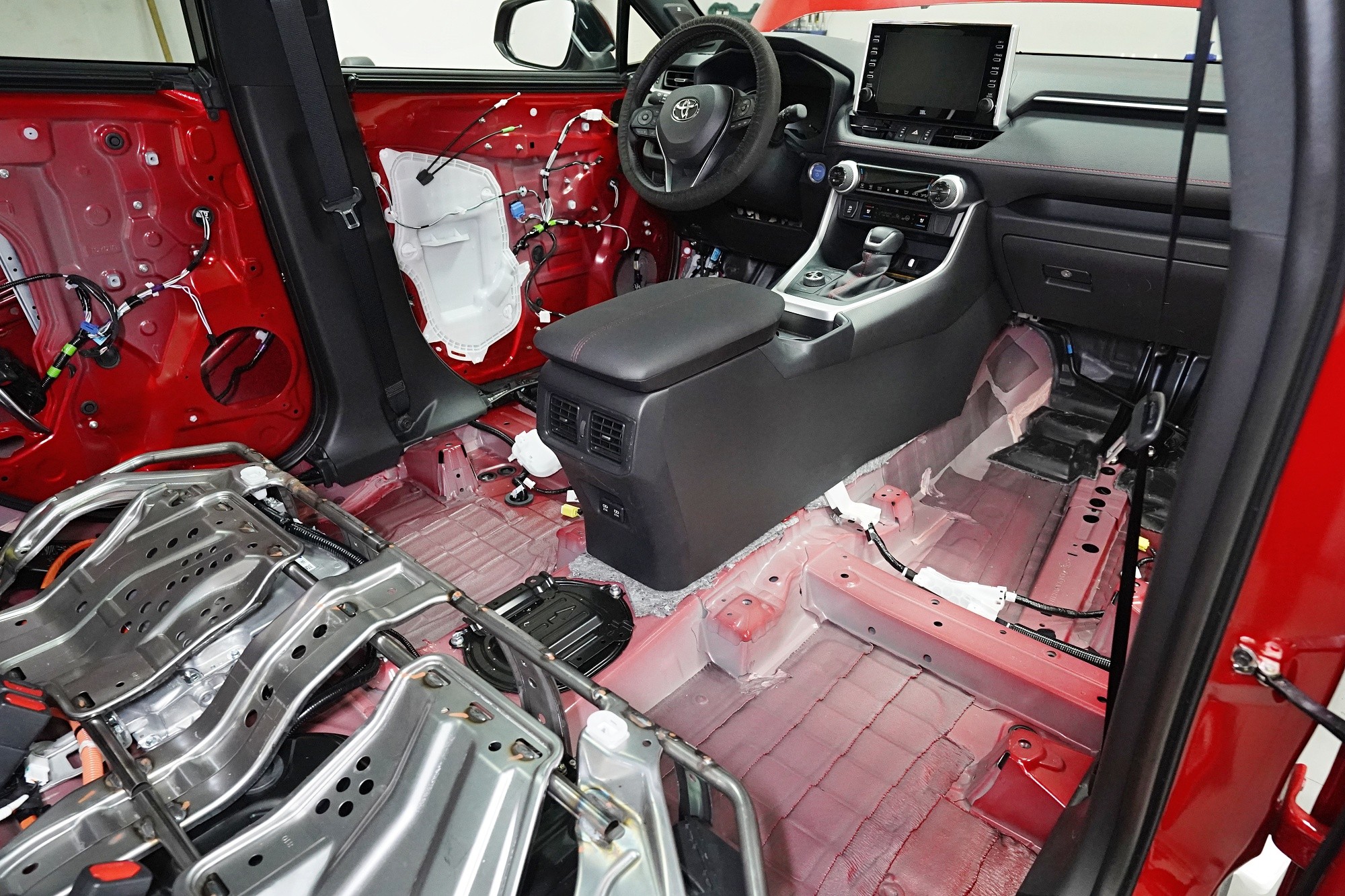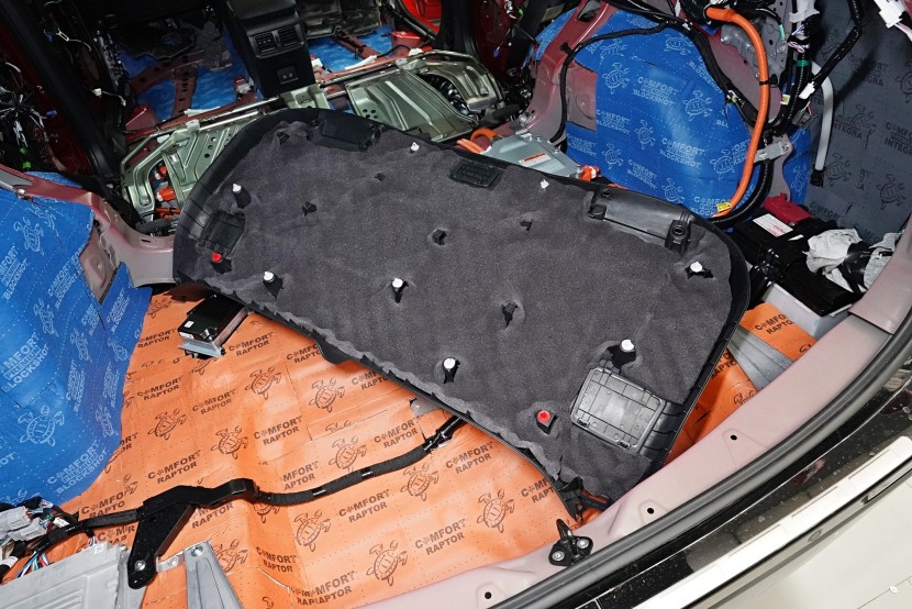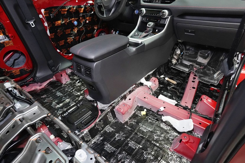 Odhlučnění vozu Toyota RAV4 poslední generace začínáme obvyklým způsobem, tedy demontáží interiéru. Odstraníme všechny sedadla, veškeré čalounění a další komponenty, které nám mohou bránit při práci. Volant chráníme vždy potahem, abychom předešli jeho případnému poškození. Avizované vylepšení ochrany proti vibracím vidíme zejména na podlaze vozu, nicméně i tak se jedná o nedostatečné řešení. Pouštíme se tedy do náročné práce.
