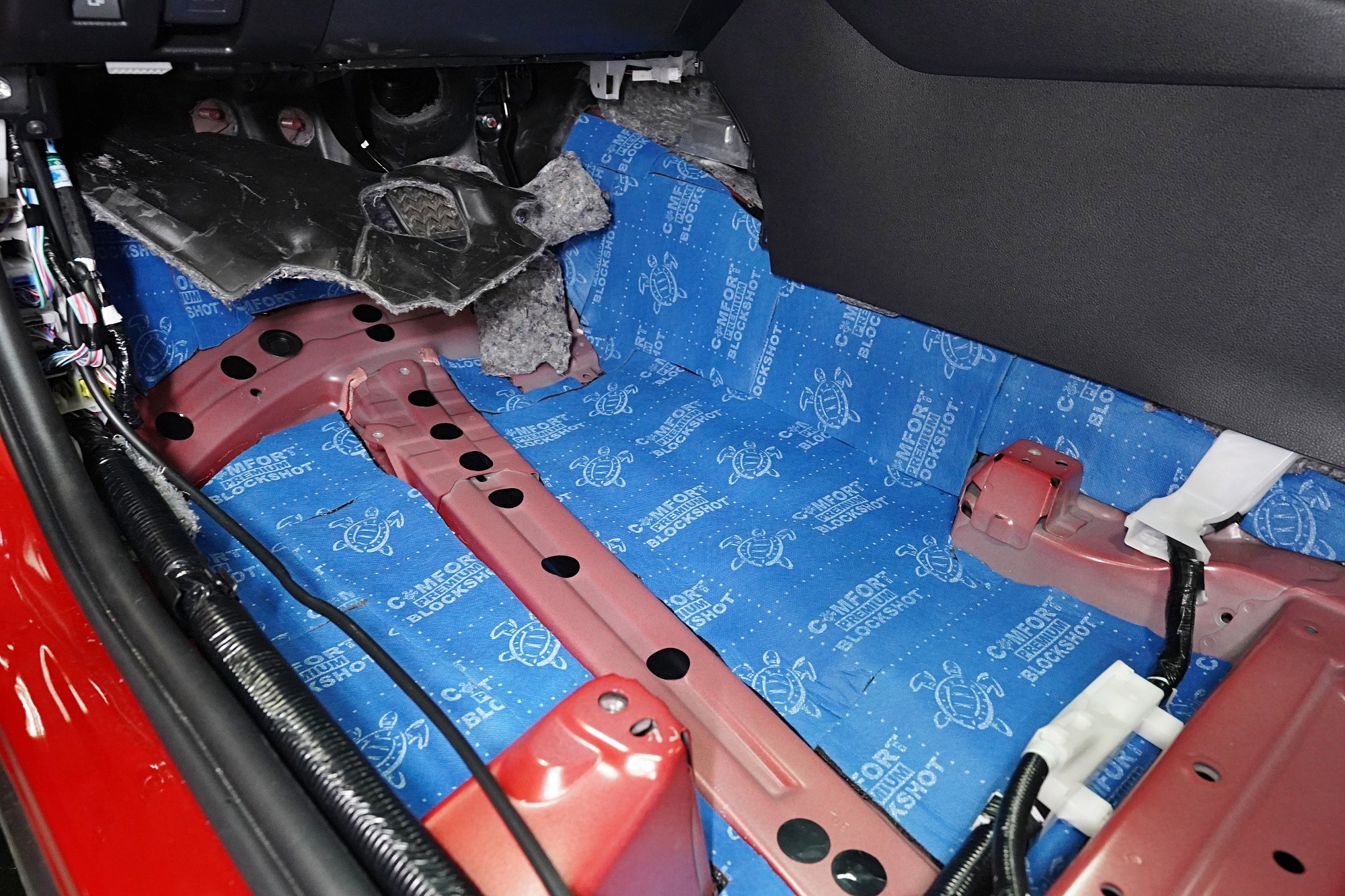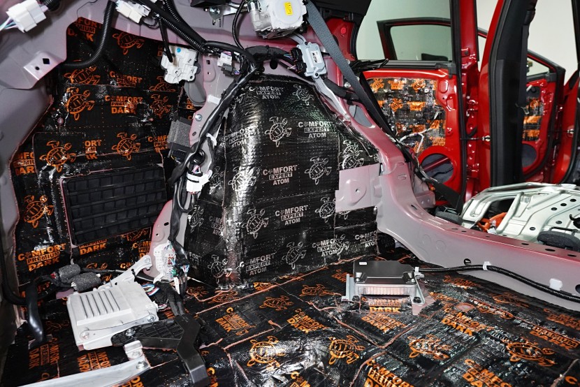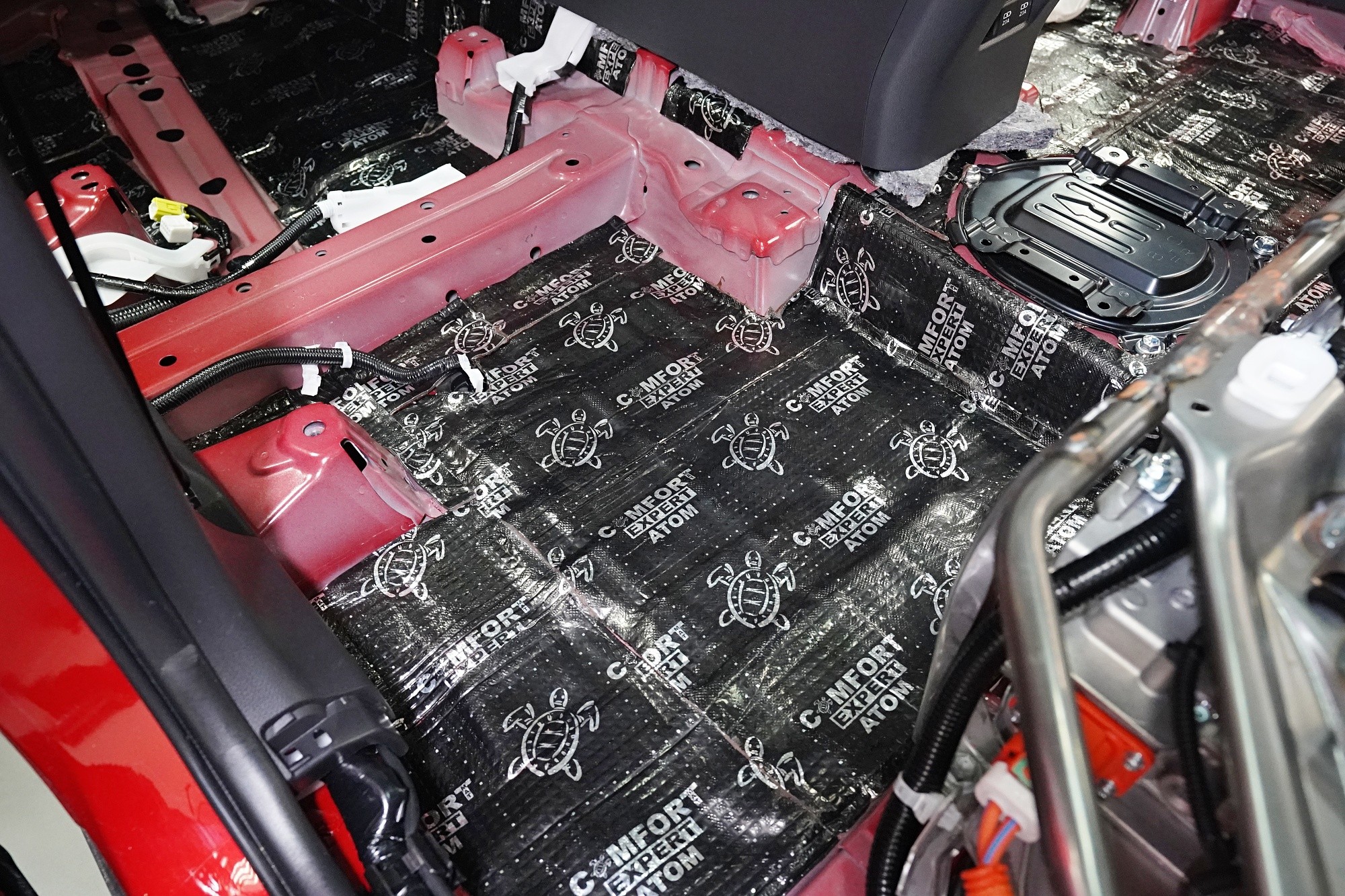 Atom spolu s Blockshotem aplikujeme na všechna dostupná místa, abychom umožnili izolaci maximálního množství vibrací a nízkofrekvenčního hluku. V přední části podlahy se dostáváme až pod palubní desku, díky čemuž důkladně odhlučníme i přední podběhy z vnitřní části vozu, kde je přístup k větší ploše karoserie. Podlahu odhlučňujeme vysoce účinným antivibračním materiálem o tloušťce 4 mm a zvukově izolačním materiálem v druhé vrstvě o tloušťce 7 mm. Celkem tedy 11 mm zvukové izolace, což má za následek důkladné zamezení hluku od předních pneumatik i bez aplikace z vnější strany.