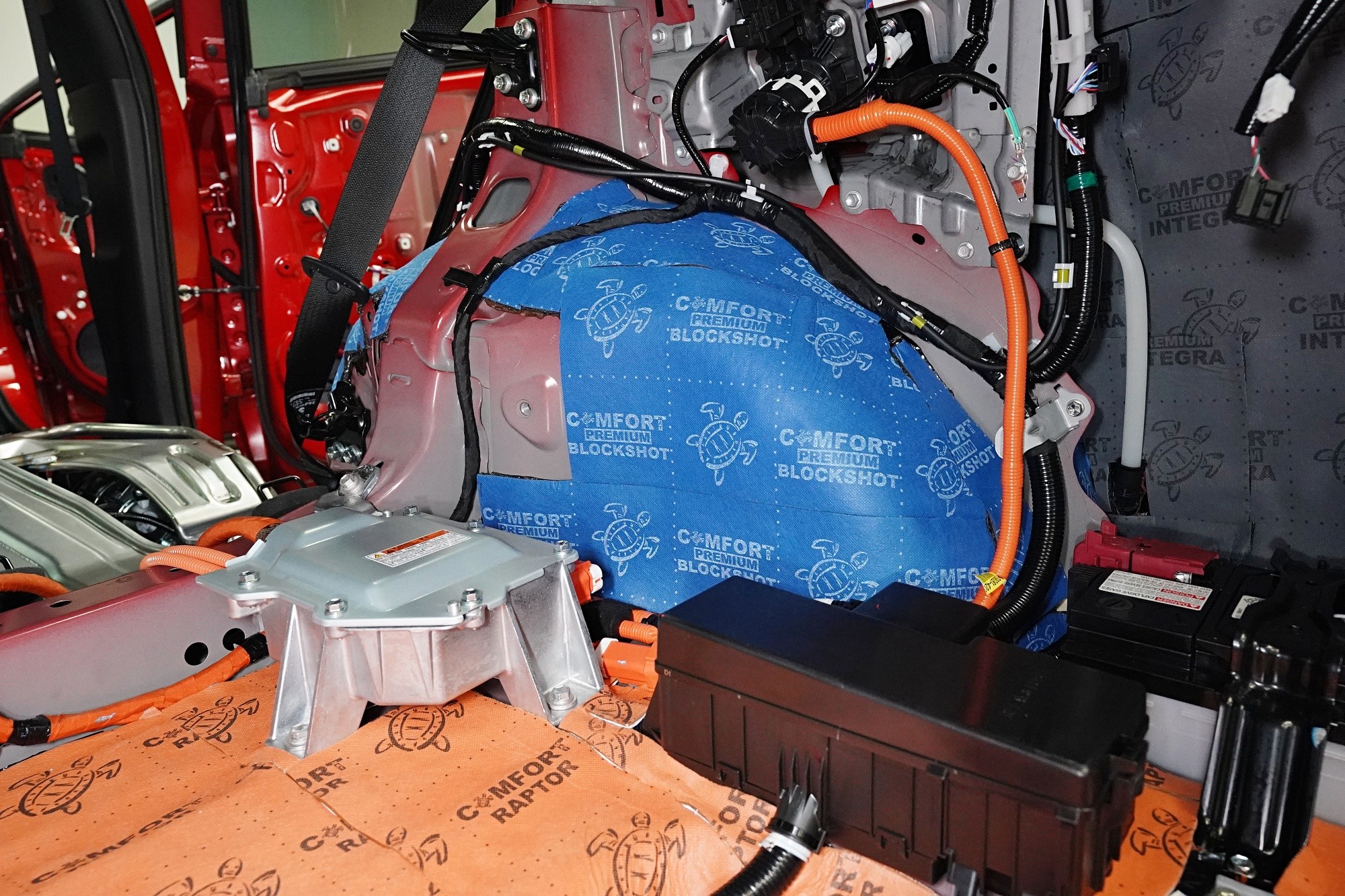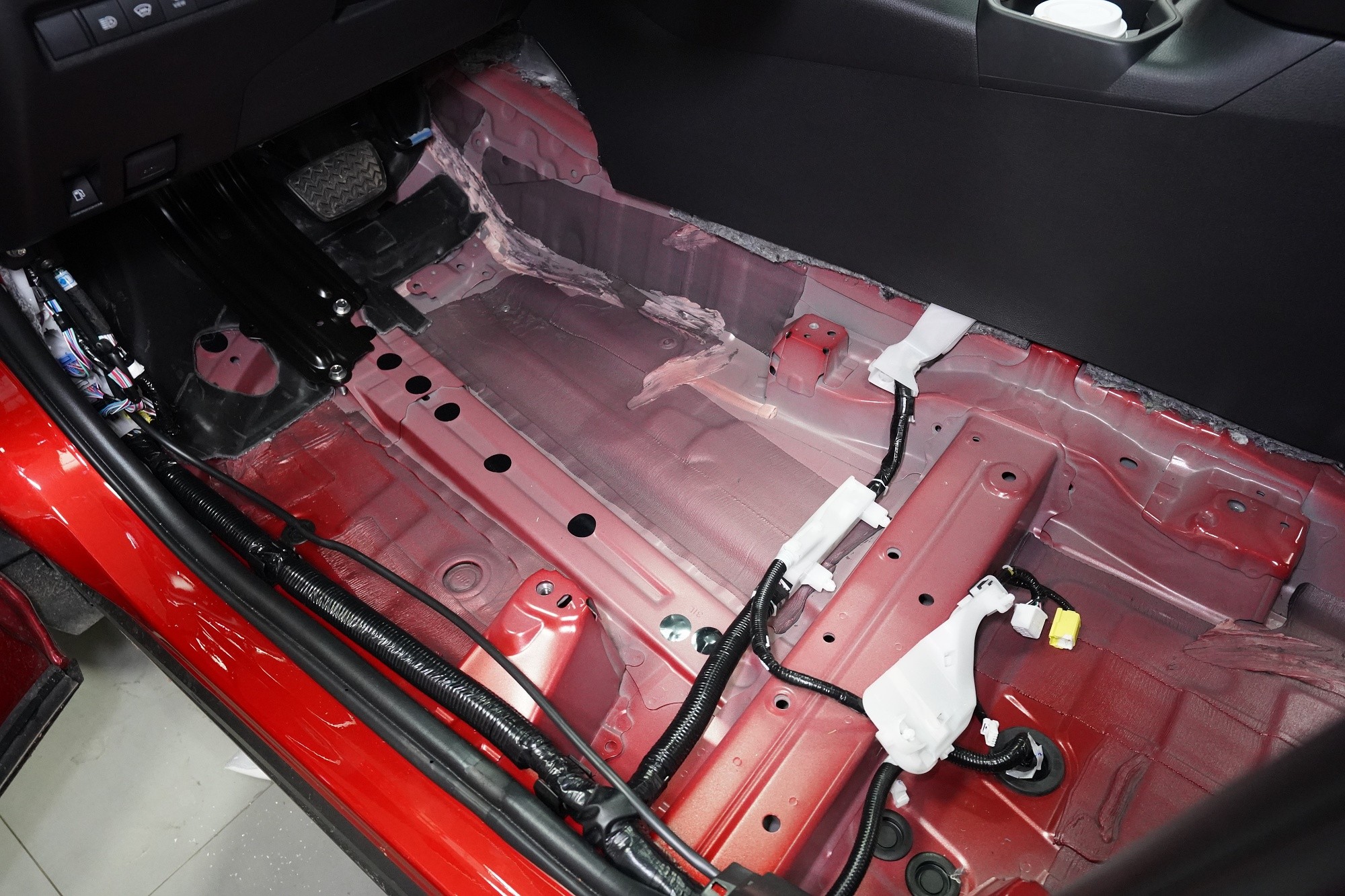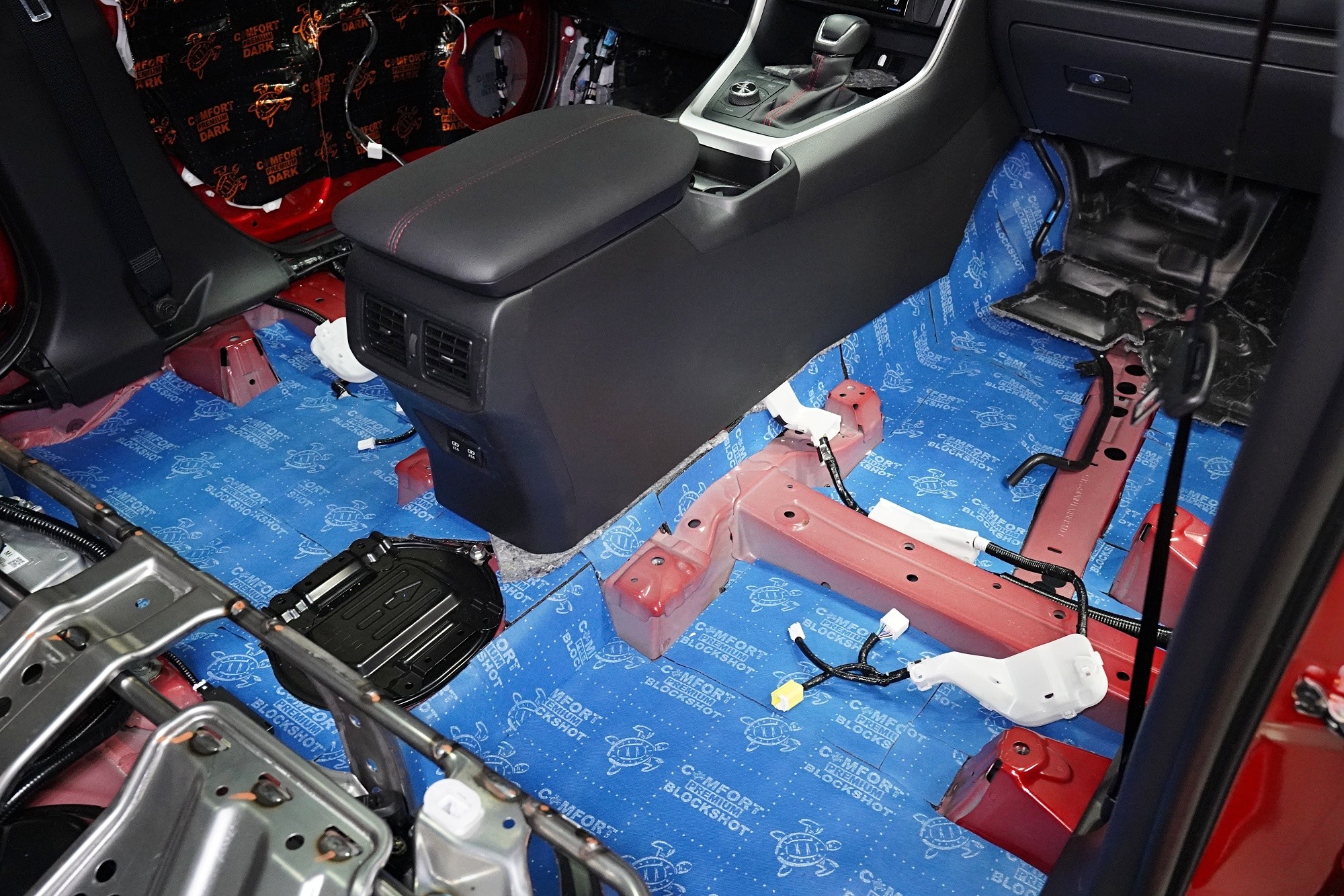 Atom spolu s Blockshotem aplikujeme na všechna dostupná místa, abychom umožnili izolaci maximálního množství vibrací a nízkofrekvenčního hluku. V přední části podlahy se dostáváme až pod palubní desku, díky čemuž důkladně odhlučníme i přední podběhy z vnitřní části vozu, kde je přístup k větší ploše karoserie. Podlahu odhlučňujeme vysoce účinným antivibračním materiálem o tloušťce 4 mm a zvukově izolačním materiálem v druhé vrstvě o tloušťce 7 mm. Celkem tedy 11 mm zvukové izolace, což má za následek důkladné zamezení hluku od předních pneumatik i bez aplikace z vnější strany.
