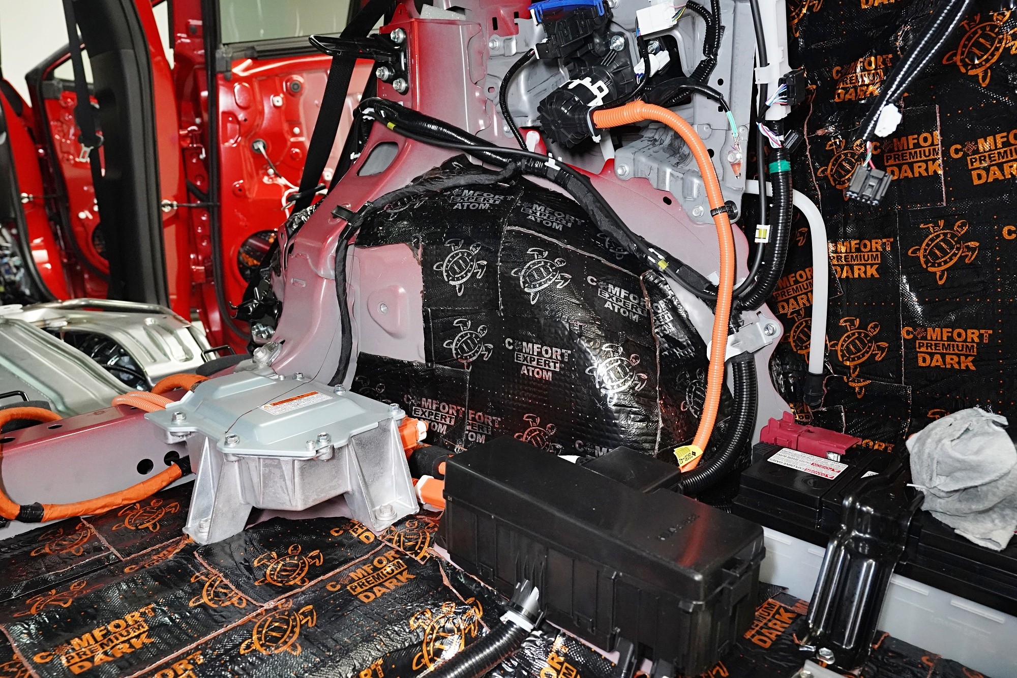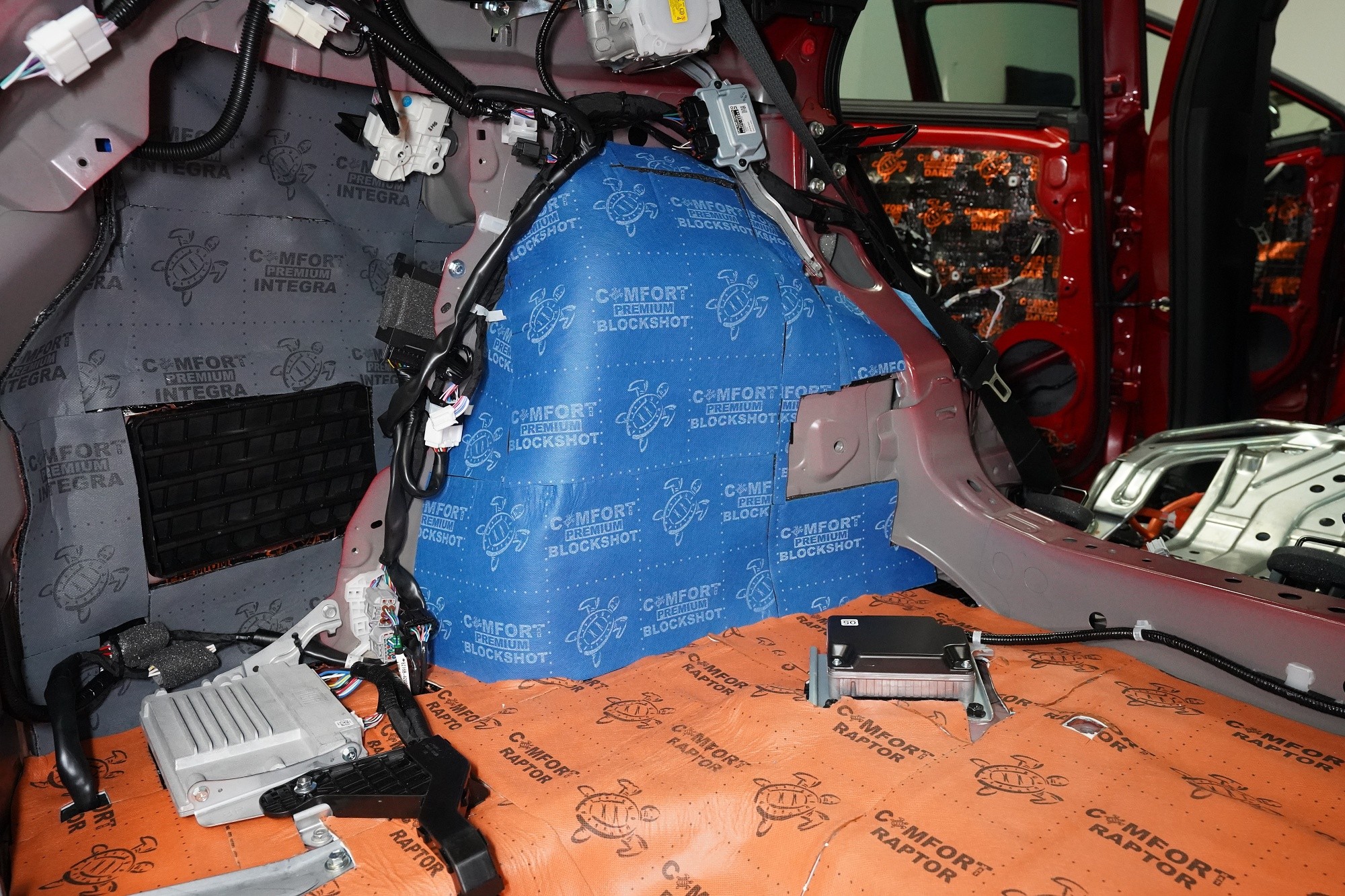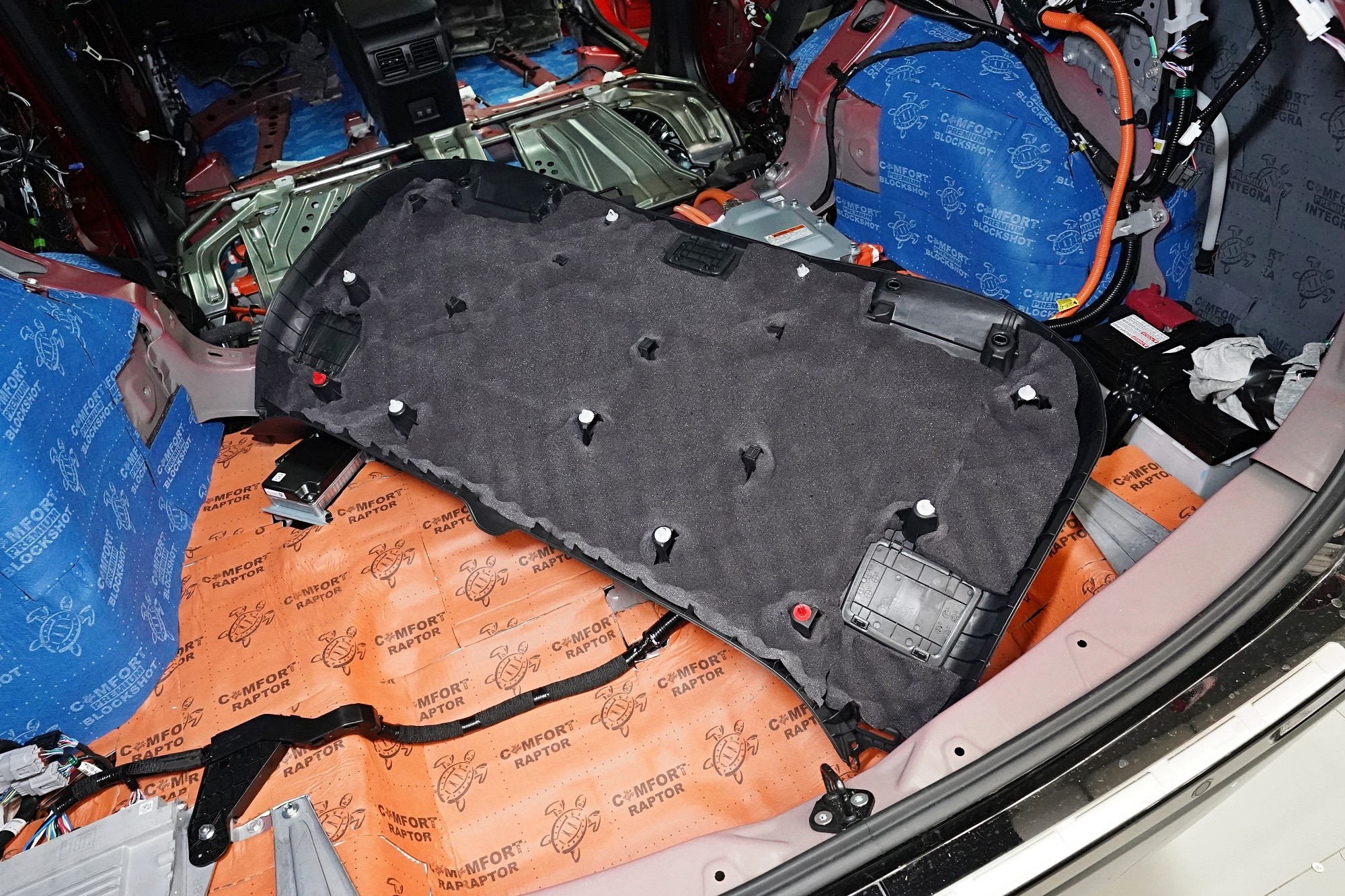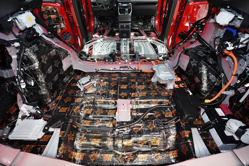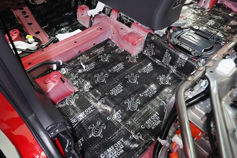 Začínáme podlahou, jejíž odhlučnění je kvůli enormním vibracím i výraznému nízkofrekvenčnímu hluku zásadní pro celkové odhlučnění vozu. Jako první vrstvu aplikujeme špičkový antivibrační materiál Comfortmat Atom z nejvyšší řady Expert, který je určený zejména pro profesionální instalační centra. Materiál je složený ze dvou vrstev s celkovou tloušťkou 4 mm a s akustickým ztrátovým činitelem (MLF) o extrémní hodnotě 0,60 jednotek. To umožní excelentní zamezení vibrací i výrazné snížení nízkofrekvenčního hluku.