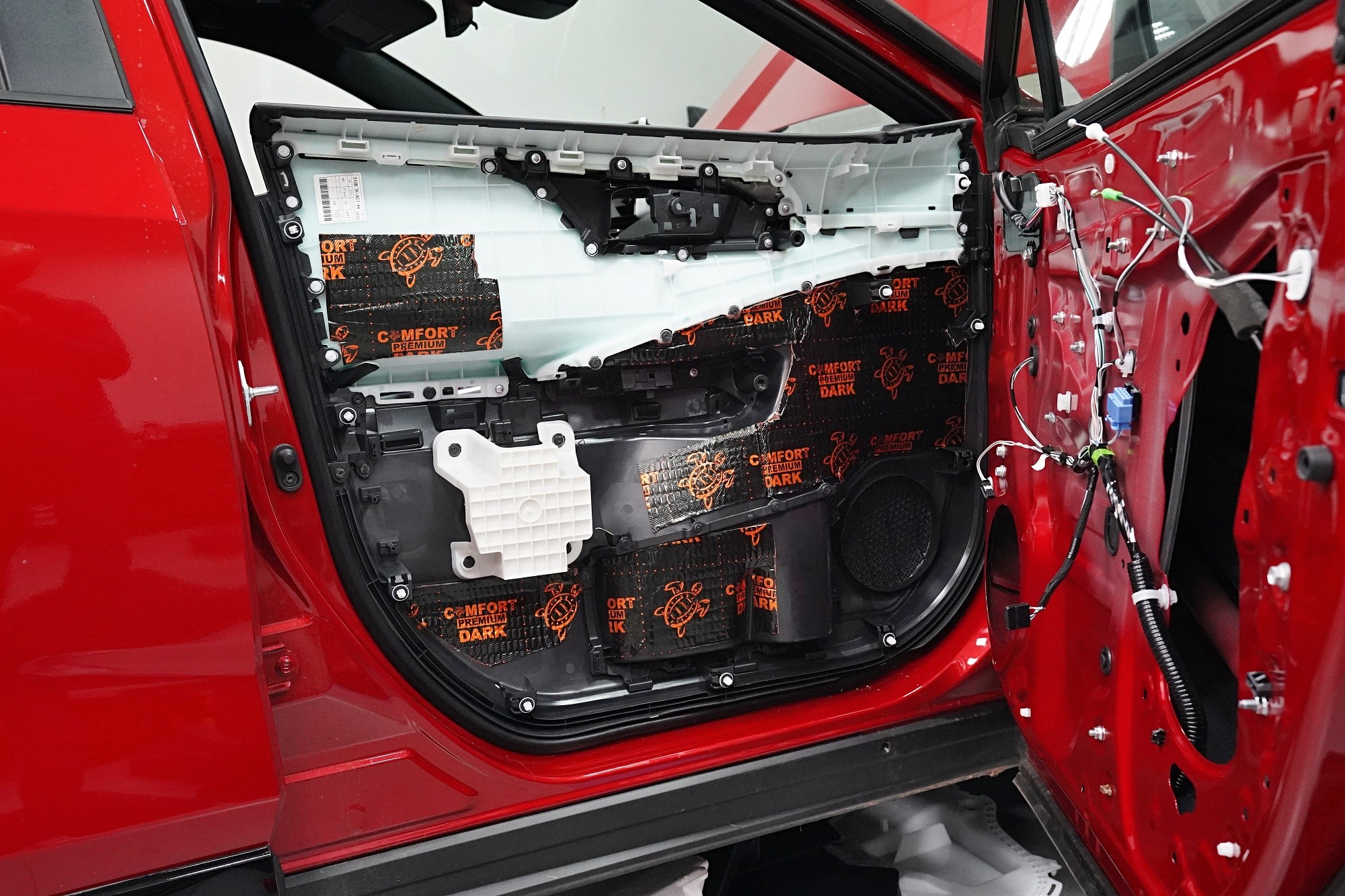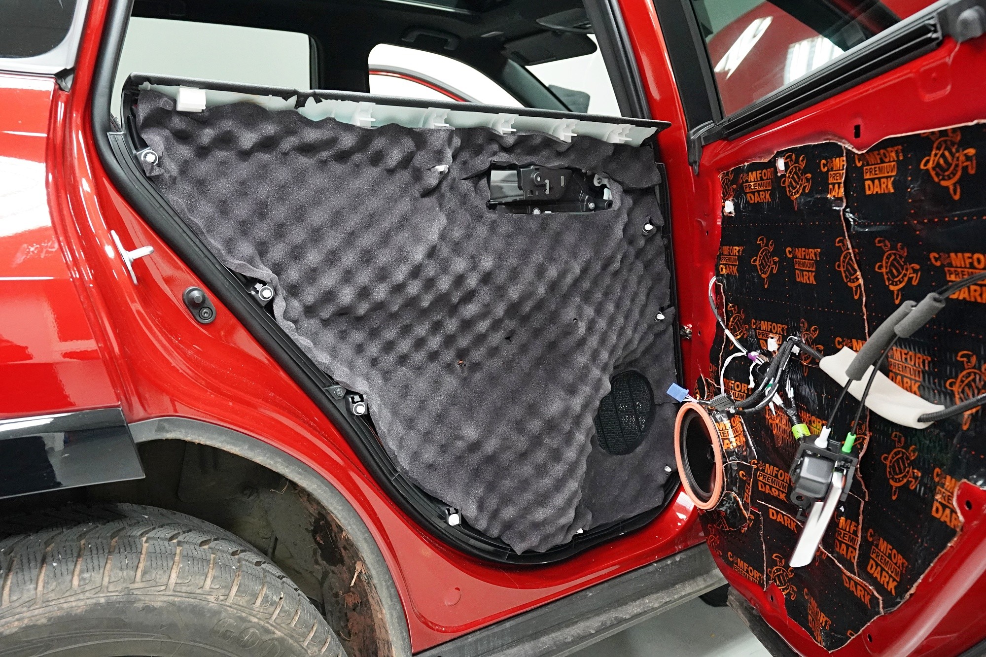 Dveře odhlučňujeme celkem v 5 vrstvách. Nejprve aplikujeme antivibrační materiál na vnější plech dveří, konkrétně Comfortmat Dark D2 o tloušťce 2,3 mm. Ten s přehledem zlikviduje vibrace, zamezí pronikání nízkofrekvenčního hluku a zpevní velmi tenký plech dveří. Materiál disponuje velmi nízkou hmotností, je samozřejmě voděodolný a má mimo jiné antikorozní vlastnosti.