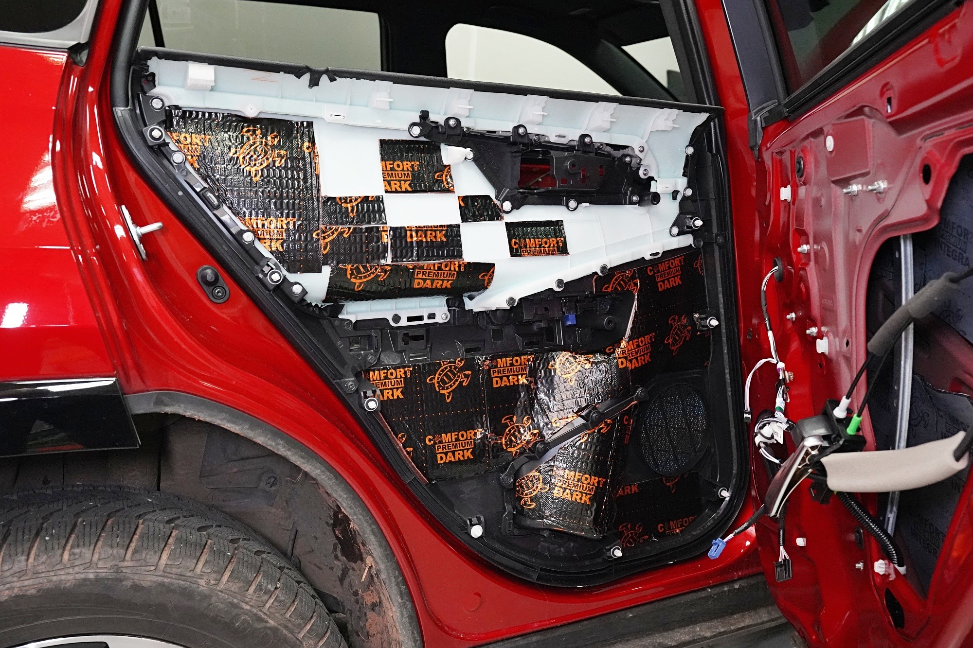 Zadní podběhy opatříme stejným zvukově izolačním materiálem, jaký jsme použili i na odhlučnění podlahy, konkrétně tedy membránovým materiálem Comfortmat Blockshot. Blockshot se vyznačuje při své tloušťce 7 mm vysokou schopností zvukové izolace až 32 dB, což je již velmi solidní hodnota pro odhlučnění této vibracemi i hlukem velmi zatížené oblasti. Nezapomínáme ani na blatníky, na které aplikujeme lehký membránový materiál Comfortmat Integra s účinností 28 dB a velmi nízkou hmotností. Tento materiál využíváme i při odhlučnění dveří.