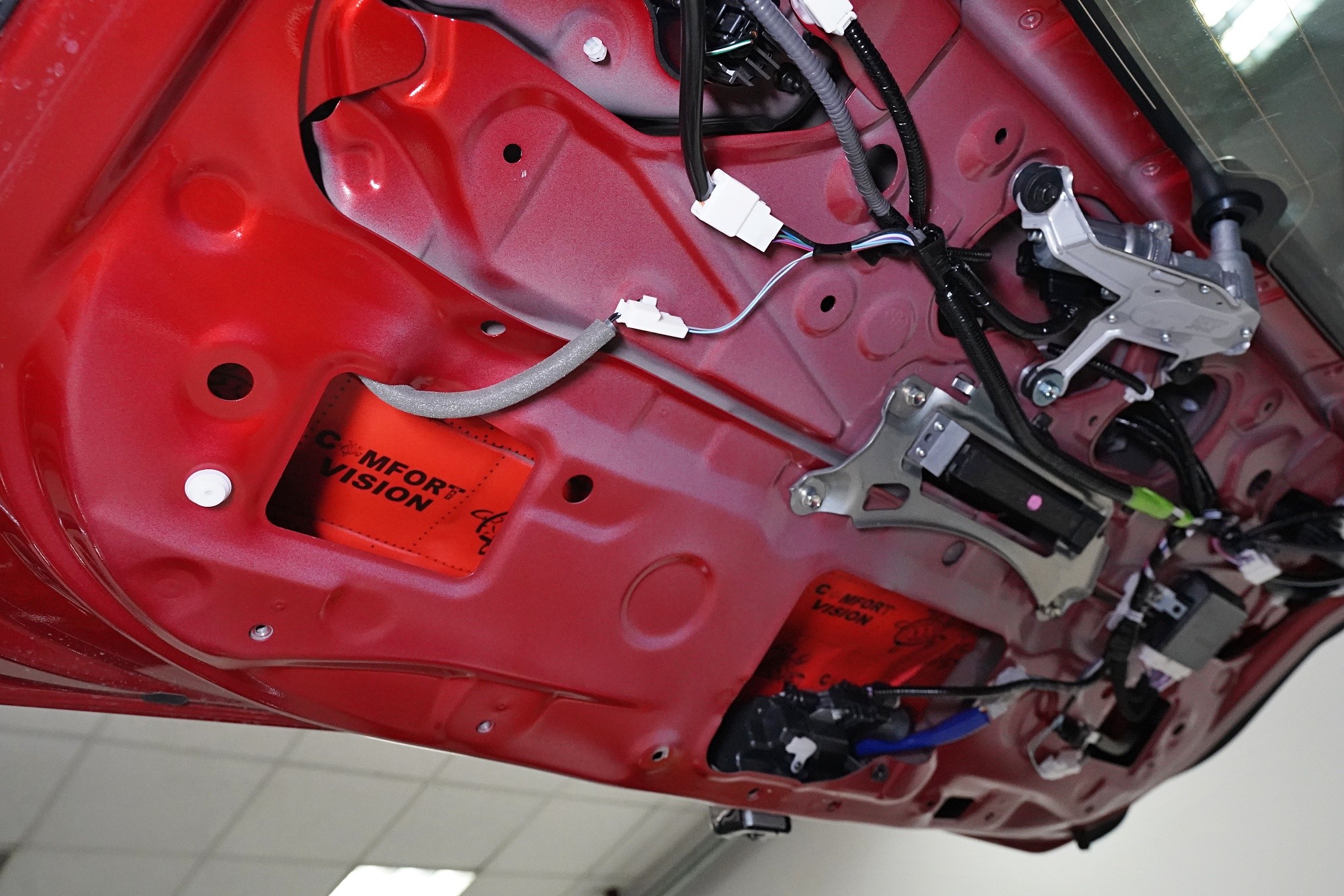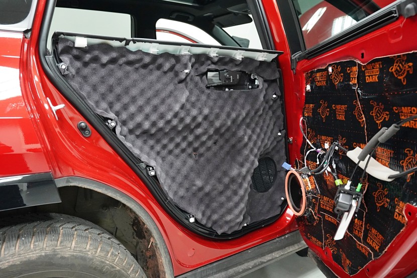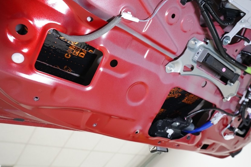 Čtvrtou vrstvou odhlučnění dveří je opět odlehčený antivibrační materiál Comfortmat D2, který aplikujeme bodově i na plastové výplně dveří. Tím plast zejména zpevníme a snížíme různé vibrace a zvuky, které by mohly v budoucnu znepříjemnit jízdu například při poslouchání hudby.