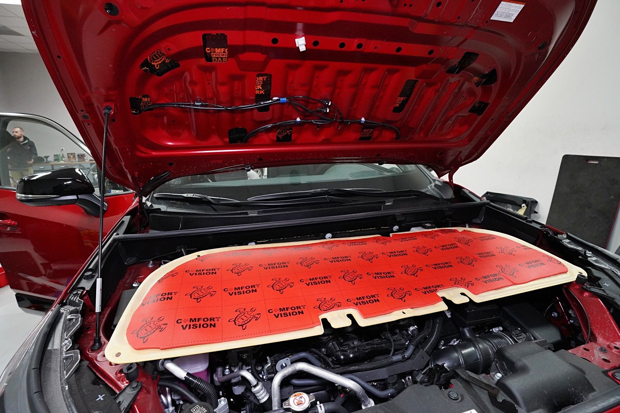 Nezapomínáme ani na kapotu, na kterou v první vrstvě aplikujeme opět lehký antivibrační materiál Comfortmat D2. Tím kapotu zpevníme, zamezíme vibracím, které se přenáší do dalších částí vozu a zmizí i typický plechový zvuk při zavření kapoty. Na originální kryt kapoty následně aplikujeme zvukově i tepelně izolační materiál Comfortmat Vision, který sníží hluk motoru a to při zachování původního vzhledu motorového prostoru. Tímto instalaci dokončujeme a brzy předáme vůz majiteli.