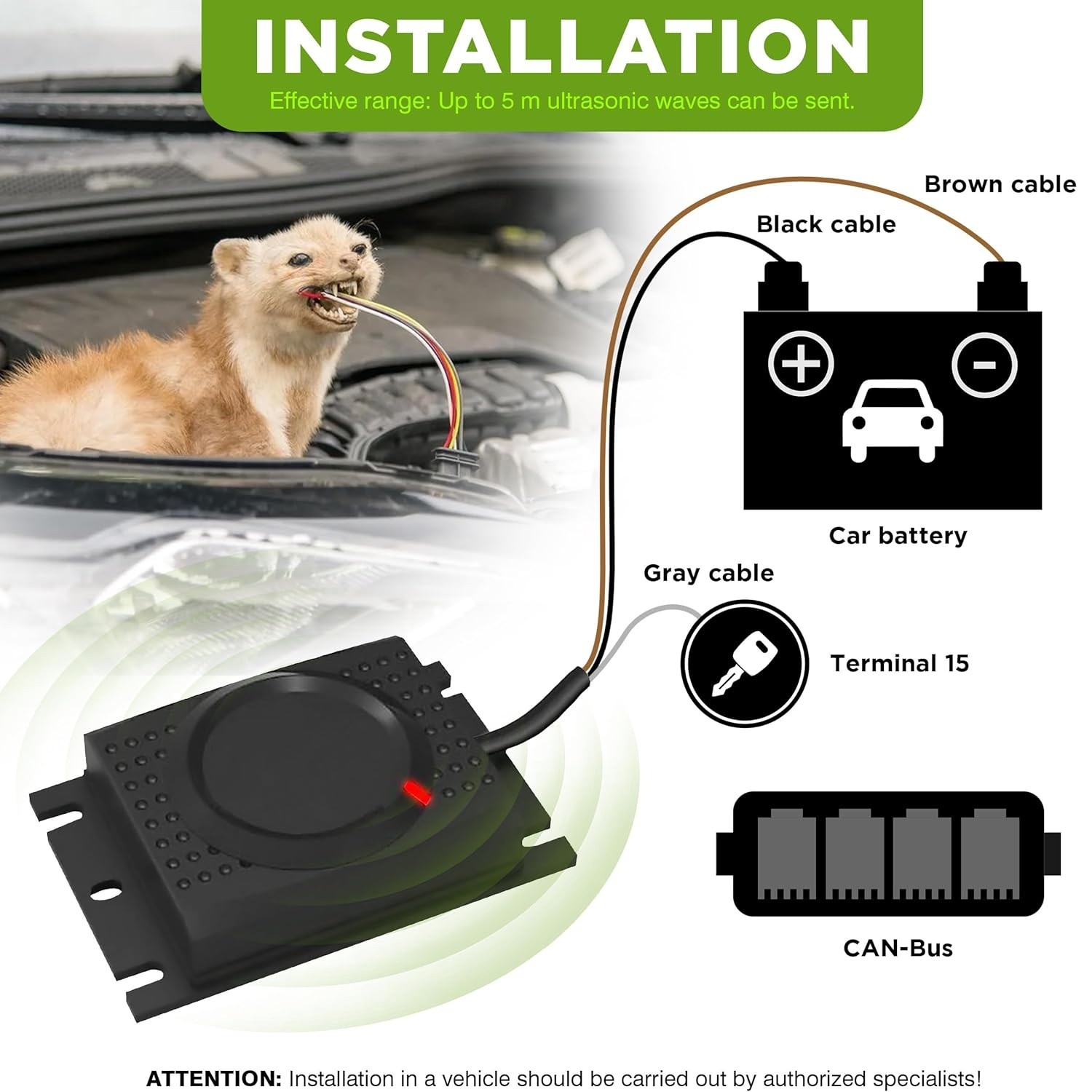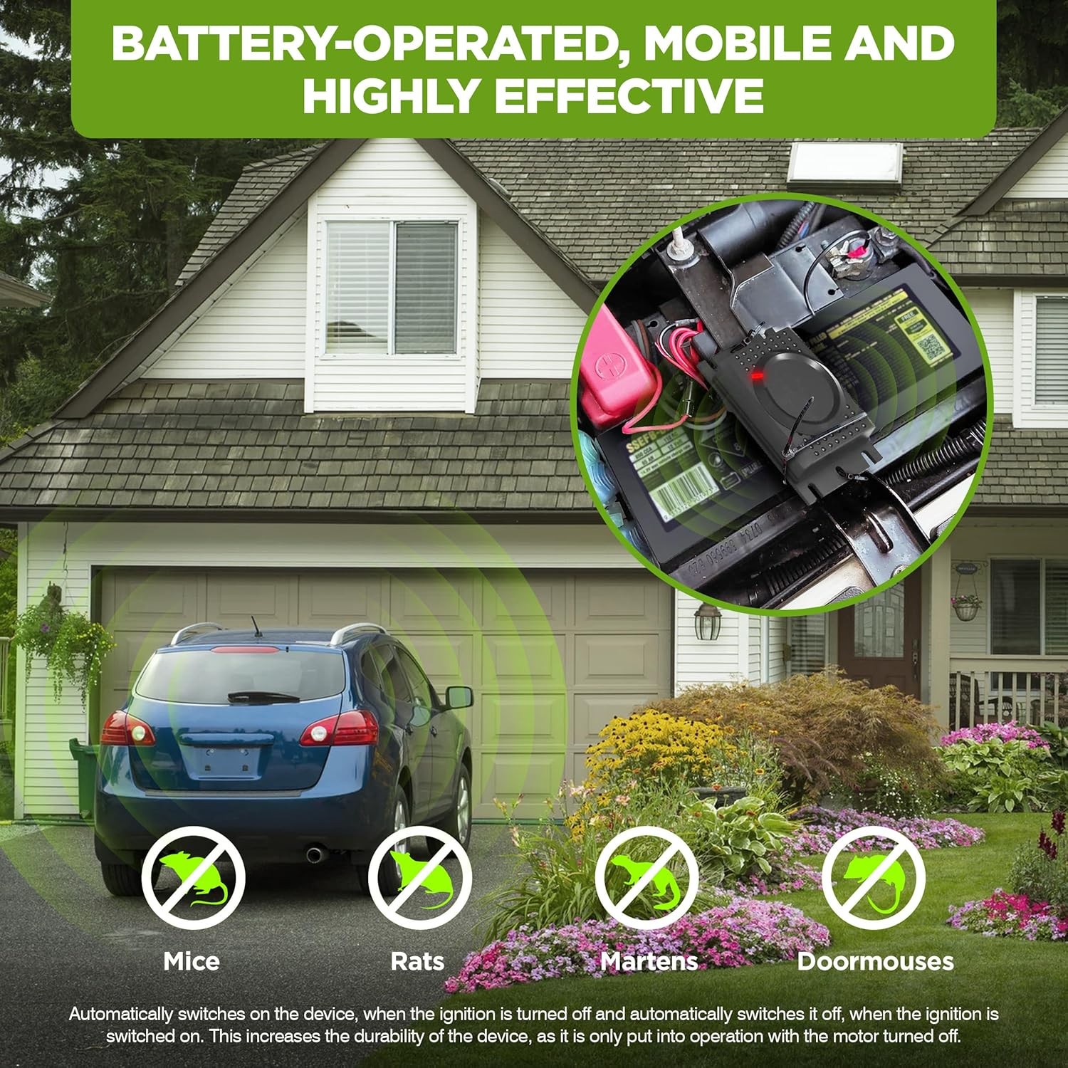 Odpuzovač hlodavců pro montáž do vozidel. Zařízení vydává krátké vysokofrekvenční zvuky v 15sekundových intervalech. M440 je ideální pro preventivní ochranu kabelů v motorovém prostoru vozidla. Zařízení je napájeno z 12V autobaterie a je třeba ho připojit na kontakt č.15, čímž se zajistí, že při nastartování se odpuzovač automaticky vypne. Integrovaná Q-technologie zaručuje konstantní intervalový režim a stabilní vyzařování.