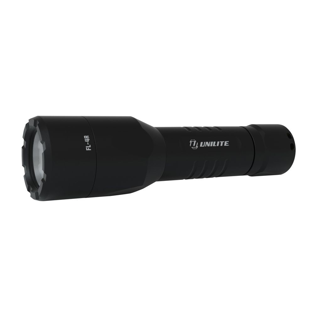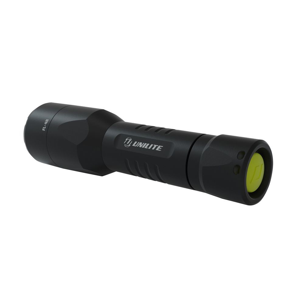 Unilite FL-4R je kompaktní, vysoce kvalitní LED svítilna, která využívá dobíjecí lithium-iontovou baterii a poskytuje maximální výkon 450 lumenů při vysokém nastavení. Vysoce výkonná LED Cree dioda vyzařuje bílé světlo, které nabízí tři úrovně jasu a režim blikání 8 Hz. Koncový spínač cykluje jednotlivými režimy v pořadí nízký, střední, vysoký a stroboskop s každým stiskem. Přiložená lithium-iontová baterie 14500 800 mAh se uvnitř nabíjí pomocí přiloženého kabelu micro USB. Jednoduše otevřete gumový protiprachový kryt na hlavě svítilny a vložíte konec micro USB kabelu, poté jej zapojíte přímo do USB portu počítače nebo do USB síťového / automobilového adaptéru. Během nabíjení se zobrazí červená LED a po dokončení nabíjení (přibližně po 2 hodinách) se LED indikátor rozsvítí zeleně. LED Indikátor také zobrazením červeného světla ukazuje stav baterie při dosáhnutí středního výkonu, a poté blikáním červeně, když baterie dosáhne nízkého výkonu a potřebuje nabít. Pogumovaný mikro koncový spínač a protiprachový kryt USB jsou neonově žluté, takže svítilnu lze snáze spatřit ve tmě. Součástí je šňůrka na zápěstí, která ji bezpečně udrží na zápěstí v případě pádu. FL-4R je perfektní světlo pro kempování, procházky se psem atd., nebo uložení v tašce (přiložené pouzdro a šňůrka zajišťující bezproblémové přenášení této svítilny).