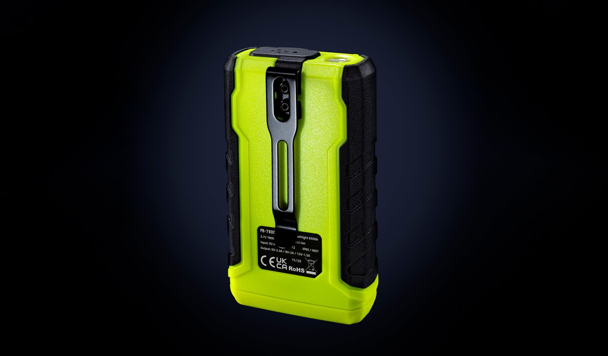 PB-7800 je šikovná 250 lumenová SMD LED svítilna s vysokokapacitní 7800mAh li-ion power bankou. Má tělo z pevného nylonu a TPR. Plně odolný obal proti povětrnostním vlivům, má odolnost proti prachu a vodě IP65, odolnost proti nárazu IK07 a odolnost proti pádu z výšky 2 m. Jeho adaptivní baterie má více výstupů 5V 2,4A / 9V 2A / 12V 1,5A a také ochranu proti přebití, přetížení, hlubokému vybití a zkratu. Silná magnetická základna a robustní kapesní klip zajišťují maximální možnosti použití.