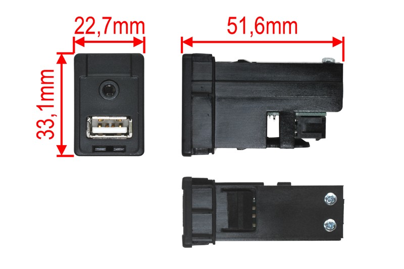 - Adaptér pro připojení USB a AUX signálu nahrazuje původní konektor v automobilu při použití aftermarket (dodatečně) instalovaného autorádia s výstupem USB + CINCH konektor.