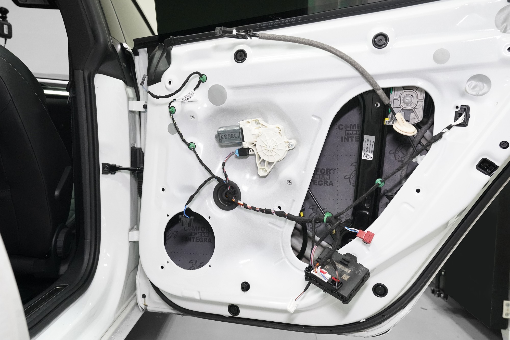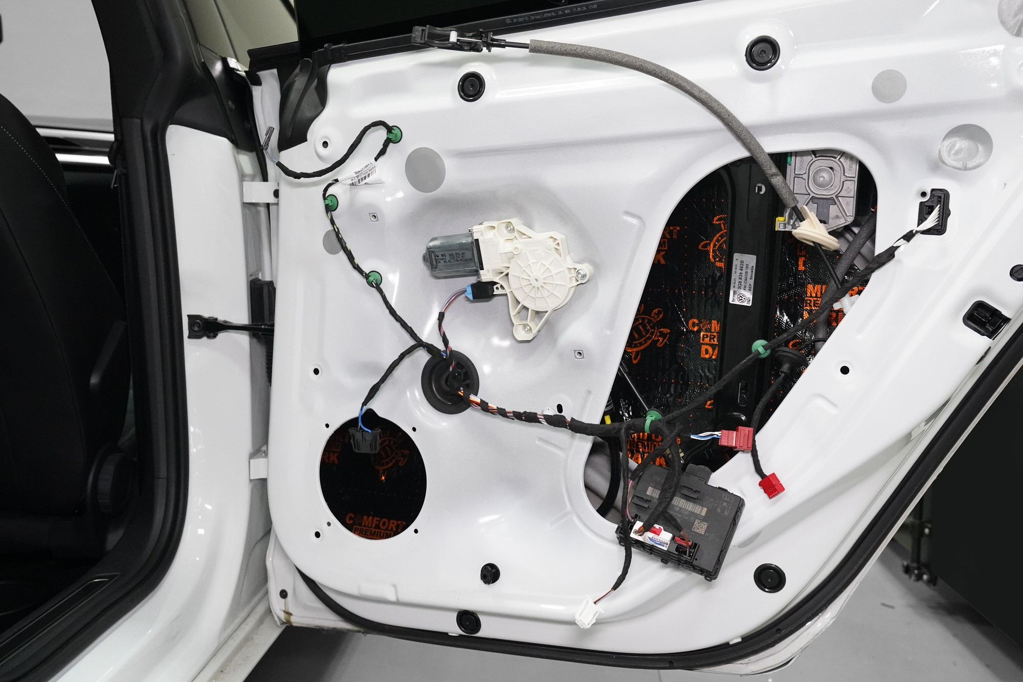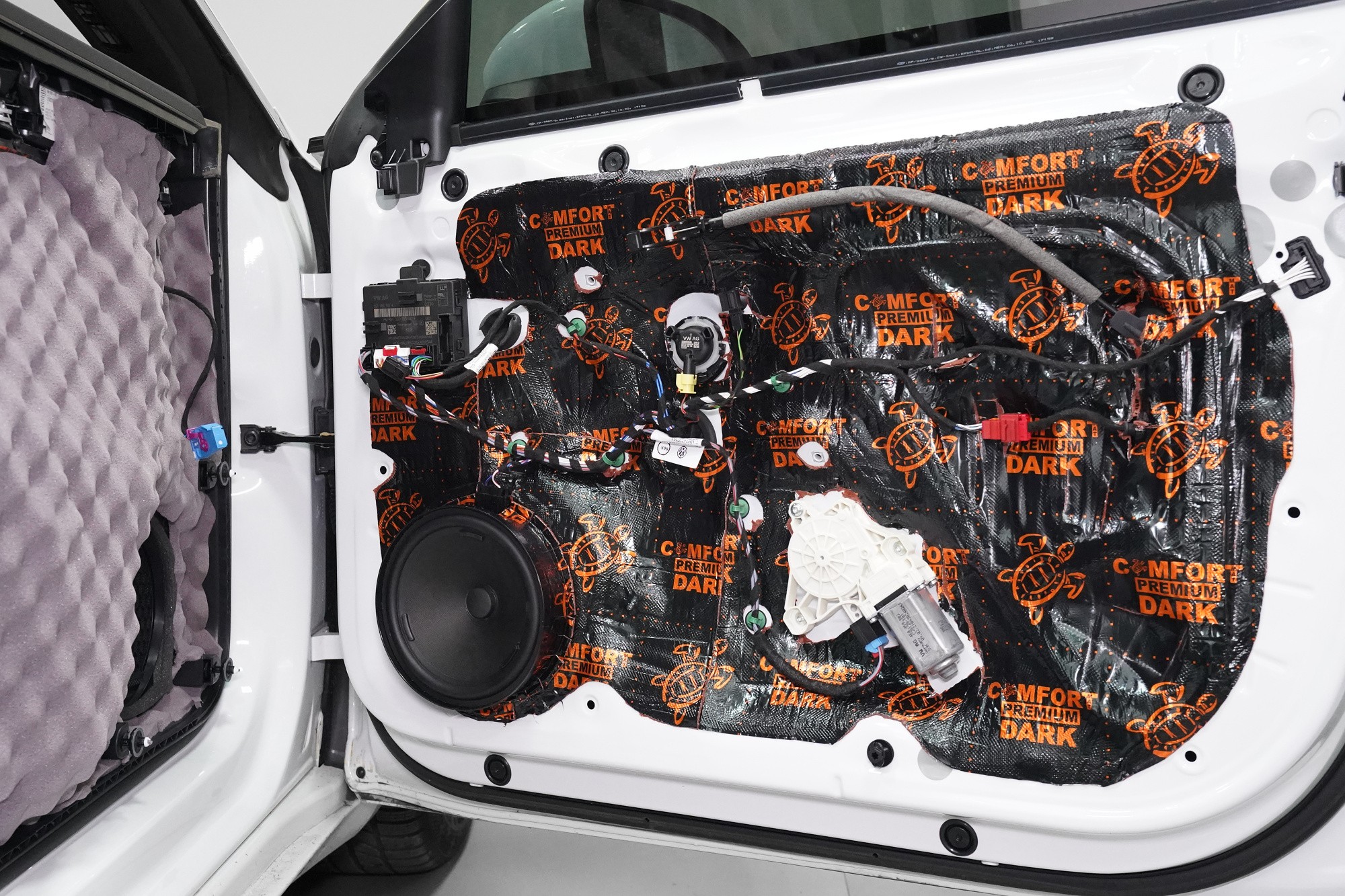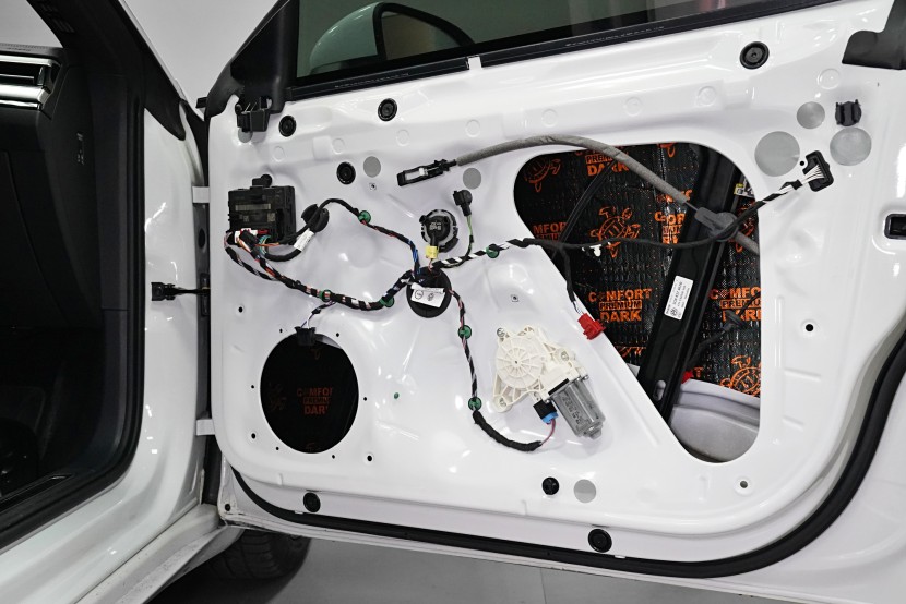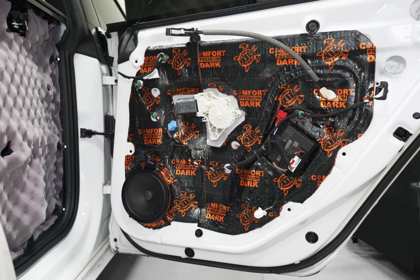 Následně aplikujeme opět odlehčený antivibrační materiál Comfortmat z prémiové řady Dark. Tato vrstva slouží k zamezení vibrací a rezonancí vnitřního plechu dveří a u většiny vozidel i k vytvoření uzavřené ozvučnice pro reproduktory, což má za následek zlepšení ozvučení. Zejména basová složka středobasového reproduktoru dozná podstatného zlepšení, což oceníte nejen u továrních reproduktorů.