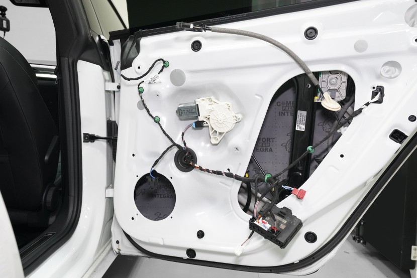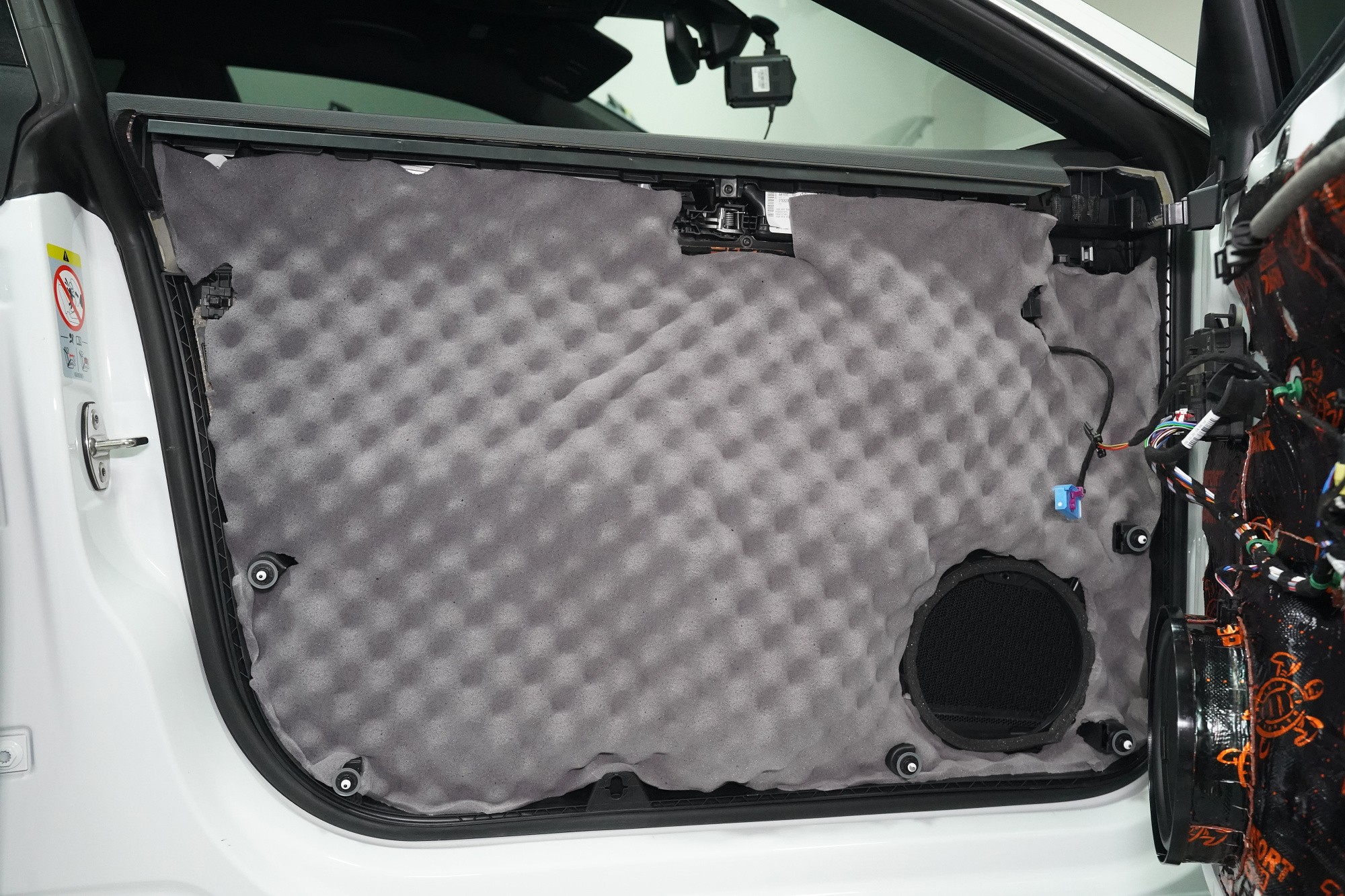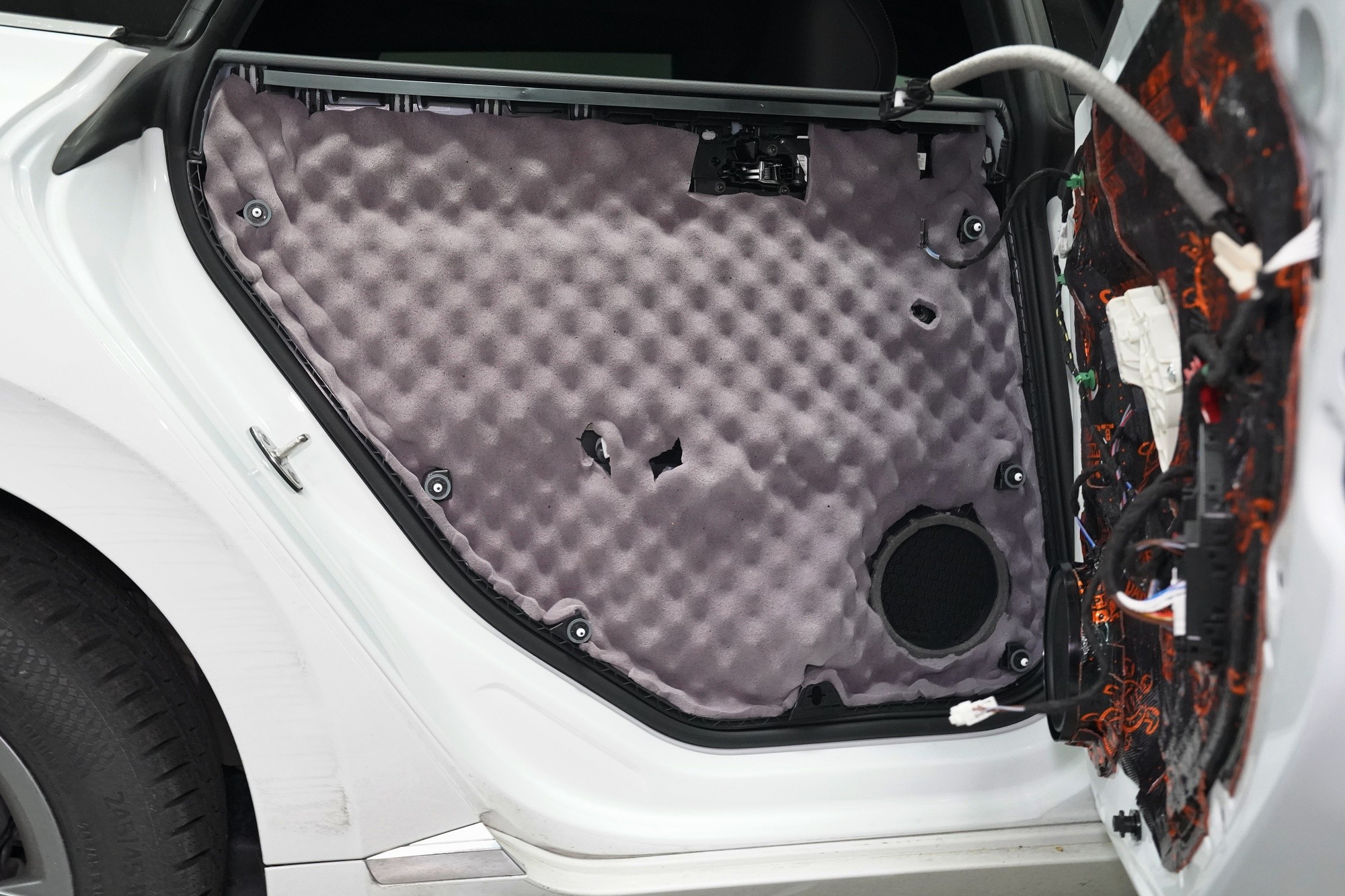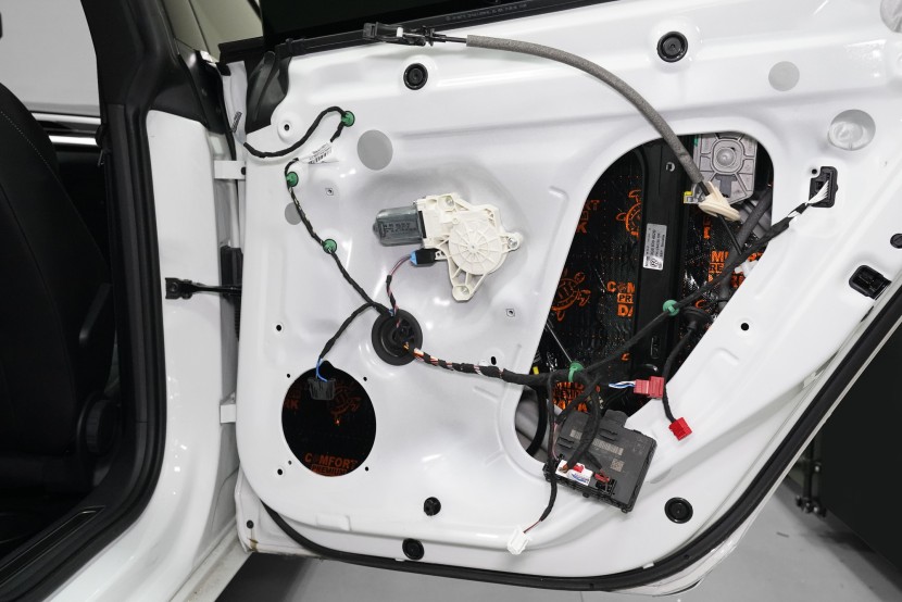 Finálně nalepíme na plastové obložení dveří Comfortmat Softwave o tloušťce 15 mm. Tato flexibilní pěna s tvarovou pamětí se lepí na plastové čalounění dveří z důvodu zamezení skřípání a vrzání nejen plastů, ale i drátů a dalších komponent uvnitř dveří a dodatečně i sníží hluk této oblasti. Pod materiálem Soft Wave je ještě bodově nalepena čtvrtá vrstva v podobě antivibračního materiálu Comfortmat D2, který aplikujeme i na plastové výplně dveří. Tím plast zpevníme a snížíme různé vibrace a zvuky, které by mohly v budoucnu znepříjemnit jízdu například při poslouchání hudby. Stejný postup opakujeme i u zadních dveří.