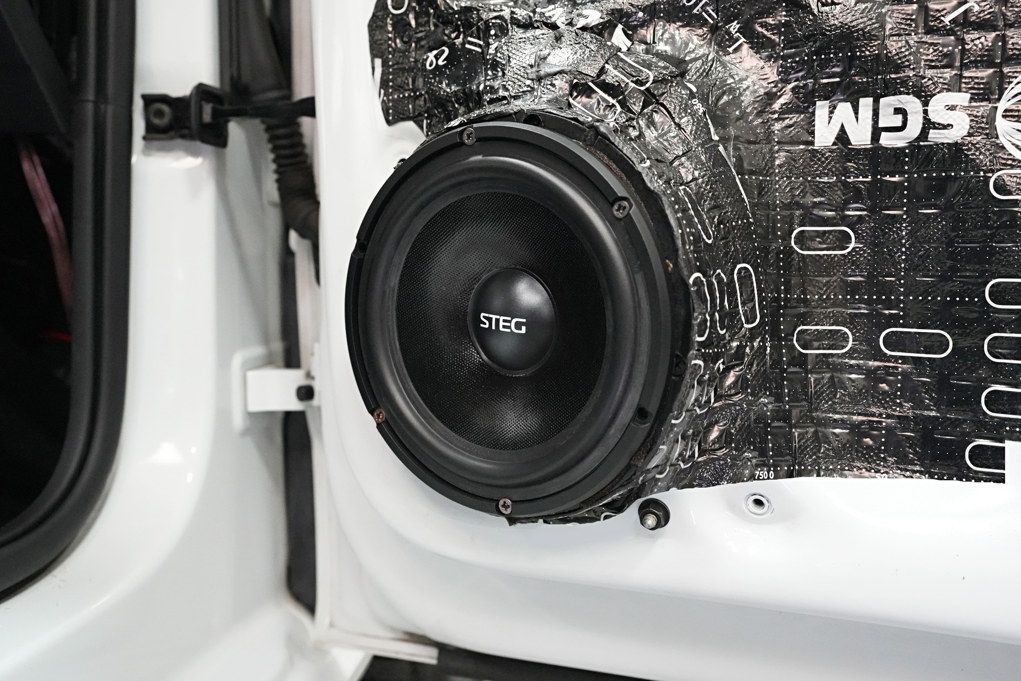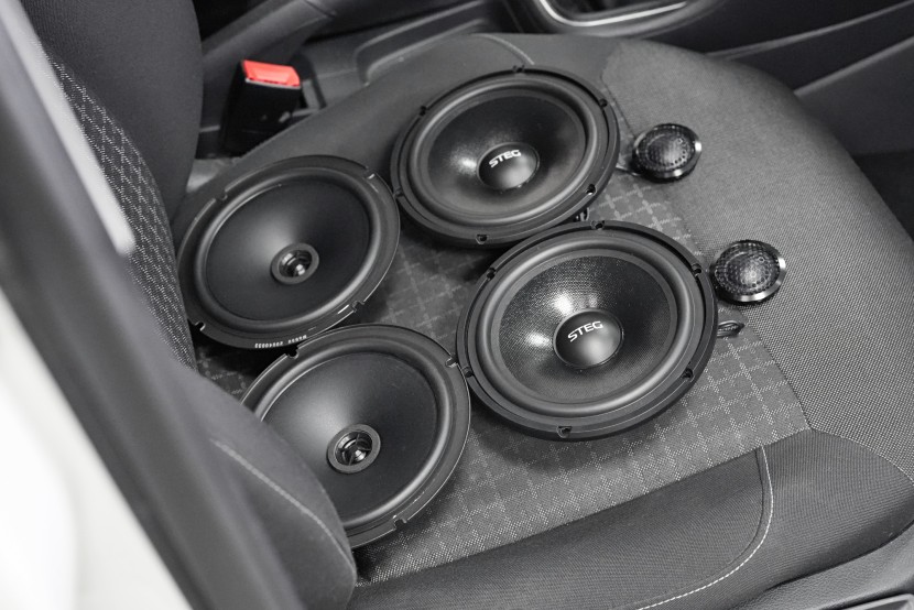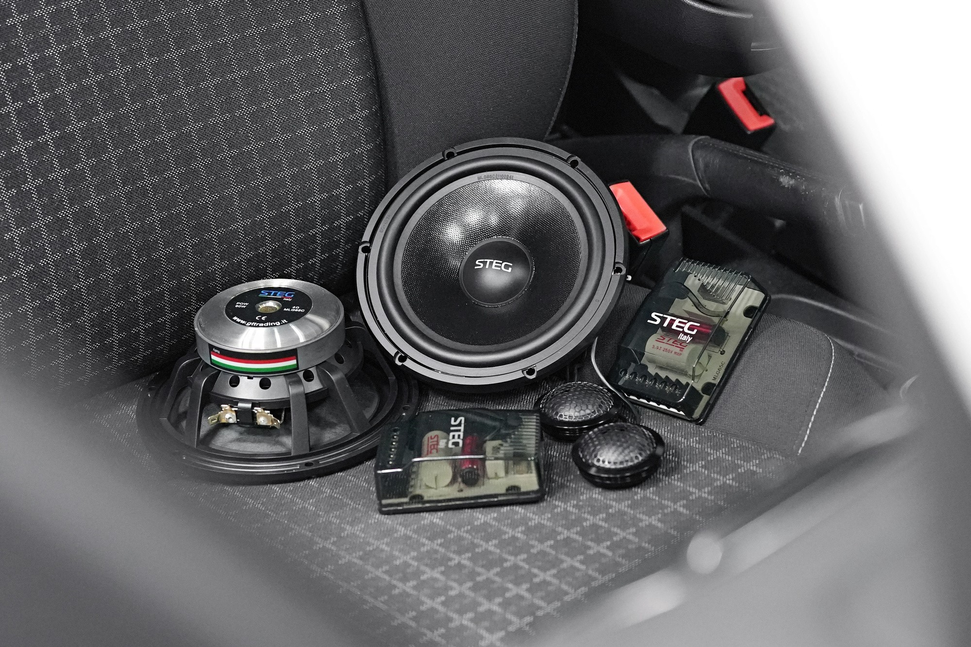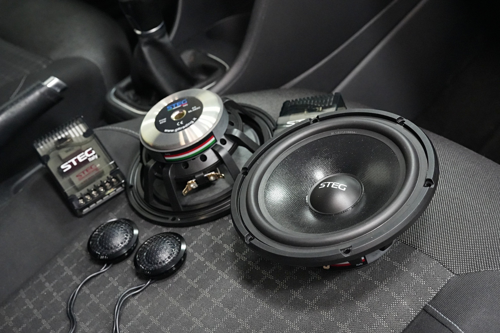 Když jsme hledali ideální komponentní reproduktory pro ozvučení tohoto vozu, které by měly splňovat hned několik parametrů, jako je kvalitní zvuk, optimální výkon a citlivost a zároveň cenu okolo 4 tisíc Kč, vybrali jsme reproduktory Steg MLG 65C, které všechny uvedené požadavky splňují. Vzhledem k danému rozpočtu i požadavku na výměnu zadních reproduktorů jsme se rozhodli pro pasivní zapojení s využitím frekvenčních výhybek.