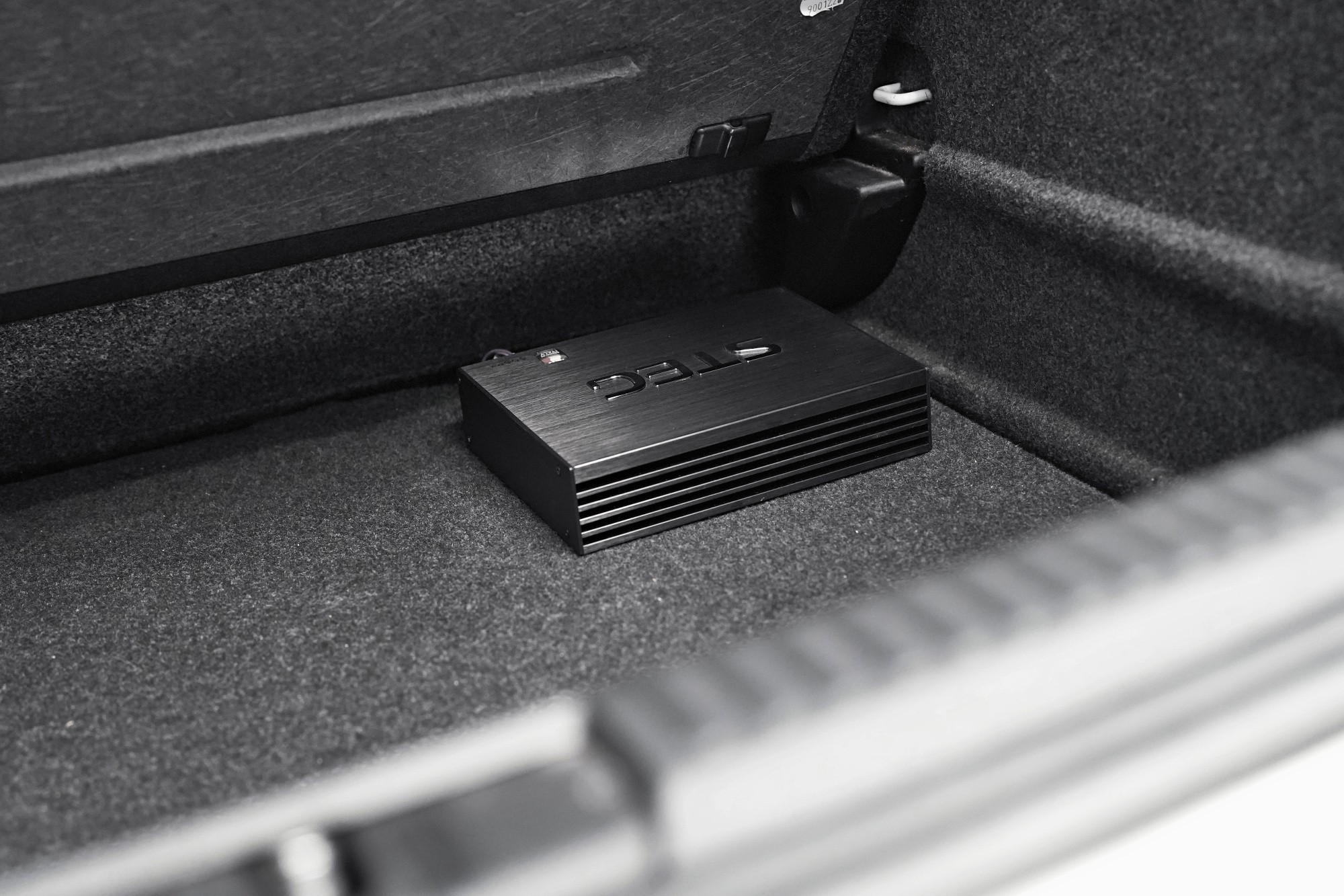 Volkswagen Polo nemá zrovna příliš místa pro instalaci zesilovače, protože pod sedačkami jsou úložné prostory a v bočnicích kufru také téměř žádný prostor není. Naštěstí konstruktéři VW vymysleli dvojité dono zavazadlového prostoru, kam šel zesilovač s přehledem umístit a vzhledem ke svým kompaktním rozměrům nezabral ani moc místa.