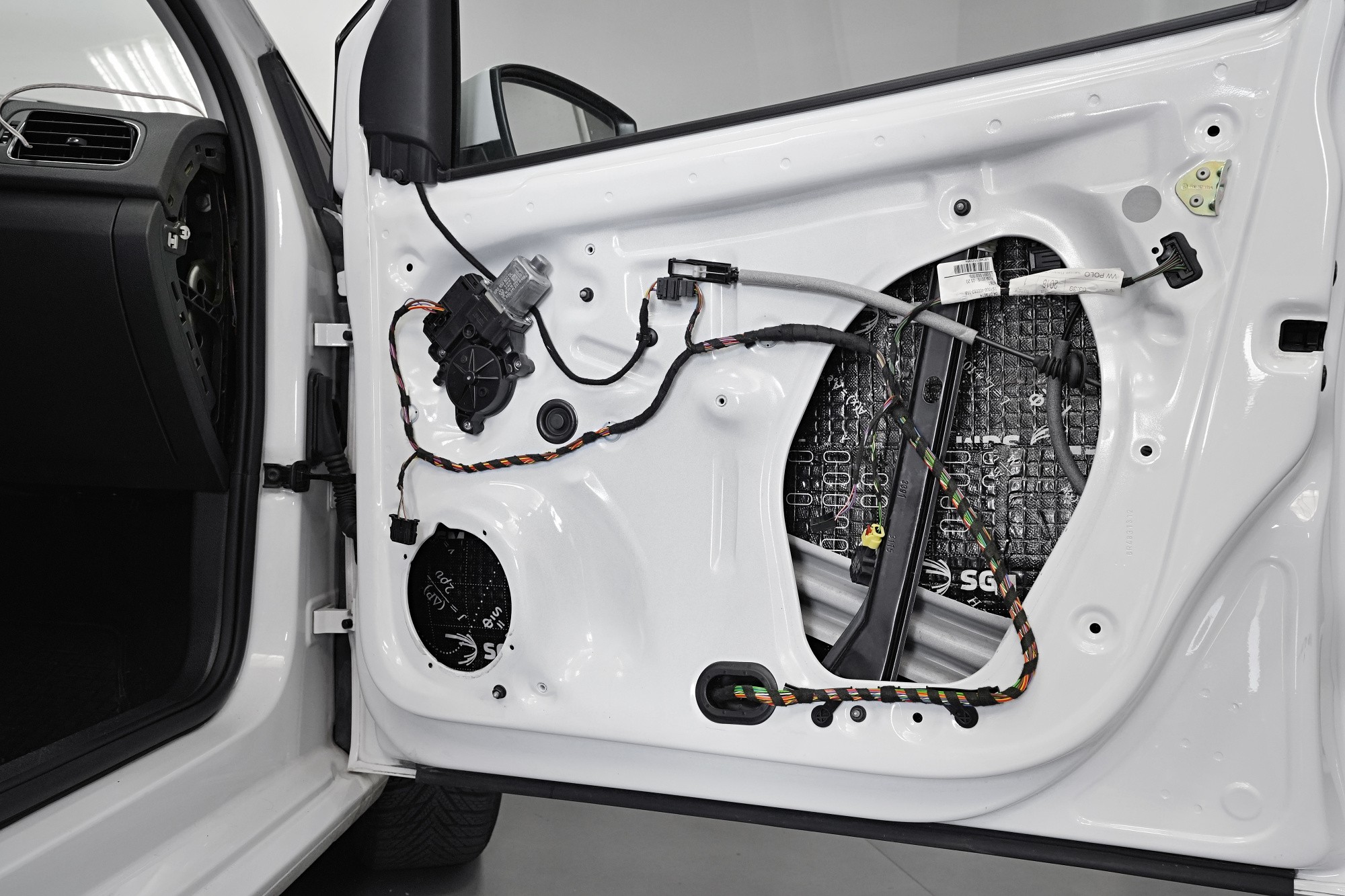 Pokračujeme tlumením dveří a volíme opět antivibrační materiál SGM Beta 2, který aplikujeme bodově i na plastové výplně dveří. Tím plast zejména zpevníme a snížíme různé vibrace a zvuky, které by mohly v budoucnu znepříjemnit jízdu například při poslouchání hudby.