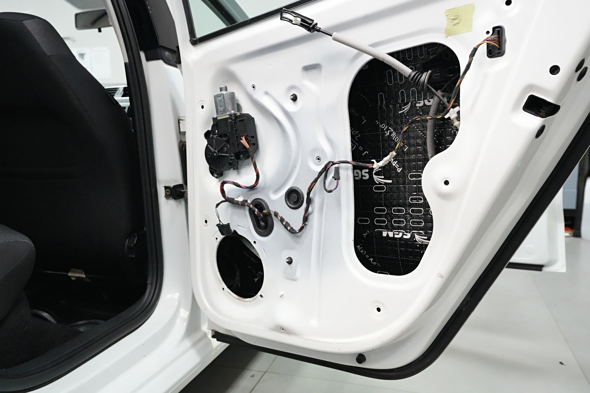 Ozvučení vozu VW Polo páté generace včetně měření frekvenční odezvy reproduktorů s následným nastavením programu DSP procesoru. Majitelka tohoto vozu nás oslovila s požadavkem výrazného zkvalitnění továrního ozvučení a zvýšení výkonu. Vzhledem k poslechu náročnější klasické a operní hudby i italských interpretů z 80. let bylo nezbytné zvolit odpovídající řešení a přihlédnout k finančnímu limitu, který se měl pohybovat okolo 30 tisíc Kč. Po důkladné analýze jsme se rozhodli pro pokročilé ozvučení od italského výrobce Steg, které zahrnuje zesilovač s DSP procesorem, komponentní reproduktory do přední dveří a koaxiální do zadních. Součástí instalace bylo samozřejmě i důkladné vytlumení dveří antivibračními materiály SGM. Na závěr přišel čas i na měření a detailní nastavení zvuku na DSP procesoru. Pomocí kalibrovaného mikrofonu jsme změřili všechny nedostatky a překážky daného vozu a nastavili prostorovou korekci ekvalizéru pro všechny reproduktor ve voze. Následně jsme nastavili časové korekce, úrovně, pásmové propusti a další možnosti, které nám umožní DSP procesor. Cílem této instalace bylo dosáhnout vysoce kvalitního zvuku bez zkreslení ve vyšších hlasitostech a zároveň maximálního využití potenciálu reproduktorů a přizpůsobení zvuku nejen pozici řidiče, ale i danému vozu. A to za přijatelnou cenu, což se nám vše do posledního puntíku povedlo. A to bylo i záměrem této instalace - ukázat, že využití DSP procesoru má význam i v případě instalace levnějších komponentů. Díky důkladnému nastavení a především ekvalizaci na základě měření frekvenční odezvy reproduktorů se změní jejich zvuk k nepoznání, než kdybychom reproduktory zapojili pouze na samotný zesilovač nebo autorádio.