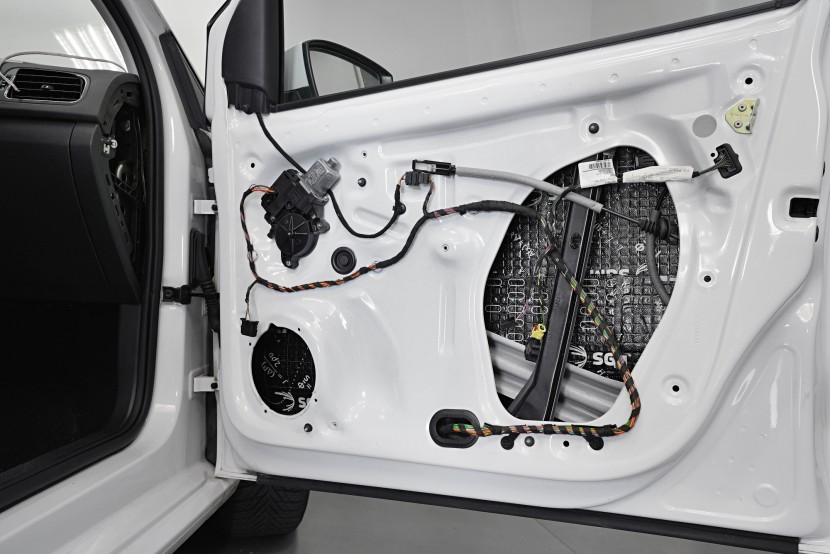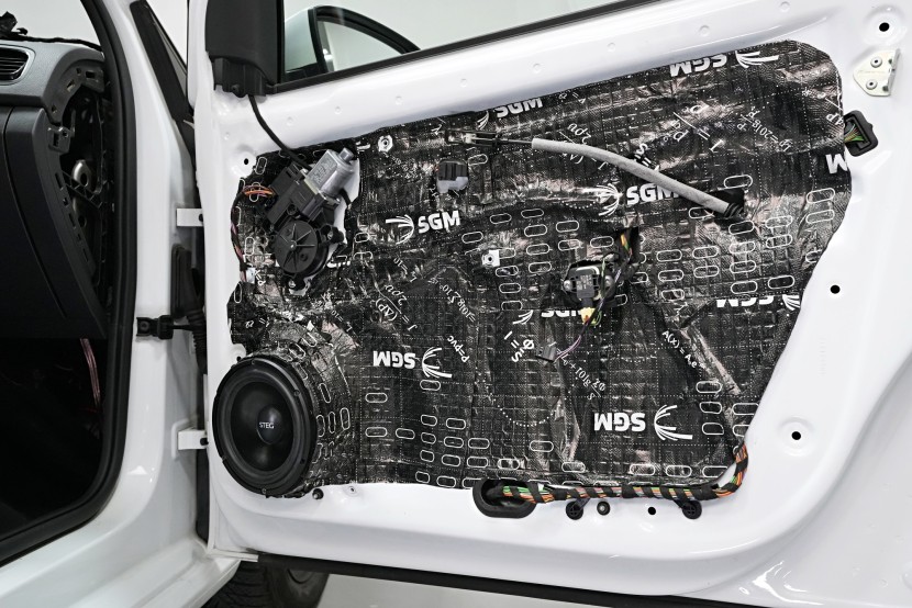 Pokračujeme tedy instalací reproduktorů. Dveře je nejprve nezbytné důkladně vytlumit. Nejprve aplikujeme antivibrační materiál na vnější plech dveří, konkrétně SGM Beta 2 o tloušťce 2 mm. Ten pohltí vibrace této oblasti a zpevní velmi tenký plech dveří. Materiál je samozřejmě voděodolný a má mimo jiné antikorozní vlastnosti.