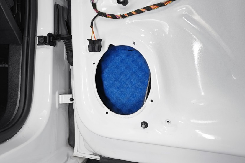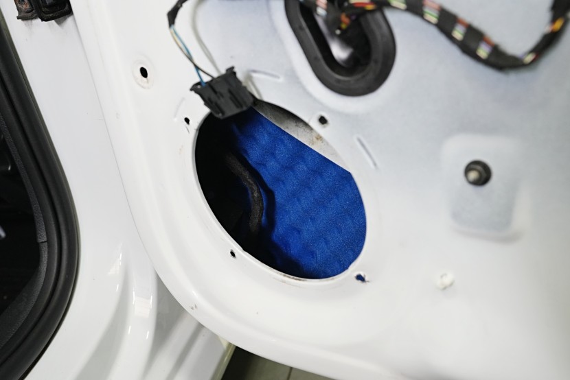 Pouze za reproduktor následně lepíme materiál Comfortmat Tsunami, který má jednu velmi zajímavou funkci a to absorpci stojatého vlnění za středobasovým reproduktorem. Díky tomu se zvuk neodráží od plechu dveří, ale je pohlcen materiálem, což samozřejmě vede ke zlepšení zvuku. I Comfortmat Tsunami je zcela voděodolný, nenasává vlhkost a díky extrémně přilnavé vrstvě nehrozí jeho odlepení.